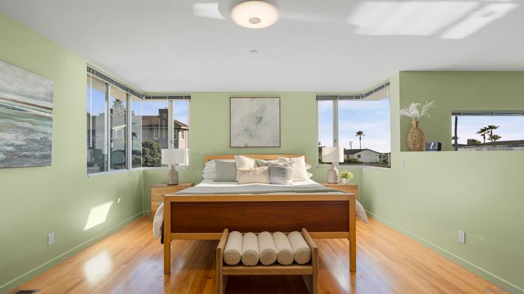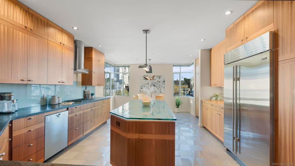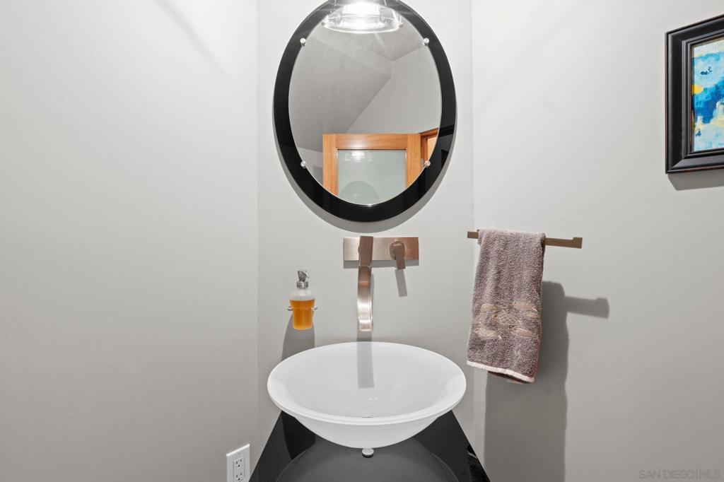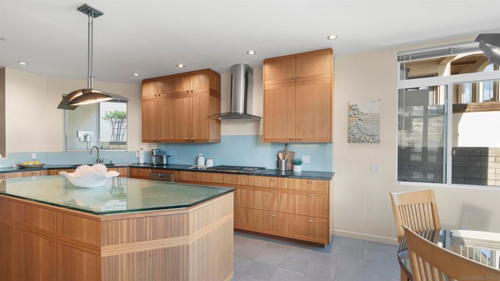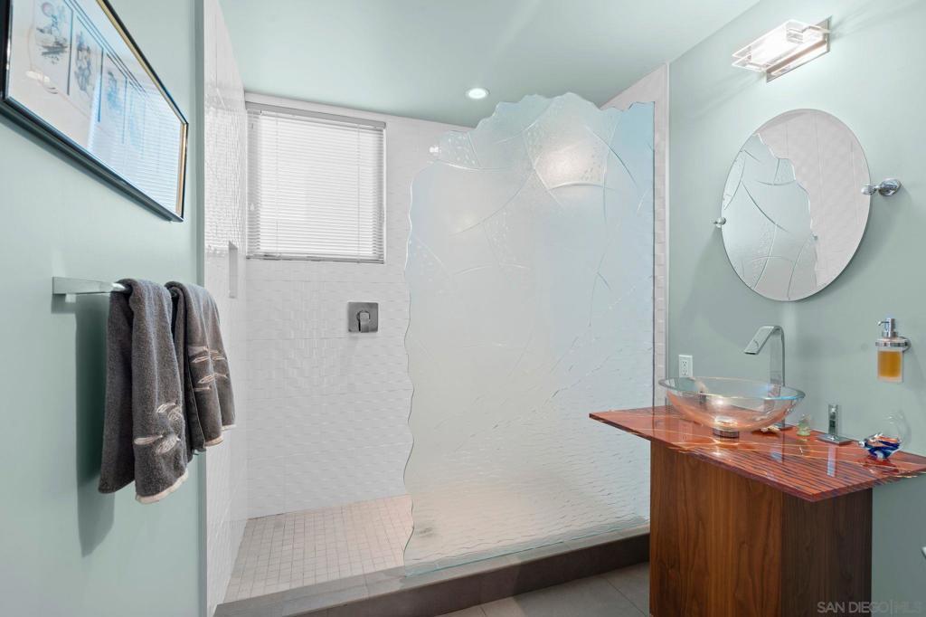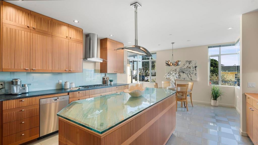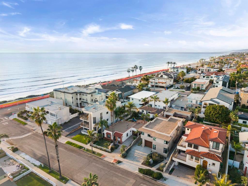 Just steps from the sand this ocean-view coastal retreat delivers the best of Carlsbad living—morning walks to the beach, salty breezes on the patio, and sunset views that never get old. Designed for effortless, elevated living, the home pairs privacy and “lock-and-leave” convenience with true luxury craftsmanship: Fleetwood windows and doors, porcelain tile throughout, an in-home Garaventa Lift elevator, clean effortless finishes offer a warm, modern tone. The home is 3158 square feet, 3 bedrooms 2 full, 2 half baths. The 3rd bedroom, 1/2 bath is detached with a garage, could be private office, playroom or art studio. At the heart of the home, a chef’s kitchen shines with Wolf appliances (steam oven, oven, 5-burner cooktop), Sub-Zero refrigeration, and a Miele dishwasher—anchored by a heat-tolerant soapstone countertop and a showstopping cast-glass island inspired by the beach itself. Custom, locally made cabinetry is featured throughout (kitchen, baths, and laundry), adding a level of detail you can feel in every room. Unwind in spa-caliber baths with designer fixtures, Toto toilets, a freestanding soaking tub, and custom cast-glass shower enclosures. Practical upgrades include an on-demand water heater with timed recirculation and a Tesla charger. Outside, the property features drought-tolerant landscaping designed to thrive without irrigation—perfect for coastal ease with low maintenance.