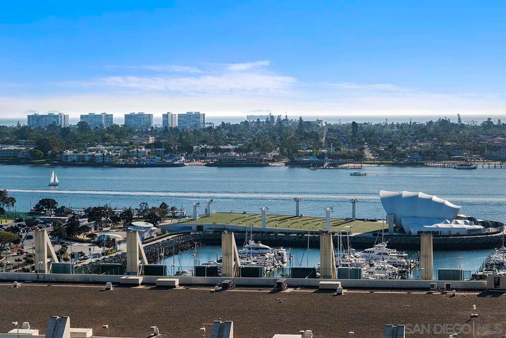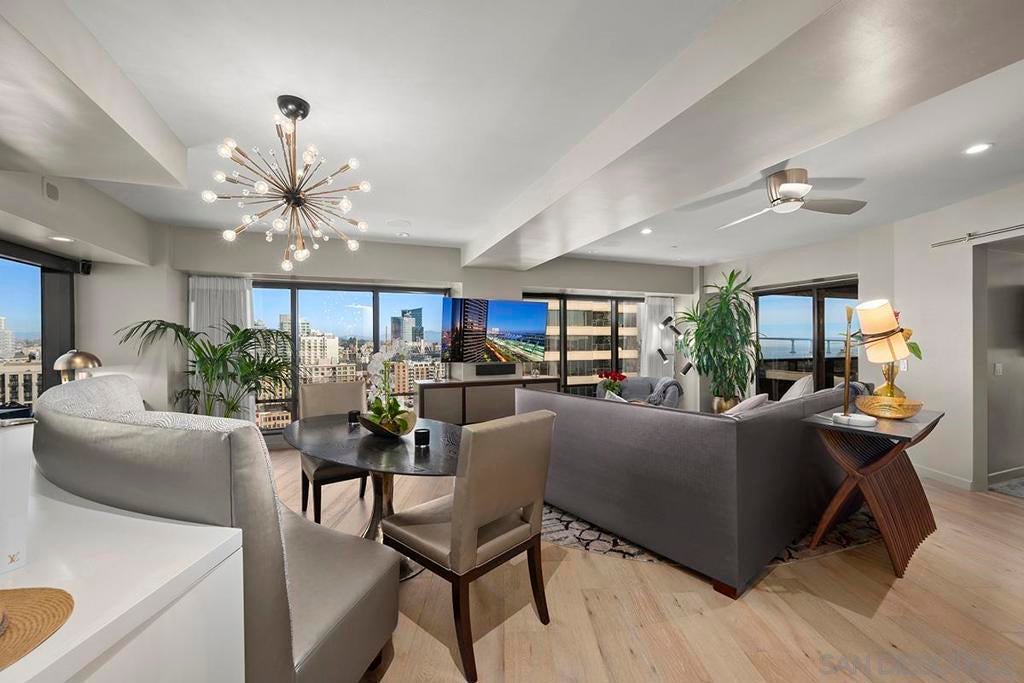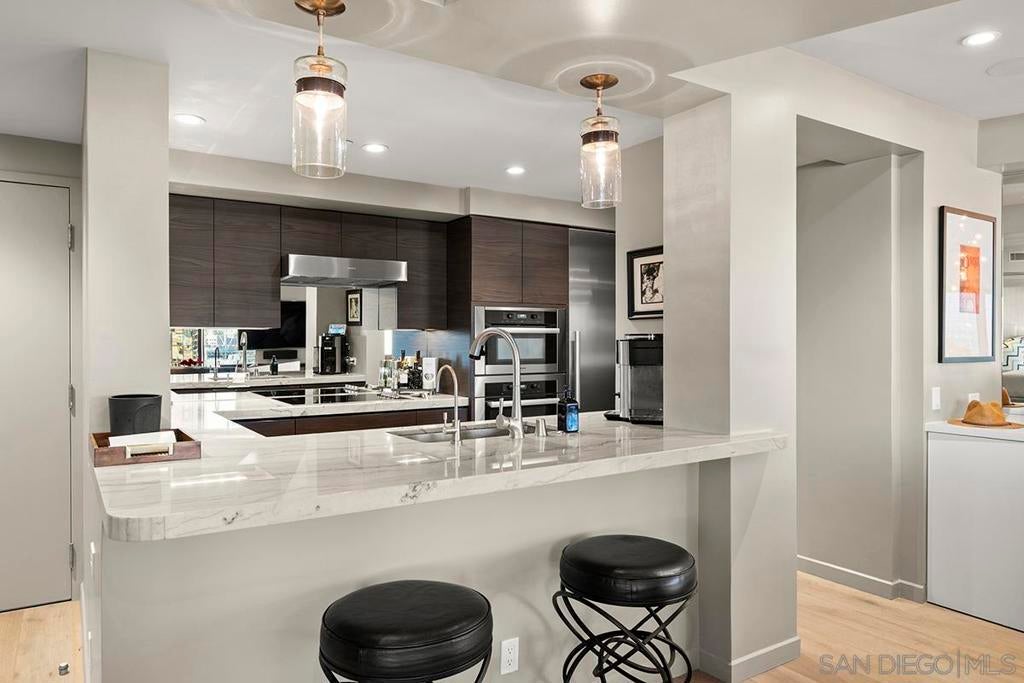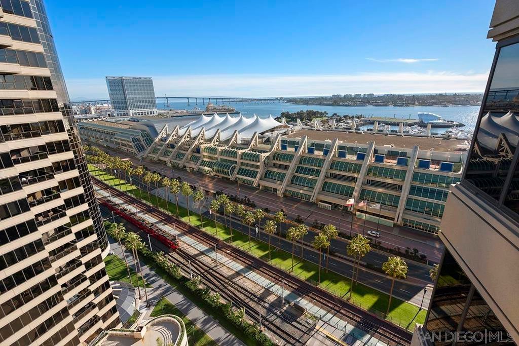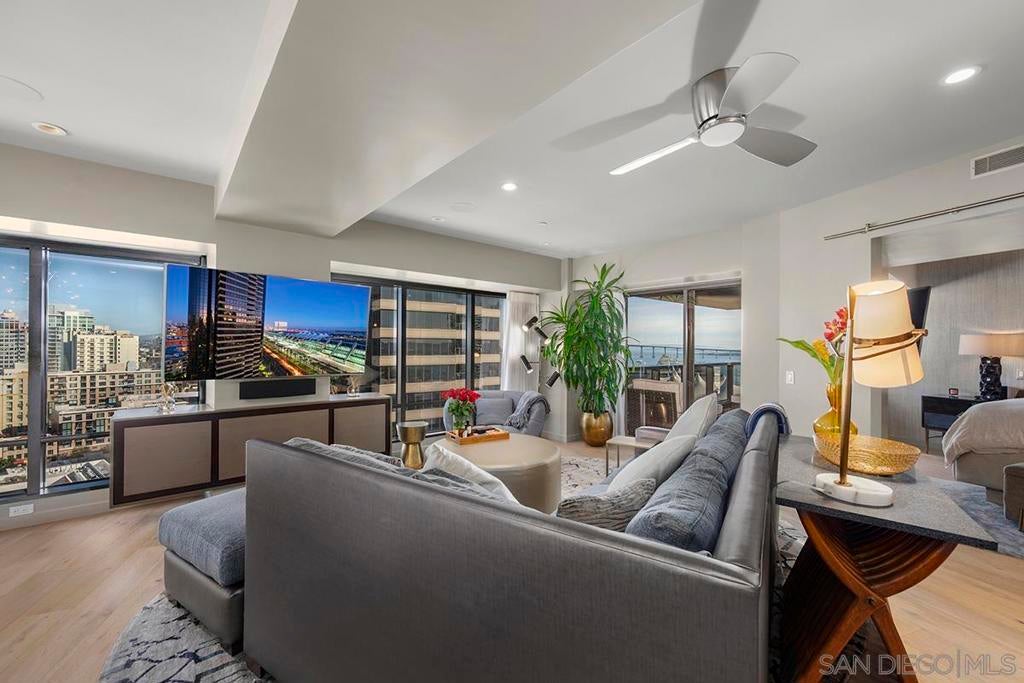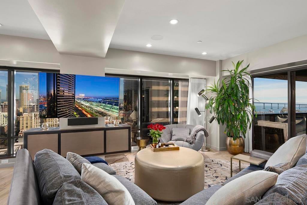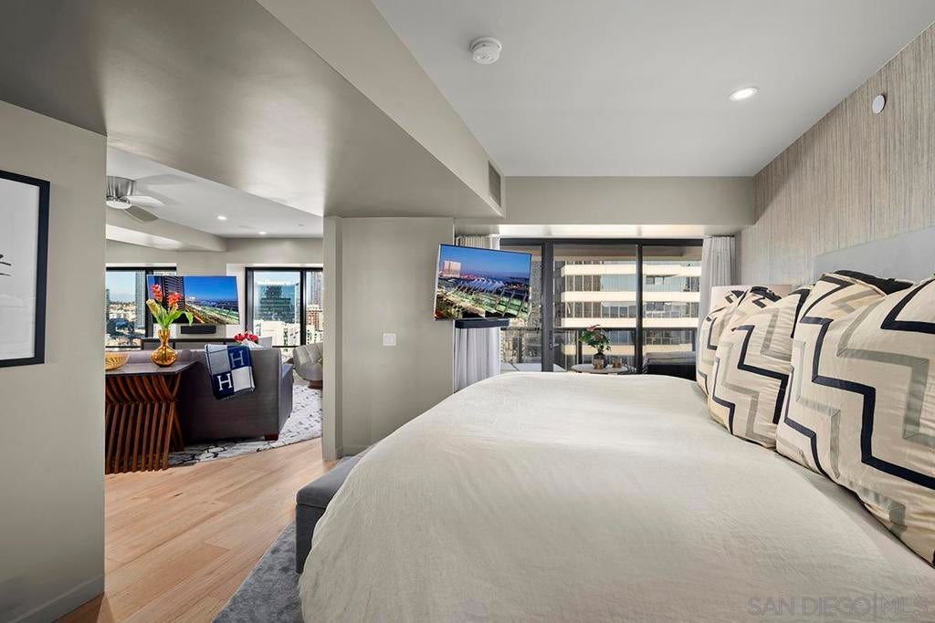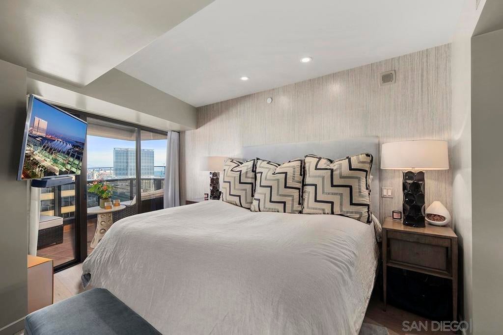 This is the finest 1-bedroom "re-imagined" condo ever seen in the Harbor Club; fully remodeled practically down to the studs! This beautifully curated residence offers a rare blend of luxury, privacy, and prime Marina District living plus one of the few with 1.5 bathrooms to boot. Positioned high enough to rise above neighboring buildings, the home captures sweeping views of the San Diego Bay and the iconic Coronado Bridge through walls of windows flooding the residence with natural light. The professionally decorated interior shows a sleek, modern kitchen appointed with high-end appliances, European-style cabinetry, mirrored backsplash, slab porcelain island, beverage chiller, and an eat-at bar accented by elegant drop lighting making it perfect for both everyday living and entertaining. The primary suite is a serene retreat featuring balcony access, a custom wall treatment, a new built-in closet, and a spa-inspired ensuite bathroom with dual vanity and a step-in rain shower with an additional handheld shower head. Rare for a one-bedroom residence, this home also offers a separate powder room, adding both convenience and sophistication for guests. Additional highlights include a French Oak hardwood flooring, Smart-controlled lighting, built-in sound system throughout, and a secure parking space with EV charger. This is truly a standout opportunity in the heart of the Marina District and luxury urban living at its finest. Residents of the Harbor Club are treated to an array of lavish, resort-inspired amenities that encompass a round-the-clock front desk service, a state-of-the-art gymnasium, an exquisite pool deck, a sociable club room, and a versatile library/business center, among numerous other perks. Nestled in the much-coveted Marina District, the Harbor Club boasts unparalleled ease in traversing the neighborhood on foot, granting effortless access to an array of transportation options, delectable dining establishments, retail therapy, the iconic ballpark, the pulsating Gaslamp Quarter, the artsy East Village, and the scenic Embarcadero – an idyllic setting for serene walks alongside the bay