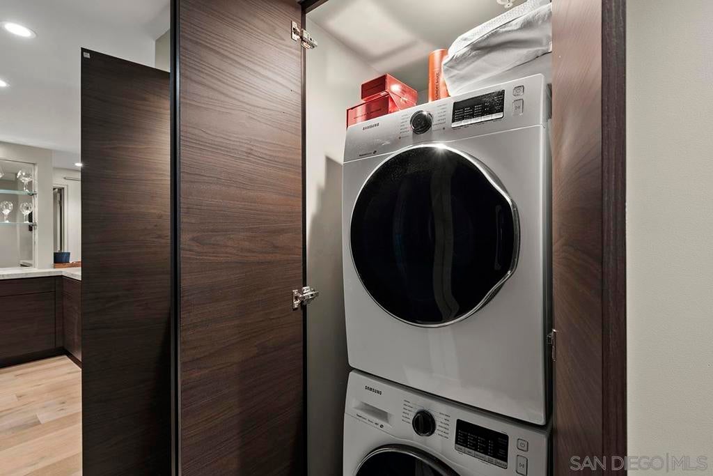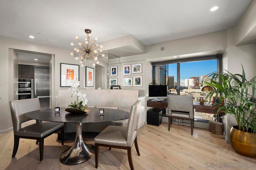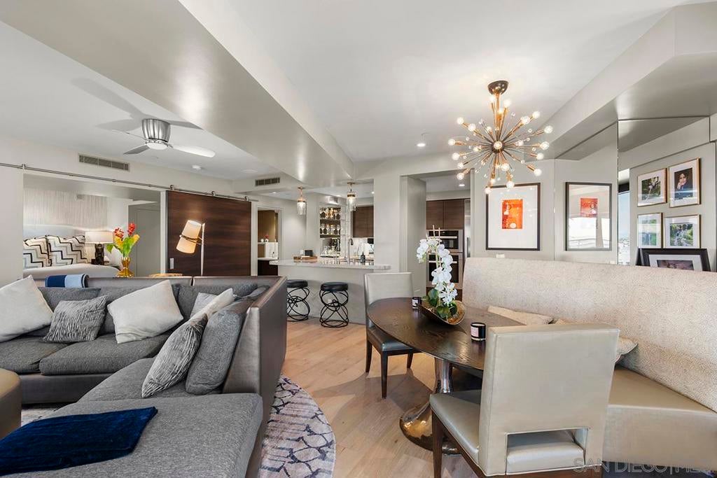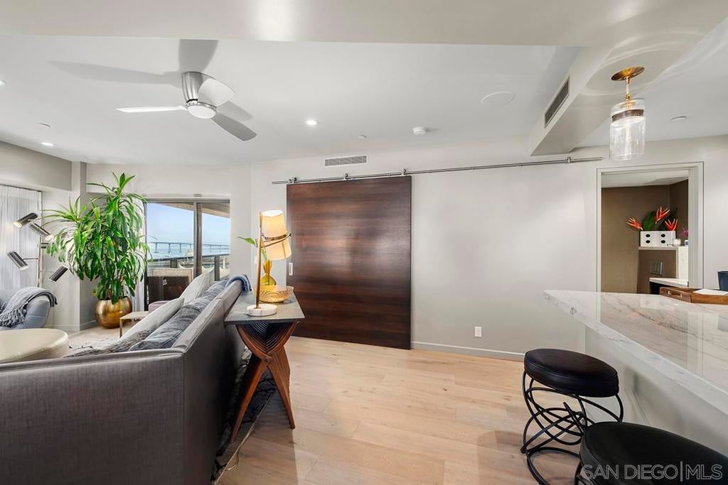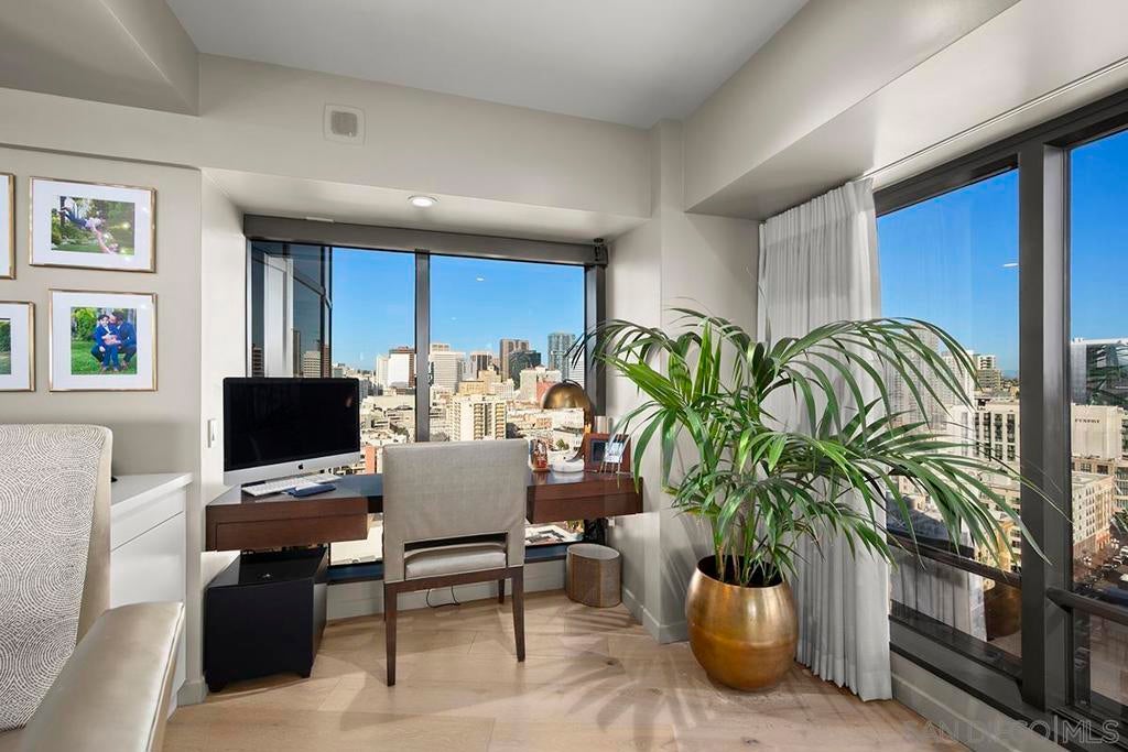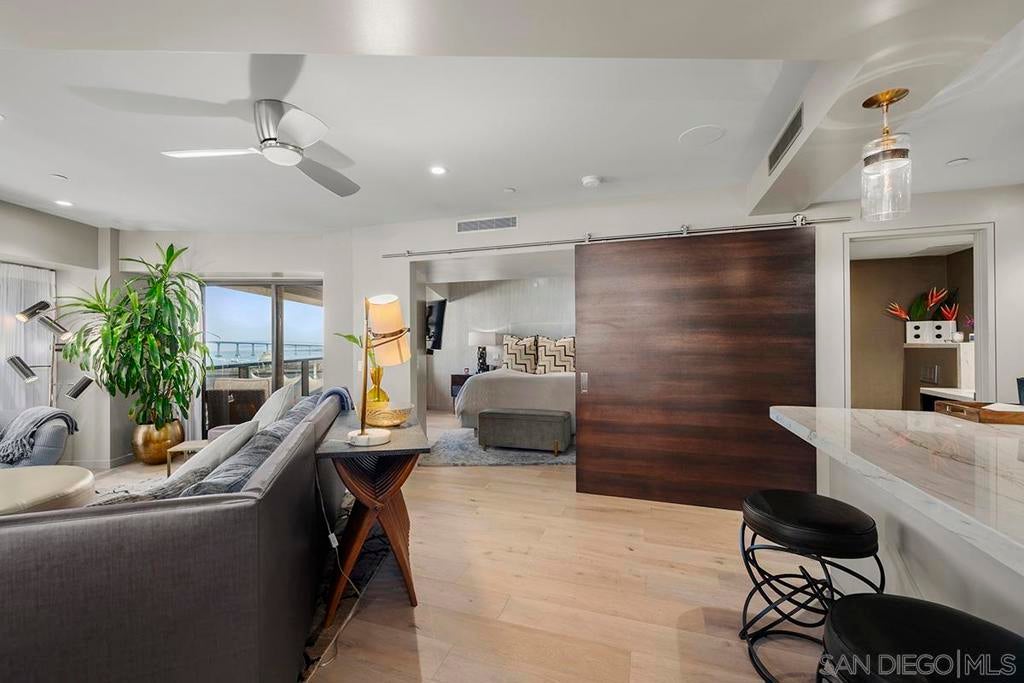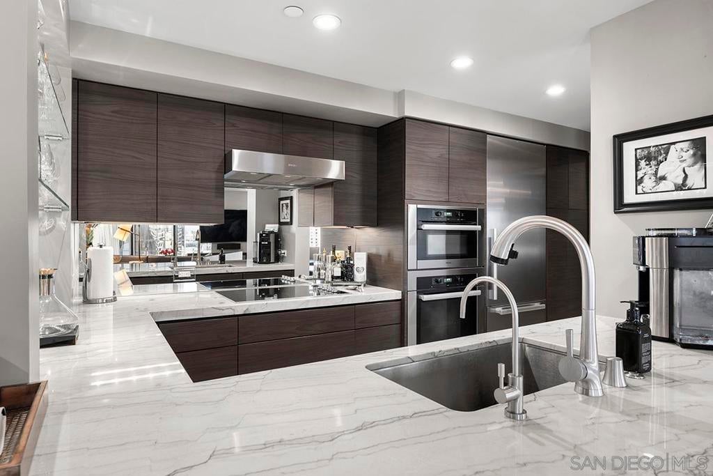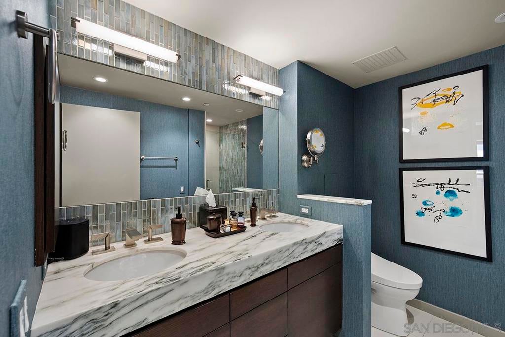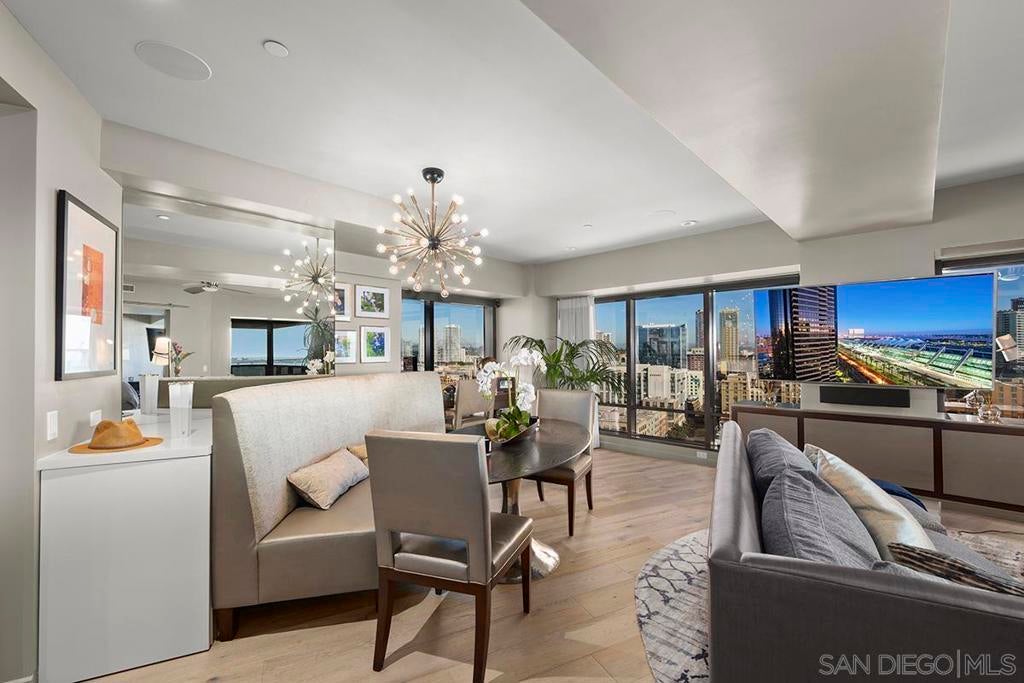 This is the finest 1-bedroom "re-imagined" condo ever seen in the Harbor Club; fully remodeled practically down to the studs! This beautifully curated residence offers a rare blend of luxury, privacy, and prime Marina District living plus one of the few with 1.5 bathrooms to boot. Positioned high enough to rise above neighboring buildings, the home captures sweeping views of the San Diego Bay and the iconic Coronado Bridge through walls of windows flooding the residence with natural light. The professionally decorated interior shows a sleek, modern kitchen appointed with high-end appliances, European-style cabinetry, mirrored backsplash, slab porcelain island, beverage chiller, and an eat-at bar accented by elegant drop lighting making it perfect for both everyday living and entertaining. The primary suite is a serene retreat featuring balcony access, a custom wall treatment, a new built-in closet, and a spa-inspired ensuite bathroom with dual vanity and a step-in rain shower with an additional handheld shower head. Rare for a one-bedroom residence, this home also offers a separate powder room, adding both convenience and sophistication for guests. Additional highlights include a French Oak hardwood flooring, Smart-controlled lighting, built-in sound system throughout, and a secure parking space with EV charger. This is truly a standout opportunity in the heart of the Marina District and luxury urban living at its finest. Residents of the Harbor Club are treated to an array of lavish, resort-inspired amenities that encompass a round-the-clock front desk service, a state-of-the-art gymnasium, an exquisite pool deck, a sociable club room, and a versatile library/business center, among numerous other perks. Nestled in the much-coveted Marina District, the Harbor Club boasts unparalleled ease in traversing the neighborhood on foot, granting effortless access to an array of transportation options, delectable dining establishments, retail therapy, the iconic ballpark, the pulsating Gaslamp Quarter, the artsy East Village, and the scenic Embarcadero – an idyllic setting for serene walks alongside the bay