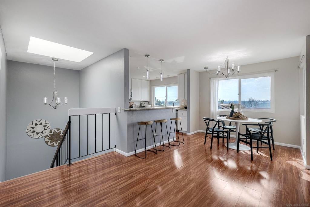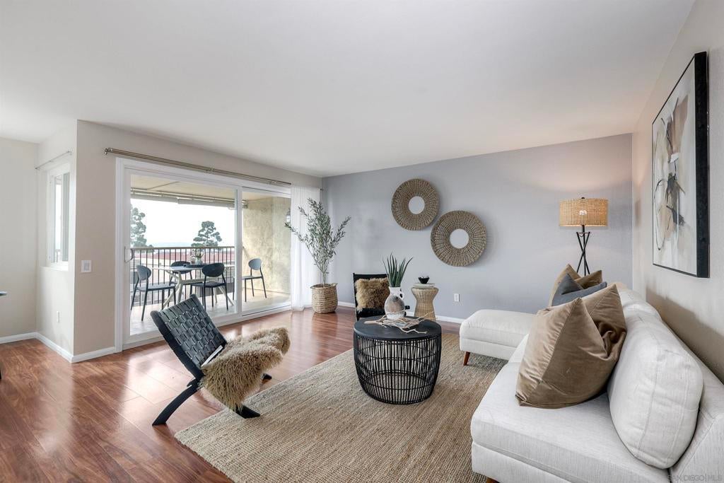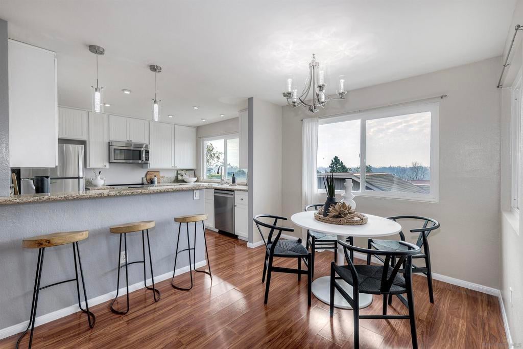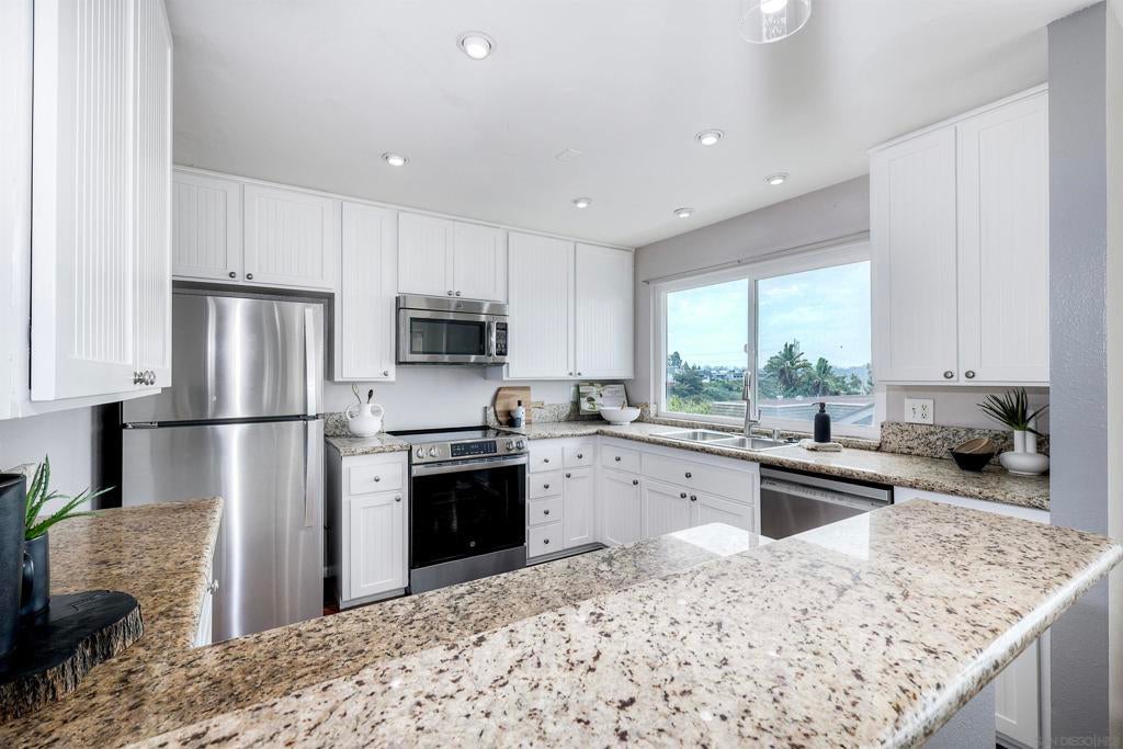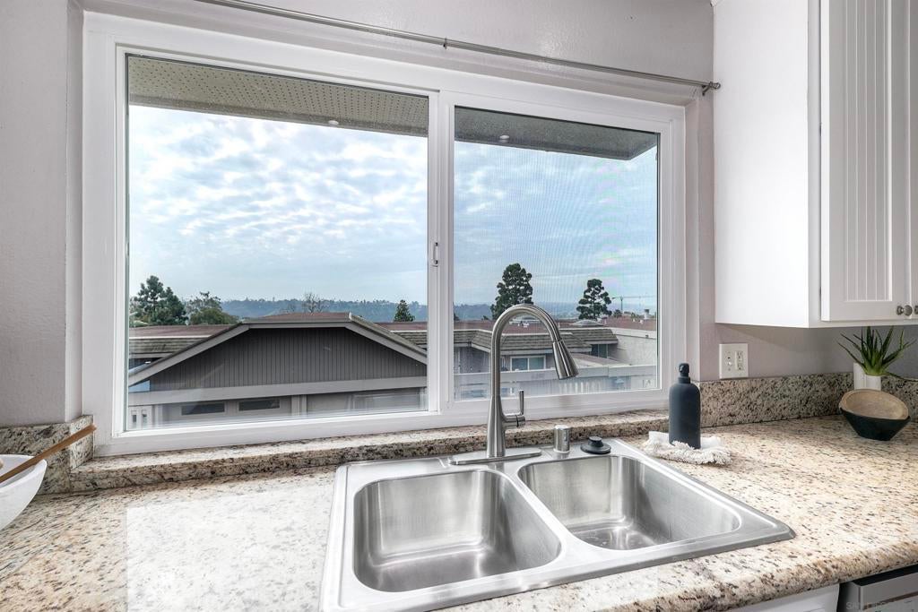 Beautifully updated townhome in Mission Valley! Open kitchen with granite counter tops and stainless steel appliances. Newer double paned high efficiency Milgard windows and sliding doors. Enjoy an open floor plan on the main level with a westerly view out the windows and off the spacious balcony to enjoy beautiful San Diego Sunsets every evening. The private balcony off living room is perfect for outdoor dining. The main level has the primary with an en suite bathroom and two additional bedrooms that share a full bathroom. An additional and very spacious 4th bedroom was added on the bottom level. It can also be used as an expansive office or media room. There is a peaceful patio/ grassy yard-like area off primary. There is an attached 2 car garage with plenty of storage!