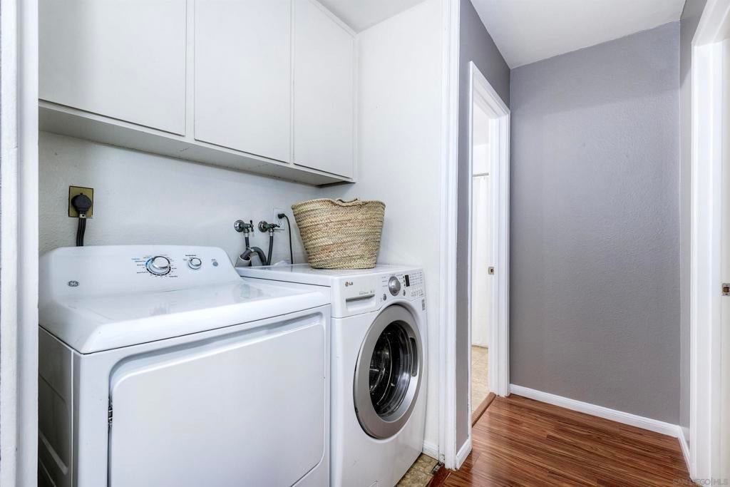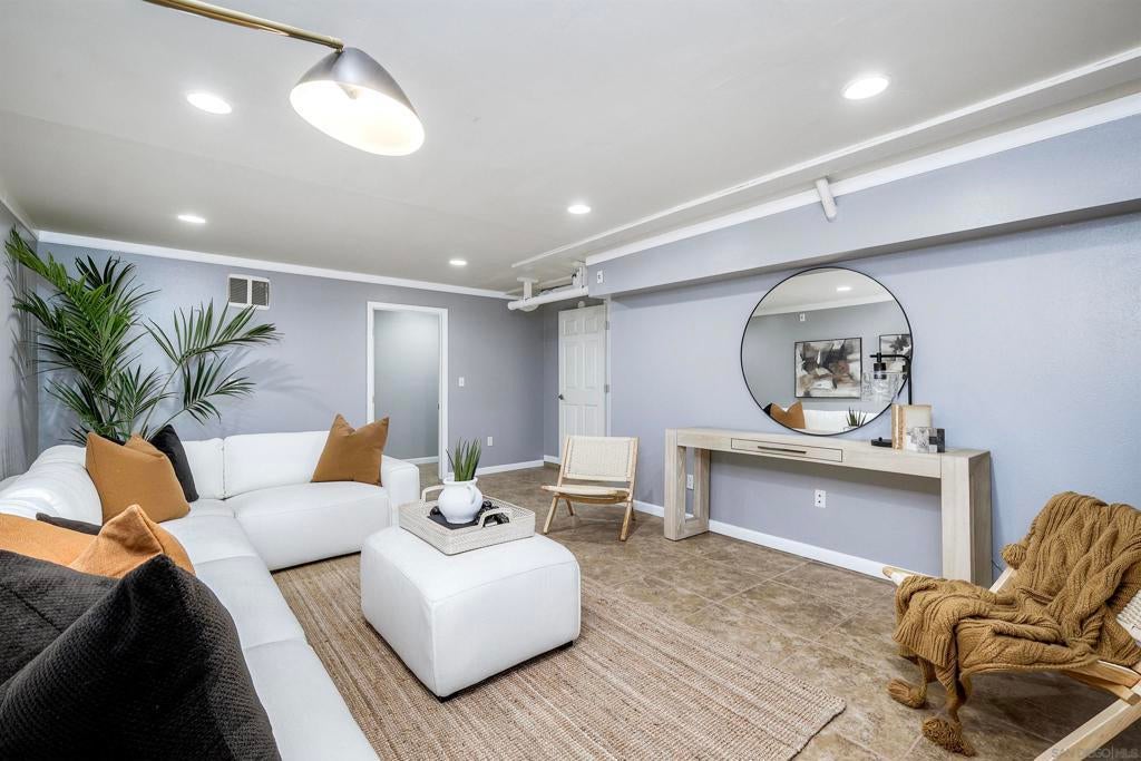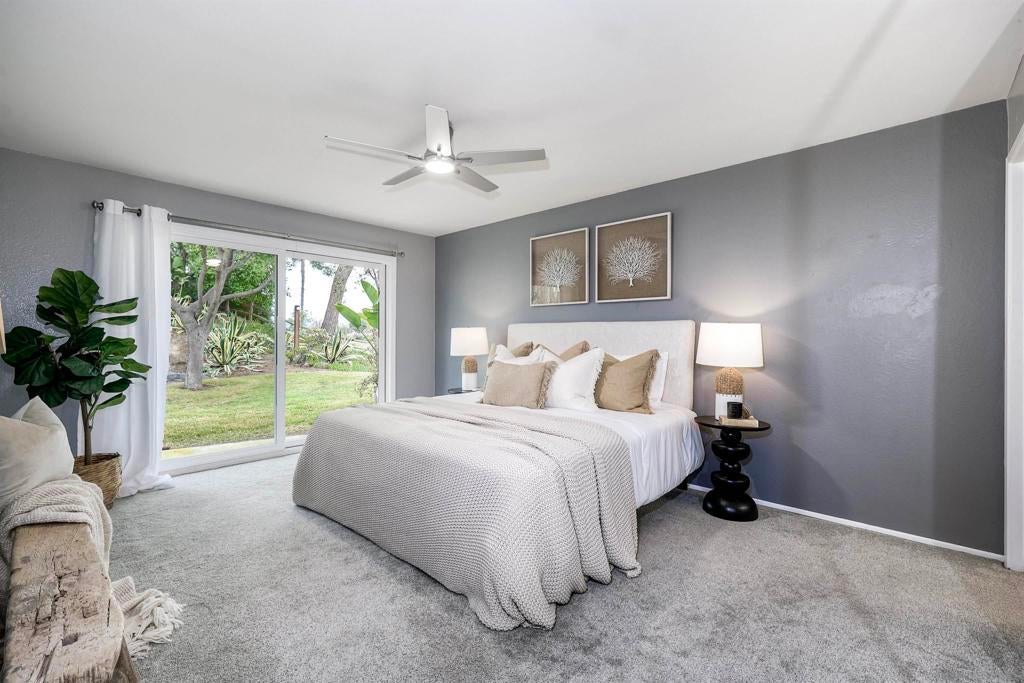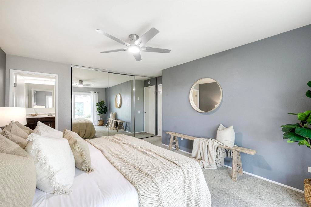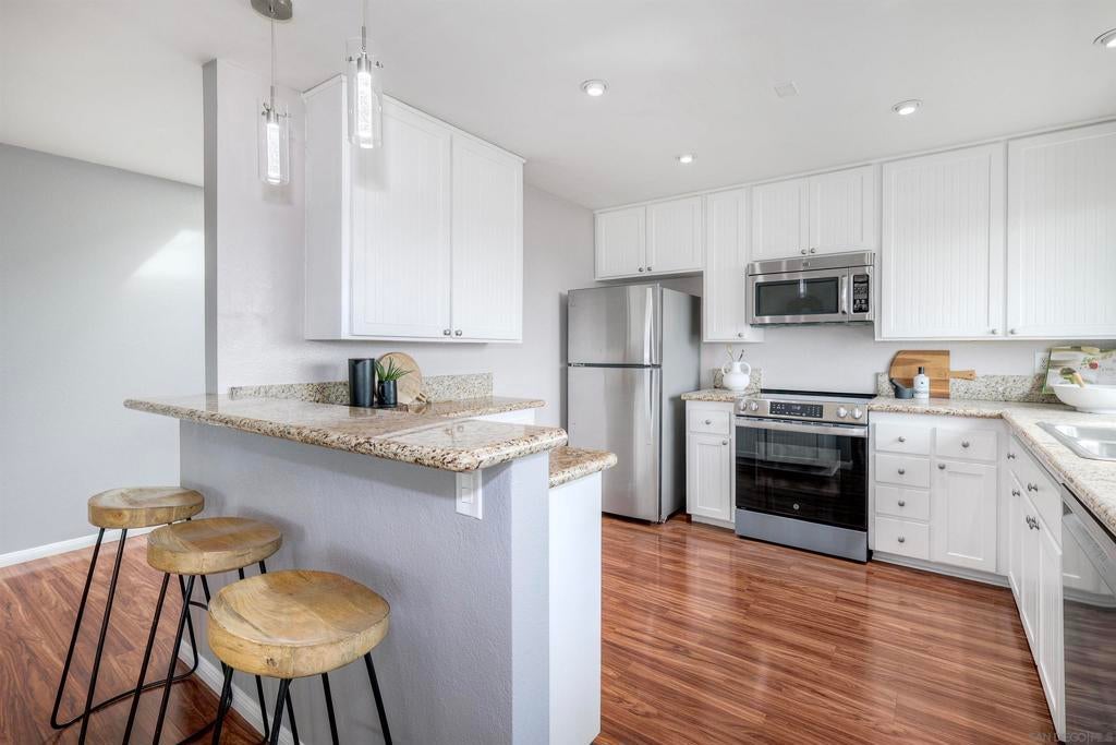 Beautifully updated townhome in Mission Valley! Open kitchen with granite counter tops and stainless steel appliances. Newer double paned high efficiency Milgard windows and sliding doors. Enjoy an open floor plan on the main level with a westerly view out the windows and off the spacious balcony to enjoy beautiful San Diego Sunsets every evening. The private balcony off living room is perfect for outdoor dining. The main level has the primary with an en suite bathroom and two additional bedrooms that share a full bathroom. An additional and very spacious 4th bedroom was added on the bottom level. It can also be used as an expansive office or media room. There is a peaceful patio/ grassy yard-like area off primary. There is an attached 2 car garage with plenty of storage!