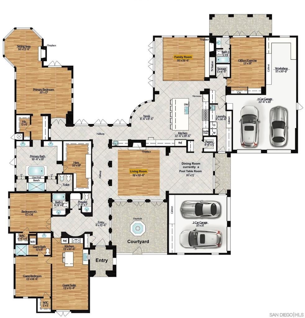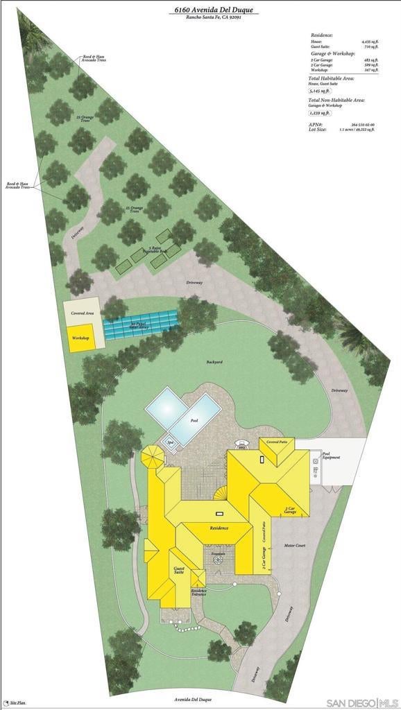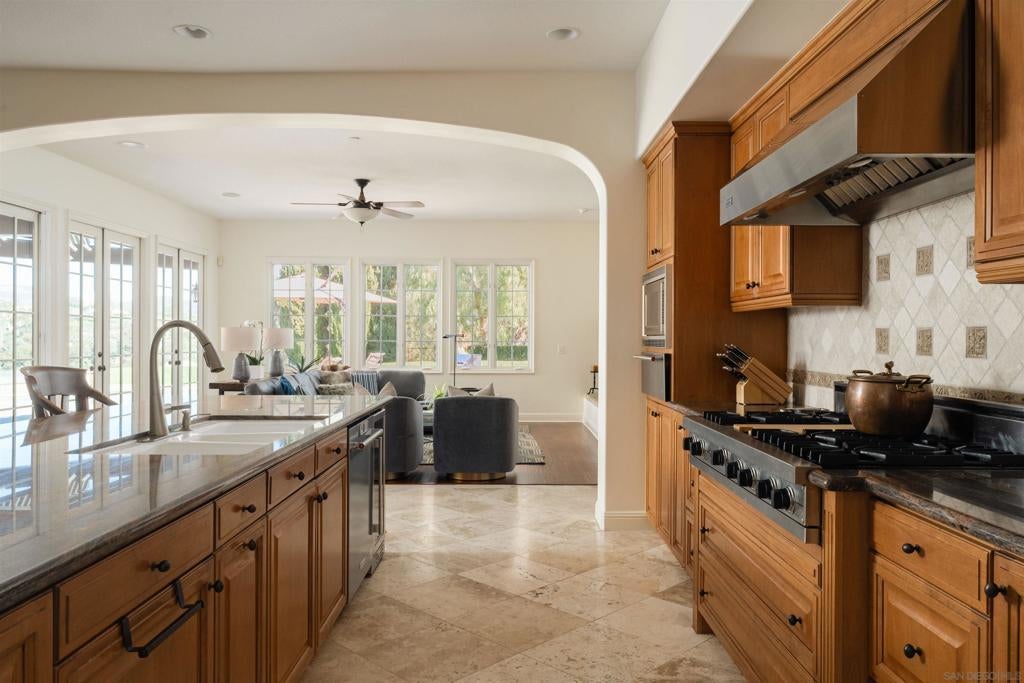 Single level Spanish style estate on 1.13 manicured acres—one of just 10 homes in the gated Las Villas enclave. Best value in RSF. Enjoy sweeping mountain views and a premier location overlooking the 13th & 14th holes of The Bridges at RSF. Designed for effortless indoor-outdoor living, the elevated lot features a resort-style pool & spa, view deck, citrus grove, avocado trees, and raised garden beds. Owned solar, garden shed, 4+ car garage plus workshop. Bridges Golf Membership may be available. The 5,028 sq. ft. floor plan offers strong versatility with four ensuite bedrooms plus a fully equipped attached guest suite featuring a private entrance—ideal for extended family, rental income, or multigenerational use. French doors throughout open to a courtyard entry and expansive rear patio, enhancing indoor-outdoor living and entertaining appeal. The chef’s kitchen includes a six-burner range, double ovens, wine refrigerator, and premium appliances. Situated on a private 1.13-acre lot with discreet solar, mature fruit trees, and a resort-style pool, exercise pool, and spa. Five-car garage capacity supports storage, workshop, or golf cart use. A rare opportunity combining location, privacy, and flexible use in a limited-inventory luxury enclave.