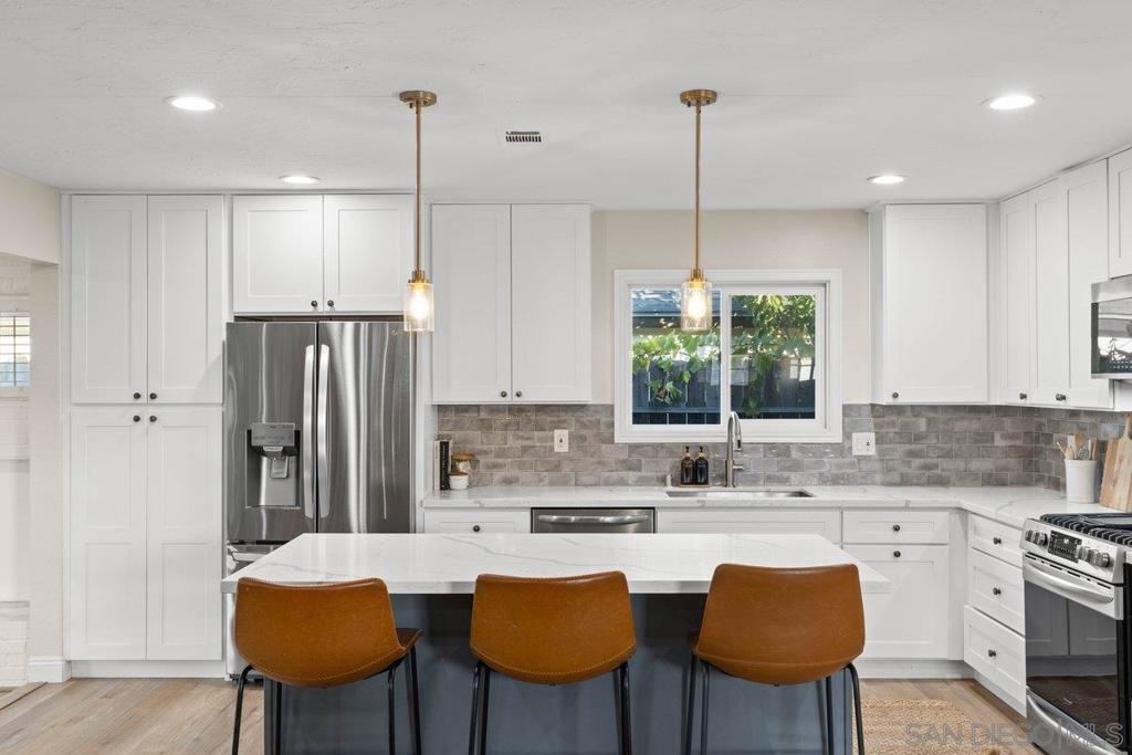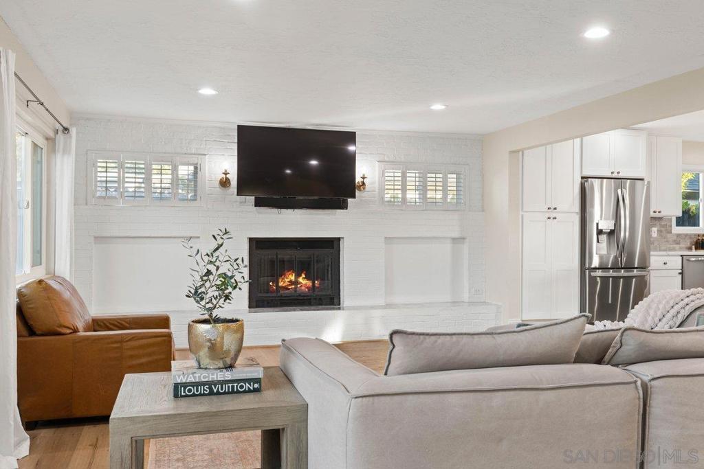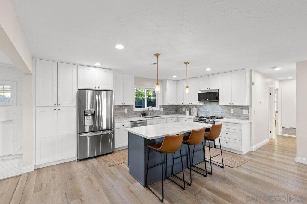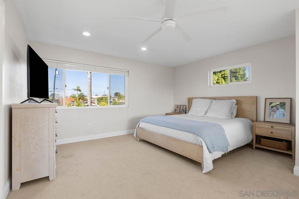 Stunning and rare home in the highly desirable Clairemont neighborhood, offering a versatile and spacious floor plan that is truly move in ready. The main level features an ensuite bedroom plus two additional bedrooms and a full bath, while the upper level showcases an expansive primary suite with dual walk in closets and a beautifully updated bathroom. The open concept design highlights a remodeled kitchen with a custom island, stainless steel appliances, gas cooking, modern lighting, and a striking tile backsplash, flowing seamlessly into the inviting living room with a cozy fireplace. All bathrooms have been tastefully updated with custom finishes. Additional features include updated windows, abundant storage, and a two car garage. The home also offers great curb appeal with low maintenance turf in both the front and backyard. The private backyard is perfect for entertaining, featuring a large covered patio and ample lighting for year round enjoyment. Ideally located near parks, schools, shopping, dining, and just minutes to the beach, this home captures the best of San Diego living. Stunning and rare home in the heart of the highly desirable Clairemont neighborhood, offering a flexible and spacious floor plan that is truly move in ready. The main level features an ensuite bedroom plus two additional bedrooms and a full bath, while the upper level boasts a massive primary suite with two walk in closets and a beautifully designed primary bathroom. The open concept layout showcases a gorgeous kitchen with a custom island, stainless steel appliances, gas cooking, modern lighting, and a striking tile backsplash, opening to a spacious living room with a cozy fireplace. All three bathrooms have been fully updated with custom finishes. Additional highlights include updated windows, excellent closet and storage space, a two car garage, and great curb appeal with easy care turf in both the front and backyard. The very private backyard is ideal for entertaining with a large covered patio and ample outdoor lighting for year round enjoyment. Conveniently located just minutes from parks, schools, restaurants, shopping, and beaches, this home offers the very best of San Diego living in a wonderful neighborhood.