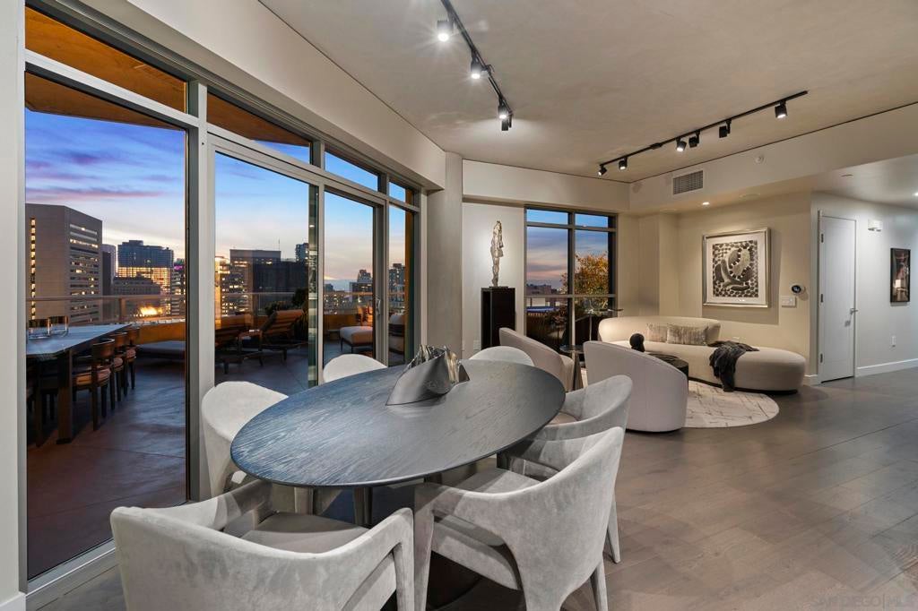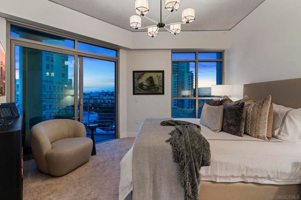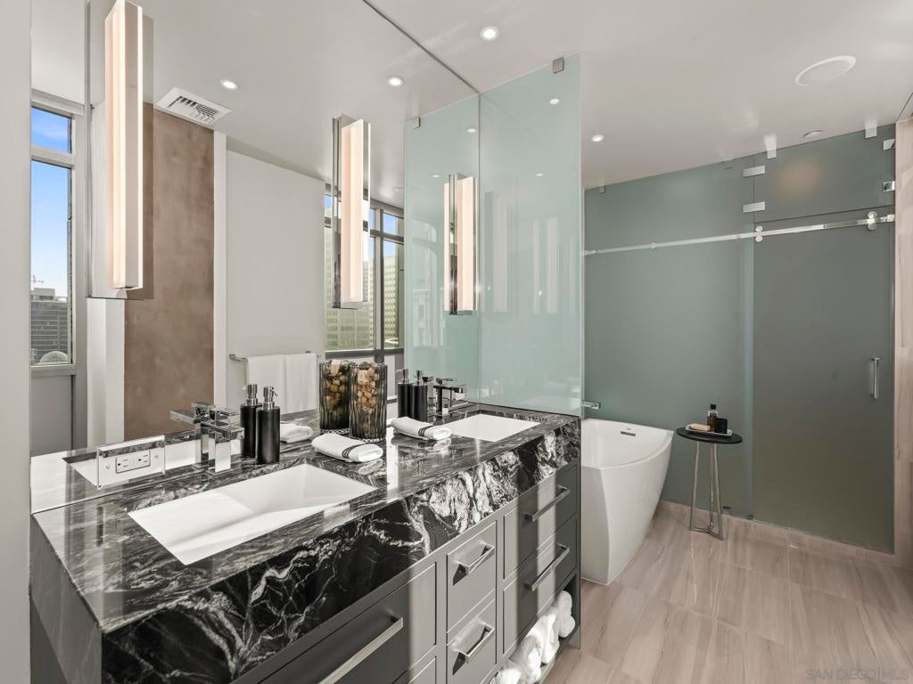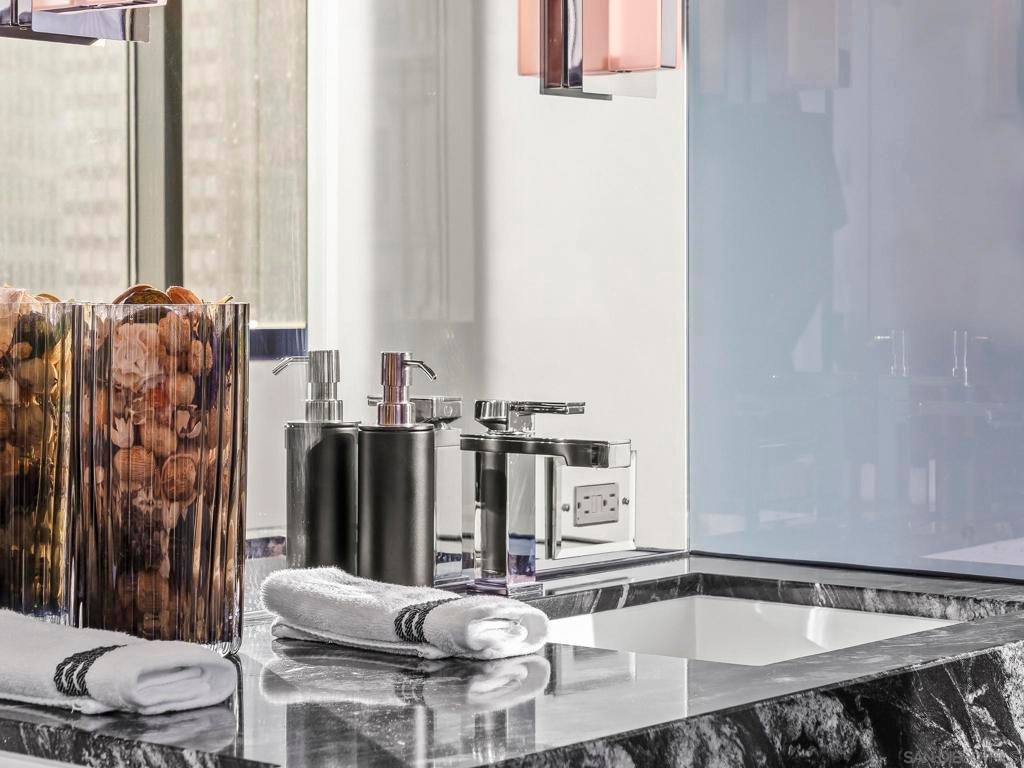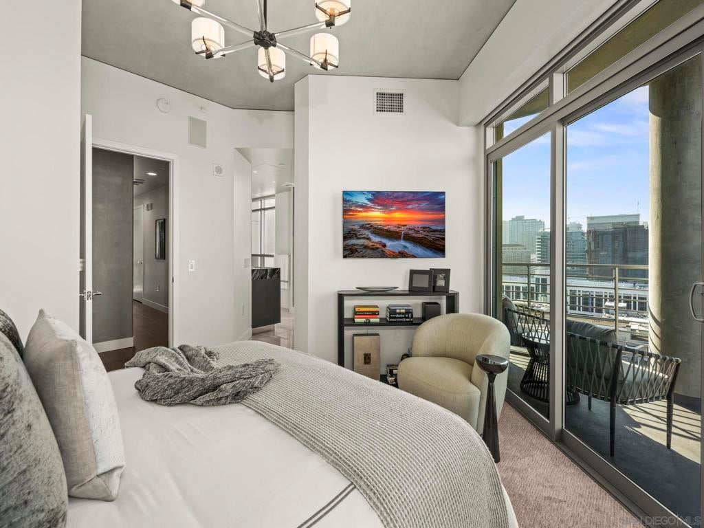 Imagine waking up in the heart of vibrant downtown, where every day is a new story waiting to unfold. This luxury residence at the Cortez Blu, an exclusive boutique building, isn't just a condo; it's a launchpad for an unparalleled urban lifestyle, perfectly situated just steps from Symphony Plaza, Balboa Park, Little Italy, and the Gaslamp. Step inside your eighth-floor sanctuary, a space totally redefined in 2024 to blend modern luxury with architectural distinction. The design choices are intentional and inspiring, featuring striking exposed concrete walls adding texture and an industrial-chic edge to high-quality finishes. You'll find bespoke elements everywhere, from custom cabinetry with granite tops and high-end appliances to sophisticated designer lighting and hidden tech shades. The commitment to unique architecture extends to the bathrooms, which feature fixtures by legendary Frank Lloyd Wright. The primary suite is a true retreat, offering picturesque city views through floor-to-ceiling windows and access to a private balcony. The en-suite bathroom indulges with a dual custom vanity, soaking tub, wet room, and walk-in closet. But the real showstopper is the over 750 sq. ft. private view terrace—a rare, almost impossible-to-duplicate outdoor space that seamlessly transforms your living experience. It's your personal stage for entertaining guests or simply soaking in continual, breathtaking city vistas. This turnkey furnished property, with secure parking and storage, offers a lifestyle that is both sophisticated and thrilling in the pulsating center of the city. One must experience this residence to understand the feel and tranquility it brings. Enjoy the privacy of only 2 neighbors on your floor with only a small, shared wall. Perched atop the serene Cortez Hill, Cortez Blu offers the idyllic location in Downtown San Diego, coupling urban convenience with neighborhood charm. This location affords quick access to freeways, putting the entire city in easy reach, but near all the verve and excitement of the cultural and brimming nightlife, sporting events, and social happenings of the downtown area.