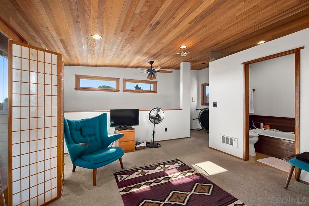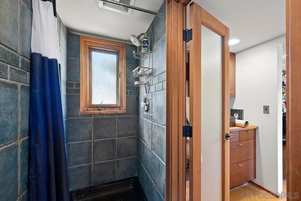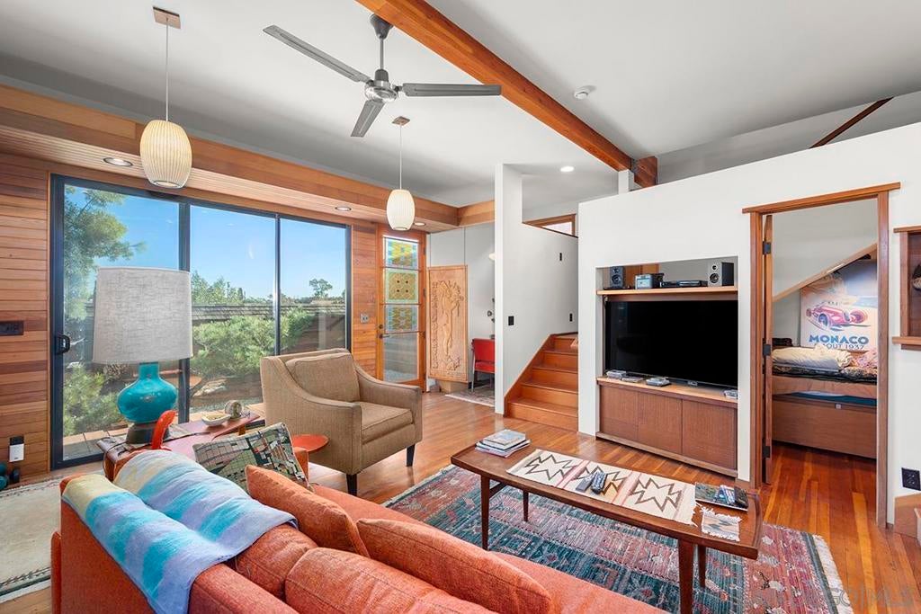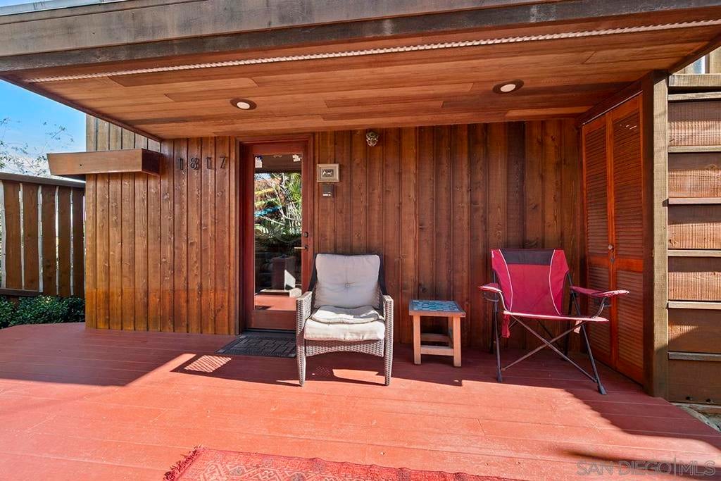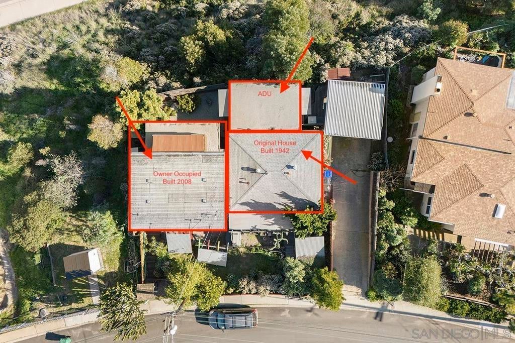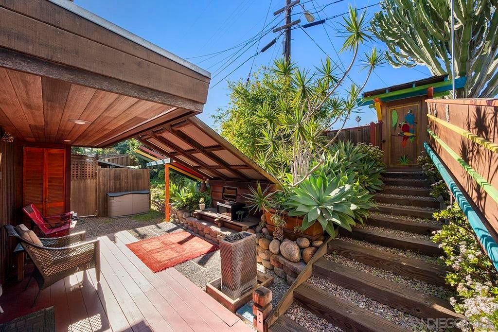 One-of-a-kind multi-generational and income-producing opportunity in San Diego, ideal space for an artist retreat. The Frank Lloyd Wright inspired main home features 1 bedroom and 2 baths with a sunken living room, soaring 10-foot ceilings, built-in cabinetry, cedar ceiling in the primary bedroom, distressed fir and cork floors, ancient redwood accents, and custom wood windows and doors. Enjoy a private backyard with a tranquil zen garden, balcony, and fireplace. The main house is 1,150 sqft and connected is the original house 750 sqft 2-bedroom, 1-bath house and a 350 sqft ADU, thoughtfully arranged to provide privacy while offering versatile living and rental options. Perfectly located near shopping and local amenities. This is truly a rare opportunity to own in the heart of San Diego.