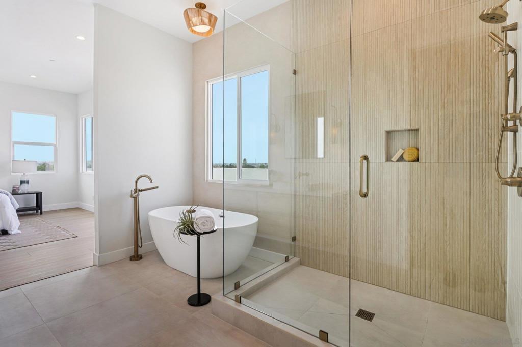 NEW CONSTRUCTION!! Beautiful Bay Park "Beach Chic" Home featuring panoramic views & warm, contemporary styling! Welcome to this stunning 3,008 sq. ft. residence that blends luxury, comfort, and spectacular views. Perched in a premier location, the expansive rooftop deck showcases sweeping vistas stretching from USD, Point Loma, the Bay and Ocean, all the way to Mount Soledad—an entertainer’s dream setting. The primary suite is a true retreat, featuring a spacious walk-in closet, sunset-centric patio, spa-like soaking tub, and an oversized shower. Upstairs, you’ll also find three additional bedrooms, including another with its own en-suite bath, plus a generous laundry room for convenience. At the heart of the home, the chef’s kitchen shines with an 48" Z-line cooktop and double oven with elegant gold accents. Built in double wide refrigerator, a walk-in pantry, crisp white cabinetry, wine fridge, and huge island with beautiful quartz counters—designed for both style and function. Accordion doors off the living and dining areas seamlessly blend the indoor and outdoor covered patio and private backyard. Thoughtful details throughout include soft close cabinets, wine fridge, epoxy garage floors, OWNED SOLAR, 10' high ceilings, and a spacious, open floor plan. This residence offers a rare combination of indoor-outdoor living, upscale amenities, and panoramic San Diego views—making it the perfect place to call home.