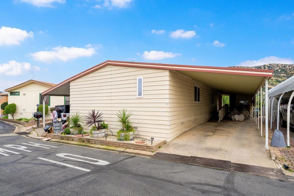 Sweeping mountain views define this beautifully updated home, ideally situated on a premium lot within a scenic 55+ community that is also VA approved! This home offers the rare benefit of NO SPACE RENT and a low HOA of just $318 per month, which includes water, trash pickup, cable, ample guest parking, and access to an impressive list of amenities. Energy efficiency is a standout feature with 17 owned solar panels, helping keep utility costs low. The interior has been tastefully renovated, including newer laminate flooring throughout with no carpet along with premium waterproof vinyl flooring installed over plywood with a moisture barrier beneath for added durability and a solid, quiet feel underfoot. Two bay windows at the back of the home bring in abundant natural light while framing the mountain views. Energy efficient double pane windows enhance comfort and efficiency throughout the home. The home offers a well-designed layout with a welcoming living room, a spacious family room, and a formal dining area, creating excellent separation of spaces for relaxing and hosting. This home features fresh paint, central AC and central heating. A bright sunroom provides additional flexible living space, and a large laundry room includes a full-size washer and dryer. Interior improvements create a clean, finished feel that lives comfortably and flows well. Infrastructure & energy updates include: copper wiring from the main power panel throughout the home; copper plumbing for reliable water distribution; added insulation in the walls and ceilings for improved comfort and efficiency; energy efficient double pane windows; premium waterproof vinyl flooring installed over plywood with a moisture barrier beneath; and construction that meets California Title 25 Chapter 2 standards for mobile homes and accessory structures. Outside, the property includes a newer roof installed in 2021, a steel frame supported by upgraded seismic jacks for improved stability, seismic bracing beneath the home for added reinforcement, two covered driveways with one on each side of the home, fruit trees and an additional storage shed or workshop area. The scenic back patio opens directly to green space and panoramic views and is just steps from the community amenities. The surrounding hills create a peaceful backdrop throughout the neighborhood, with especially stunning views from the home itself, including the back patio and interior living spaces. Residents enjoy a resort style lifestyle with a heated inground saltwater pool and spa, two fitness centers, pickleball court, shuffleboard, dog park, car wash, optional RV parking available for an additional fee and more! The location offers a peaceful country feel while remaining just minutes from the 8 freeway, shopping, dining, and all daily necessities. This is a must see!