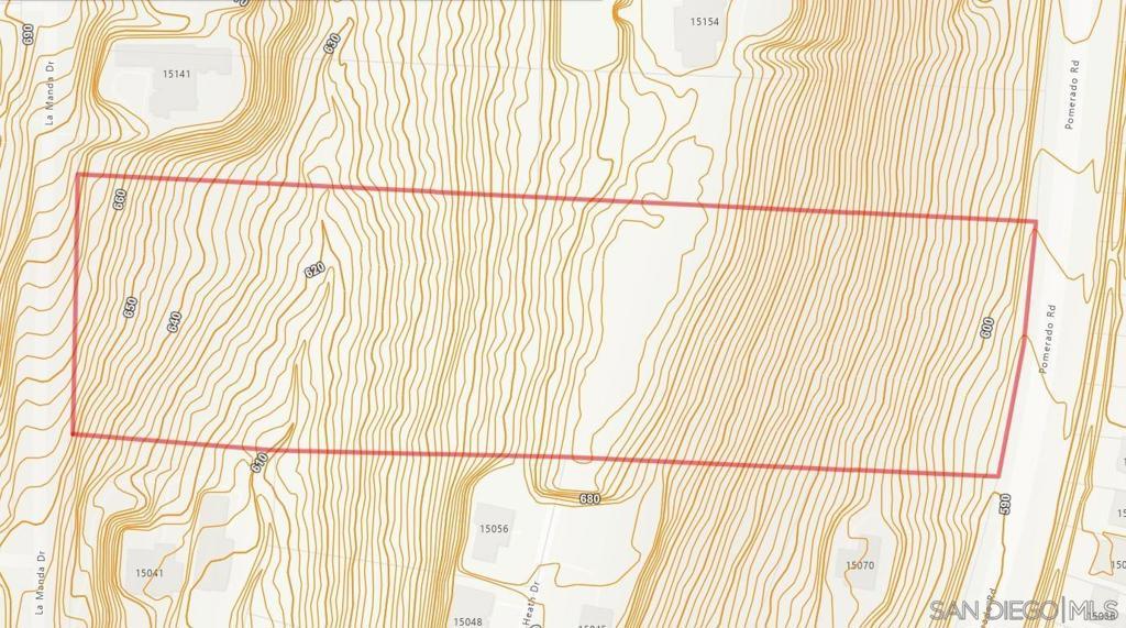 Take advantage of this rare opportunity to own 8.16 acres in the heart of Poway. Zoned RR-C for residential development. Build your home on this large parcel or subdivide the property into 2-4 separate parcels. Great location close to shopping (Target, Costco, Home Depot, ...), restaurants, schools, hospital, and the I-15 freeway. This large parcel spans between La Manda Dr and Pomerado Rd. See virtual tour for aerial video. Utilities are in the paved street (see photos). Sewer & water hydrant are nearby. Electric, phone, and cable are immediately in front of the property on La Manda Dr. Sewer looks about 40 steps from the property. Water and water hydrant are about 60 steps from the property. Electric and cable are immediately in front of the property on La Manda Dr. From Zoning Section 17.08: "The RR-A through RR-C residential rural zone is intended as an area for very low density residential uses with minimum lot sizes of one acre and maximum densities of one unit per acre. Additional uses are permitted that are complimentary to, and can exist in harmony with, a rural residential neighborhood. Specific slope criteria shall be applied in the determination of the maximum allowable densities to achieve compatibility with the topography and public service constraints."