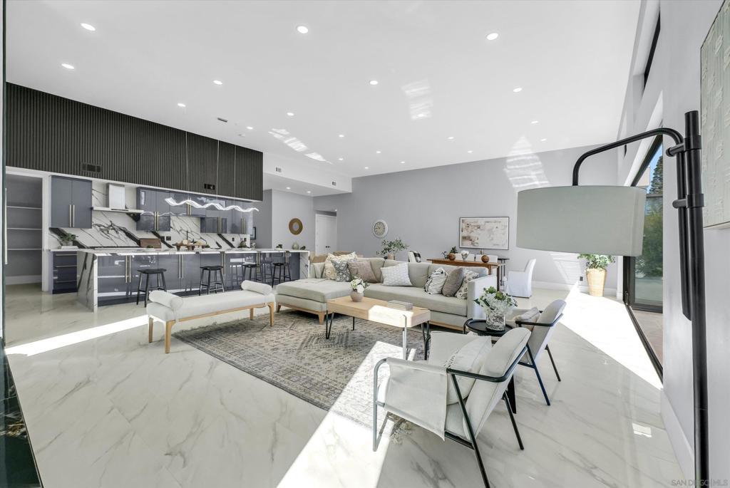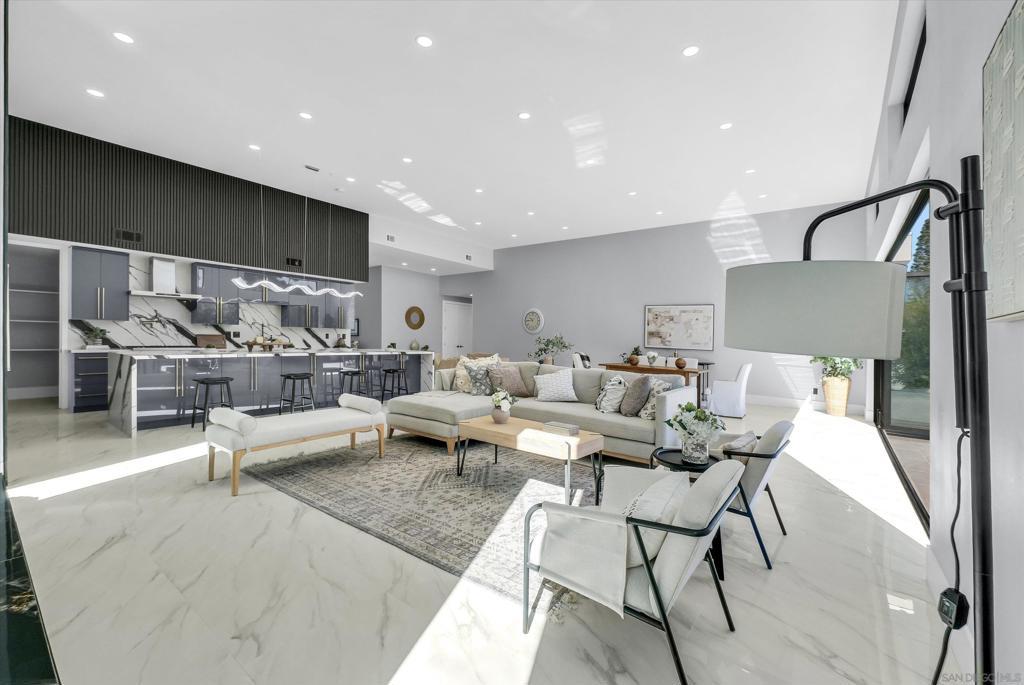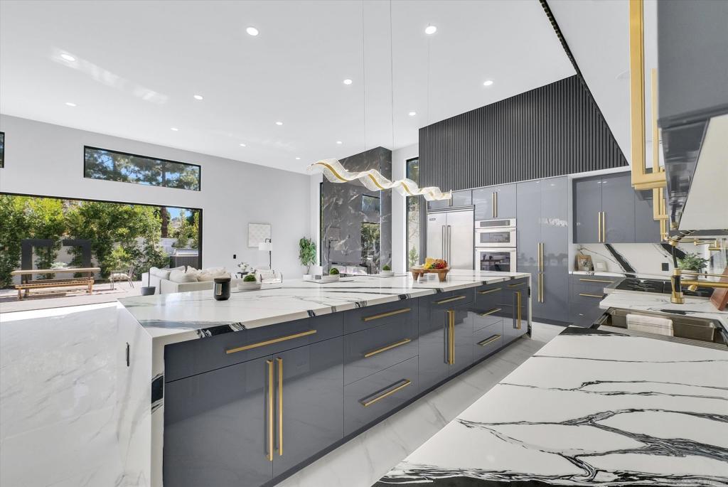 A stunning architectural masterpiece blending modern design with luxury comfort. This fully renovated single-story home showcases soaring ceilings, sleek porcelain floors, and an open-concept great room that flows seamlessly to an entertainer’s patio through massive glass doors. The gourmet kitchen features custom cabinetry, waterfall marble counters, and designer lighting. The primary suite offers a spa-inspired bath with freestanding tub, rainfall shower, and LED backlit mirrors, plus a custom-built walk-in closet. Every detail—from the linear LED fixtures to gold-accented hardware—reflects sophisticated craftsmanship. Low-maintenance landscaping, sleek curb appeal, and a modern glass garage door complete this exceptional residence—perfectly designed for today’s lifest