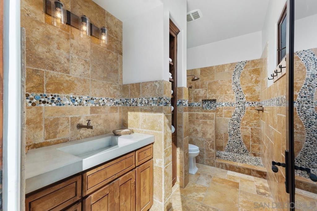 Exquisite & meticulously furnished estate in desirable gated community in Rancho Santa Fe! Nestled on 2 lushly landscaped acres, this exceptional Weir Brothers built home offers the pinnacle of privacy, sophistication, and timeless craftsmanship. Designed for seamless indoor-outdoor living, the single-level main residence spans over 8500 sq. ft. and features 5 bedrooms/ 9 baths, plus brand new Dolby Atmos 360 surround sound home theater! In addition, home is complemented by 850 sq. ft. detached guest house with its own bedroom, full bathroom, living room & kitchen. Schedule your private tour today! Experience the ultimate luxury lifestyle! A sweeping circular driveway leads to grand entry doors that reveal breathtaking panoramic views of manicured gardens and unobstructed views of the valley. The formal living and dining areas provide an elegant setting for hosting unforgettable gatherings, while the expansive family room opens through lift-and-glide doors to a covered outdoor patio with a fireplace, perfect for year-round entertaining. The estate’s resort-like grounds include pool and spa, a pickleball/ sport court, gym, cold plunge, 5-hole putting green and impeccably maintained lawns, offering endless opportunities for recreation and relaxation. The gourmet kitchen, designed to meet the needs of the most discerning chef, is complemented by 72" Caliber Professional Range w/ 6 burners, Subzero refrigerators, Fisher & Paykel dishwashers, Wolf microwave, Waterstone luxury kitchen faucets and so much more! 1000 bottle temperature controlled wine cellar and wet bar makes this home perfect for entertaining. Additional highlights include luxurious primary suite with a private retreat featuring his-and-her custom closets, dual water closets, and a stunning marble-clad bath & shower area. Furthermore, home offers wood-paneled executive office and 4 well-appointed bedrooms with en-suite baths. Outdoor kitchen features Kalamazoo gourmet grill & Gozney pizza oven. Newly completed Dolby Atmos 360 surround sound home theater provides a home cinema experience you will never forget. With a five-car garage featuring a charging station and ample guest parking, hosting is effortless. Situated in a gated enclave of just 6 homes, this estate offers the ultimate in security, tranquility, and convenience—just minutes from top-rated schools, premier shopping, and some of the best beaches in San Diego. This is truly a private sanctuary of luxury living.