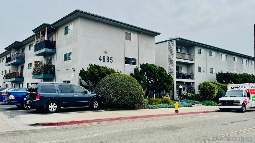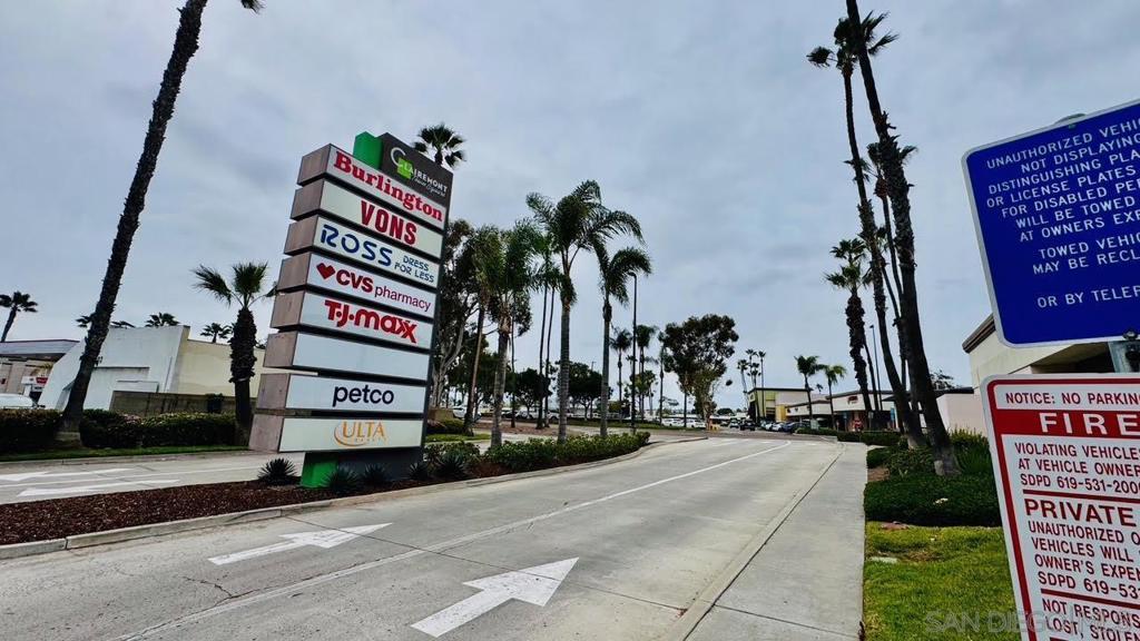 Move-in ready top-floor end unit with 2 bedrooms and 1.5 baths, featuring a private view balcony. This bright and open floor plan boasts luxury vinyl plank flooring, new carpeting, freshly painted interiors, a ceiling fan, mirrored closet doors, and upscale bathrooms. The main bathroom includes a tub/shower combo, and there's a convenient half bath off the living room for guests. Enjoy an assigned parking space with easy access to the unit via stairs or elevator. Low HOA dues cover water! Just one block from the popular Clairemont Town Square with its many shops and restaurants, and minutes from Mission Bay and La Jolla beaches. Perfect for an investor