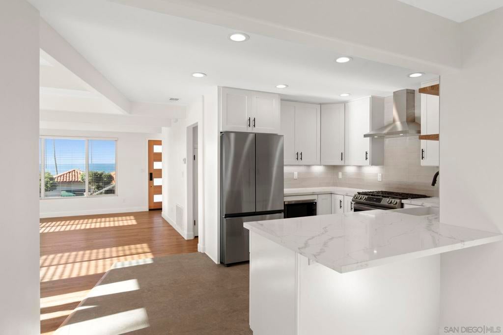 Be the first to live in this newly renovated (from top to bottom) quintessential California beach cottage just steps to the beach! With white and blue water views from nearly every room and endless sunsets over the Pacific, this 3-bedroom, 2-bath home features a new kitchen, new bathrooms, new flooring throughout, an ocean-view terrace, and driveway parking. Walk to the museum, boutiques, and restaurants in downtown La Jolla.
