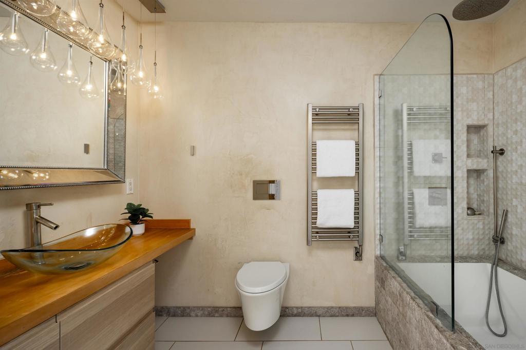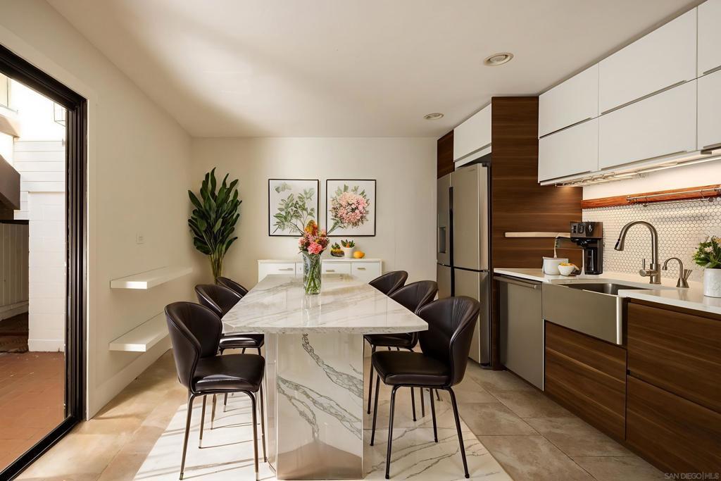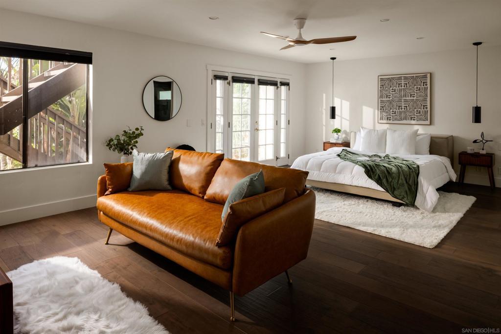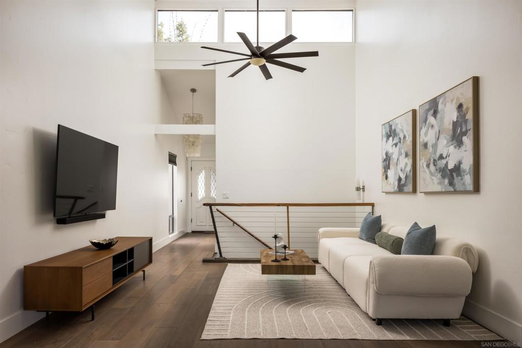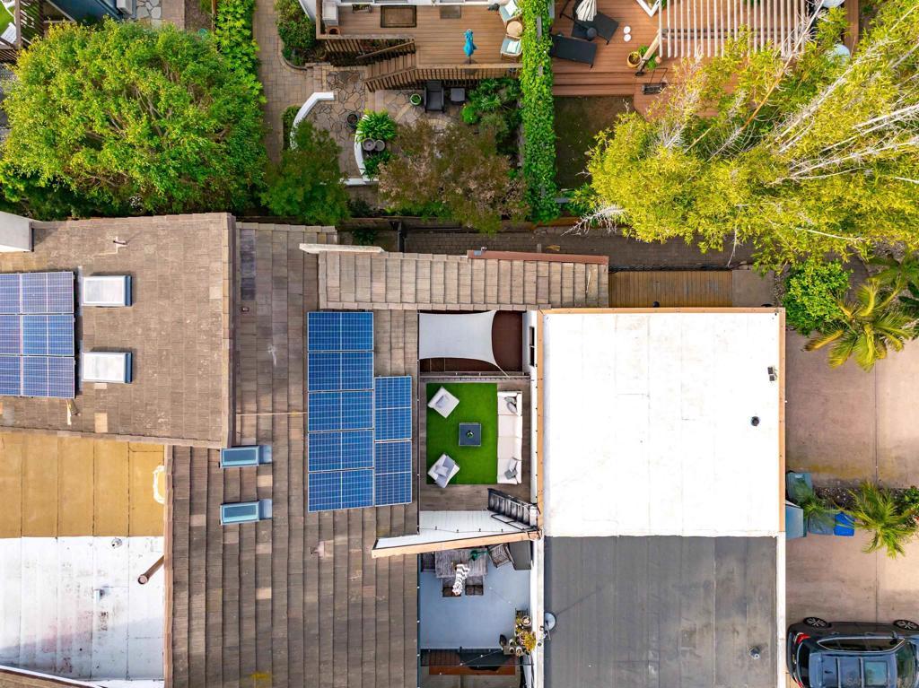 Introducing 698 Hygeia - a light and bright twinhome WEST OF I5 in the heart of Leucadia/Encinitas, easily WALKABLE to Beacon’s Beach, local shops and restaurants along the 101, and the Sunday Farmers Market. This beautifully updated home delivers the quintessential Encinitas beach lifestyle with the rare combination of privacy, flexibility, and modern upgrades. Offering nearly 2,000 SF, the home features main living areas and kitchen on the entry level, with 2 bedrooms plus a 3rd flex room downstairs. Originally a standard bedroom, the flex room has been upgraded with a kitchenette and can function as a guest suite, office, or multi-gen space. With separate ingress/egress, rooms 2 and 3 have also been utilized as a private short- and long-term rental with strong income history. The interior fills with natural light from multiple skylights and vaulted ceilings, and showcases premium modern finishes throughout. The kitchen features updated appliances, 2 built-in wine refrigerators, and a stylish dry bar. Enjoy sunset views with peekaboo ocean views, plus multiple patio/deck spaces for lounging. Step outside to a private backyard that feels like a tropical retreat, lined with mature palms, birds of paradise, bougainvillea, and lime, lemon, and passionfruit trees. The entertainer’s yard includes a built-in BBQ island and gas fireplace. Additional highlights include a large walk in closet in primary room, a private 2-car garage + 2 driveway spaces, owned SunRun solar, NO HOA, central A/C, EV charging, separate laundry room, and reverse osmosis water filtration.