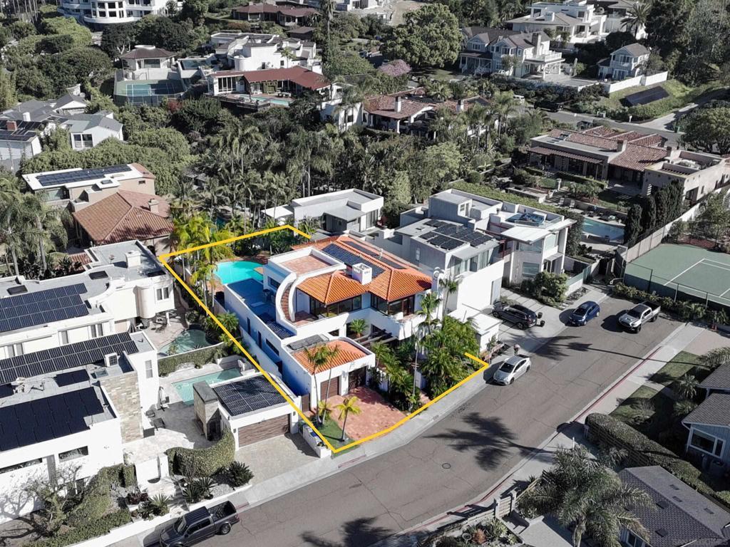 Featured on the cover of San Diego Home & Garden when it was built, this three bedroom, four bath, two story warm Mediterranean contemporary residence is just what you have been looking for. Rare for La Jolla, this home has an extra large finished basement of approximately 1026 square feet. Located on a quiet cul-de-sac in La Jolla Shores, this sun-filled estate is walking distance to beautiful beaches, shops, fine dining and UCSD. You know from the moment you enter the front door and gaze through to the lushly landscaped private front and back yard with pool and spa, that seasoned architect, J. David Hawkins AIA, thought through every detail in this masterpiece. Enjoy sunlight filled intimate family moments as well as flexible spaces that can accommodate small and large gatherings. There are two bedrooms on the main level. The second story features magnificent ocean views and is devoted exclusively to the master suite, a second living room or office/study, with large outdoor terraces filled with panoramic ocean views. The custom designed chef’s kitchen with a spacious center island is a gathering spot for family and features a Gaggenau oven, Wolf cooktop in an island that will become your go-to breakfast spot. 150 windows flood this warm home with natural light. Additionally, there is a wine cellar for 250 bottles. Other features include solar, an oversized 2+ car garage with plenty of built-in shelving and an additional Sub-Zero refrigerator, EV charger ready, security system, a wired surround sound with speakers in the living room and master bedroom, and a rooftop deck for entertaining with incredible ocean views. Enjoy sunlight filled two story ceilings accented by stunning custom Douglas fir beams and Saltillo tile. Ideal as a primary or second home, we invite you to come see for yourself.