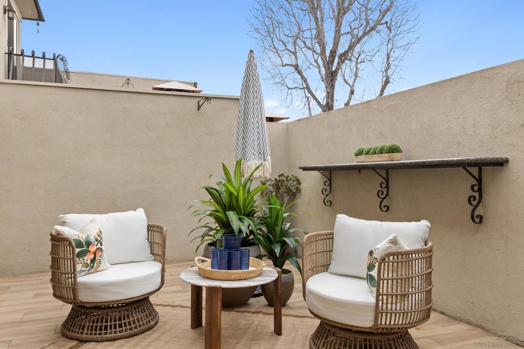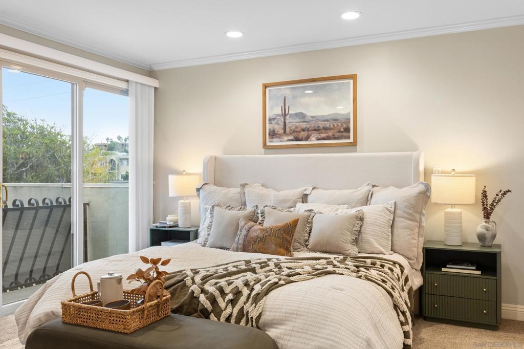Seller will entertain offers between $849,000 - $869,000. Welcome to this move-in ready, beautifully remodeled townhome in the highly sought-after Orleans East community. Just minutes from the beach, this stunning home showcases high-quality designer upgrades throughout. Be prepared to be wowed by the bright, airy open-concept floor plan, enhanced by elegant crown molding and sophisticated recessed lighting, creating a truly refined, designer-inspired feel. The home features 2 bedrooms and 1.5 baths, highlighted by a generously sized primary bedroom complete with its own private balcony. The main level boasts stylish tile flooring, a modern kitchen adorned with striking quartzite countertops, and premium Jenn-Air stainless steel appliances. An electric fireplace insert adds warmth and ambiance, delivering the perfect blend of comfort and contemporary style. Step outside to a large private patio — ideal for relaxing, entertaining, or enjoying San Diego’s beautiful climate. Everyday living is effortless with an attached direct-entry two-car garage plus additional driveway parking. Residents enjoy the community pool, while the prime location offers outstanding proximity to major freeways (5, 8, 805, and 163), along with easy access to the shops, dining, and vibrant coastal lifestyle of Point Loma and Ocean Beach. VA approved complex