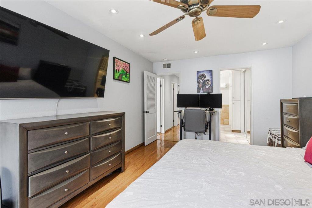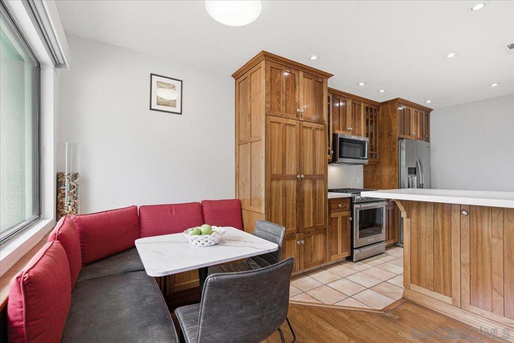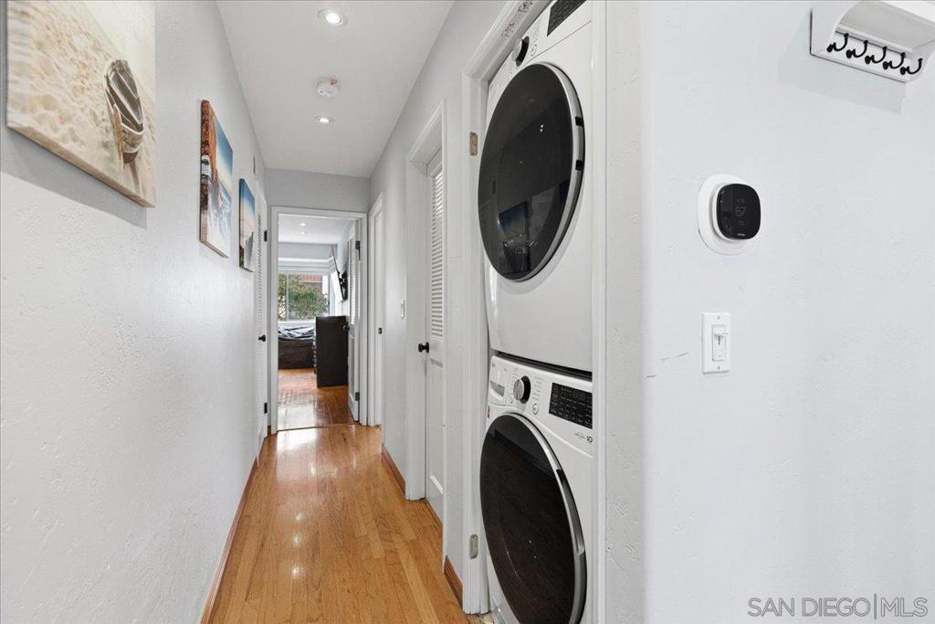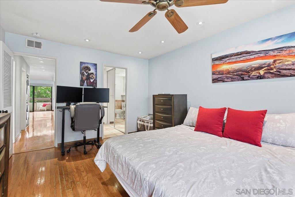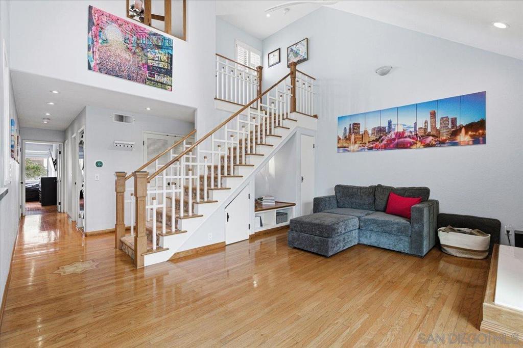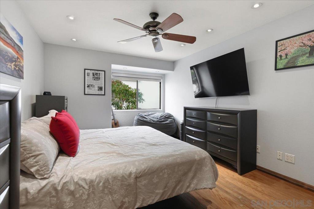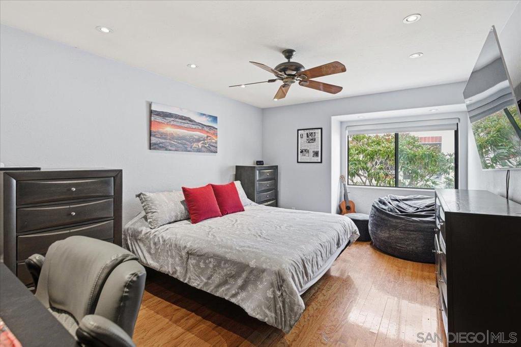 Experience elevated townhome living in the heart of Downtown’s prestigious Marina District within the coveted Park Row community. This exceptional second-story residence welcomes you with rich hardwood floors, soaring ceilings, and an airy open-concept design that blends sophistication with warmth. The expansive living room is illuminated by oversized windows and skylights, while a striking walnut-trimmed fireplace with art tile detailing creates an elegant focal point. A versatile dining area flows seamlessly into the timeless kitchen, thoughtfully appointed with custom black walnut cabinetry, quartz countertops, gas cooking, and refined finishes throughout. Oversized sliding glass doors extend the living space outdoors to a private balcony, where city views stretch toward Seaport Village and the Bay, an ideal setting for effortless indoor-outdoor entertaining. A custom-designed staircase leads to a bright, architectural loft featuring a built-in executive office for two (or bedroom), complete with solid wood desks, extensive bookcases, and integrated storage. A second set of sliding doors opens to an exclusive rooftop deck—perfect for sunset views and starlit evenings above the city. The private primary suite offers a tranquil retreat with a generous jetted soaking tub and a recently remodeled spa-inspired shower. Additional highlights include central air conditioning, in-unit laundry, recessed lighting, and abundant storage. Park Row residents enjoy lush park-like grounds adorned with sparkling fountains, a resort-style pool and spa, secured underground parking, 24-hour gated security, and ample guest parking, all just moments from waterfront dining, Seaport Village, The Rady Shell, Petco Park, the Gaslamp Quarter, the Convention Center, Balboa Park, and San Diego International Airport. A rare opportunity to enjoy refined townhome living in one of Downtown’s most distinguished locations.