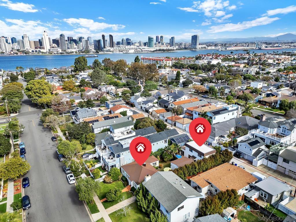 A rare offering in Coronado Village, 241–243 F Avenue presents two separate residences thoughtfully positioned on a generous 7,000 sq. ft. lot just moments from the Bay and the Ferry Landing. The front home, originally built in 1943, is a single-story 3-bedroom, 2-bath residence offering timeless character and everyday livability. Hardwood flooring, an inviting street presence, driveway parking, a one-car garage, and a private backyard create a comfortable setting in a highly desirable Village location. Positioned toward the rear of the property, the second residence is a two-story home built in 1971, also offering a three-bedroom, two-bath layout with one bedroom conveniently situated on the main level. The home features an inviting living space with sliding doors opening to a private backyard, along with a full bath and dedicated laundry. Upstairs are two additional bedrooms, including the primary bedroom with direct access to a private deck overlooking the downtown San Diego skyline. Three dedicated parking spaces further enhance functionality and ease of living. The generous 7,000 sq. ft. R1B-zoned parcel presents meaningful long-term potential, including possible redevelopment into two side-by-side residences, subject to buyer due diligence and City approvals. The property has also received a non-historic determination from the Historic Resource Commission, offering added clarity for those considering future renovation or reconfiguration. A unique and compelling opportunity in one of Coronado Village’s most sought-after locations, rich with possibility. Front House is 1,156 SF and Back House is 1,270 SF per Matterport. Matterports are available for both residences, see virtual tour links.