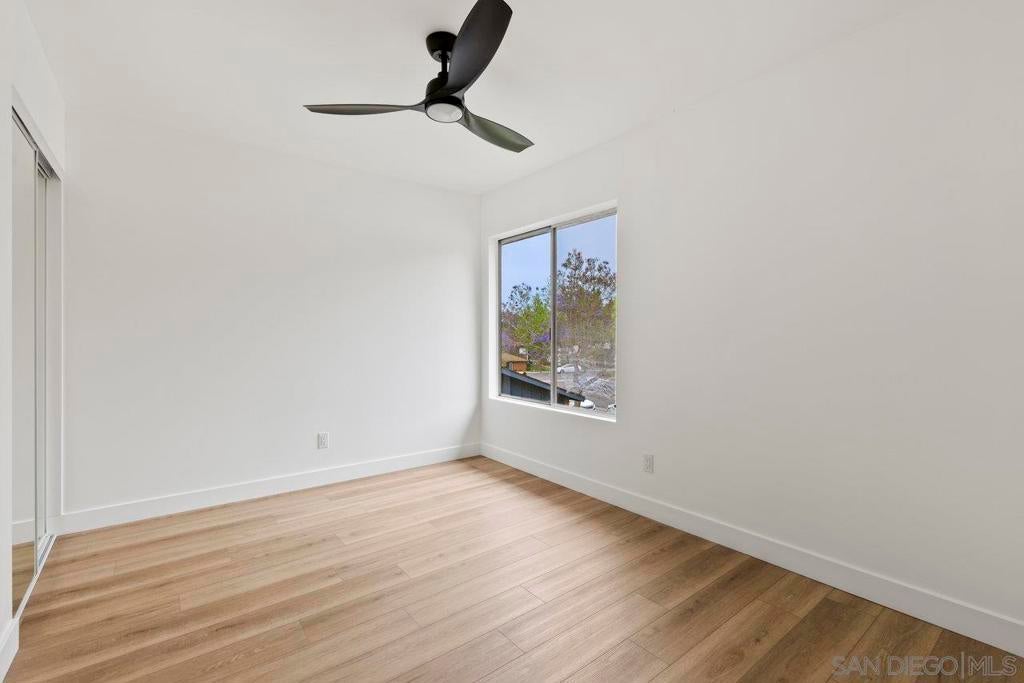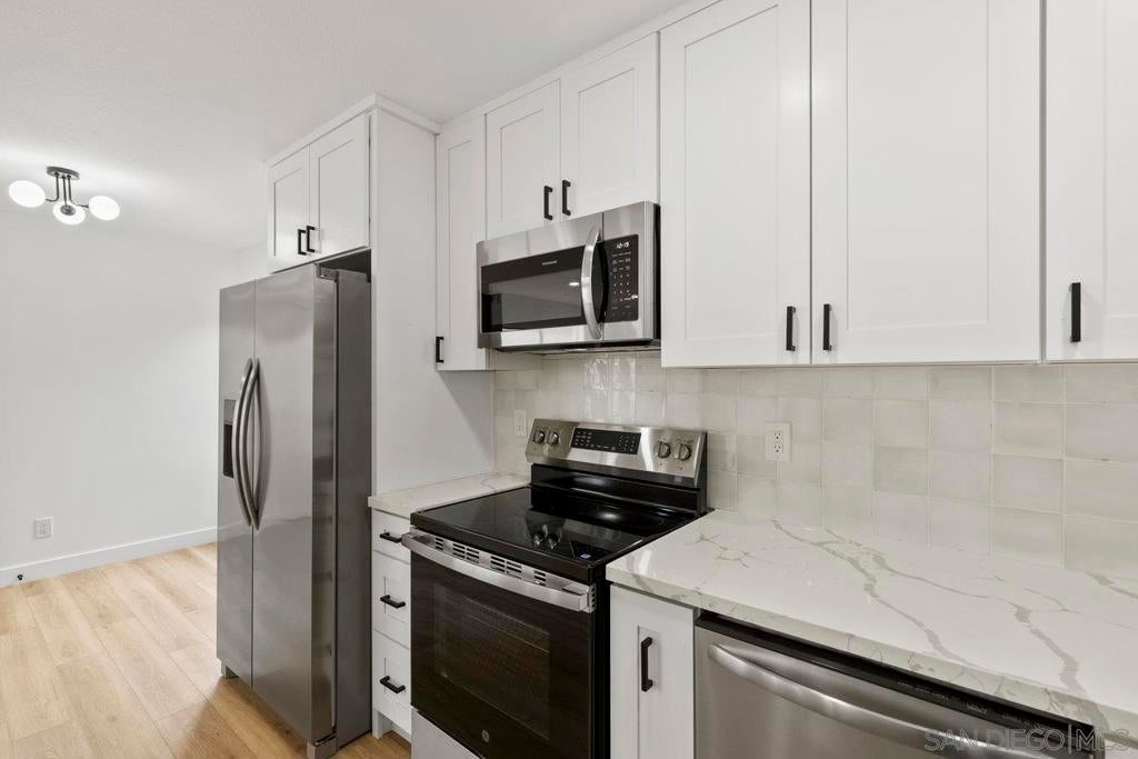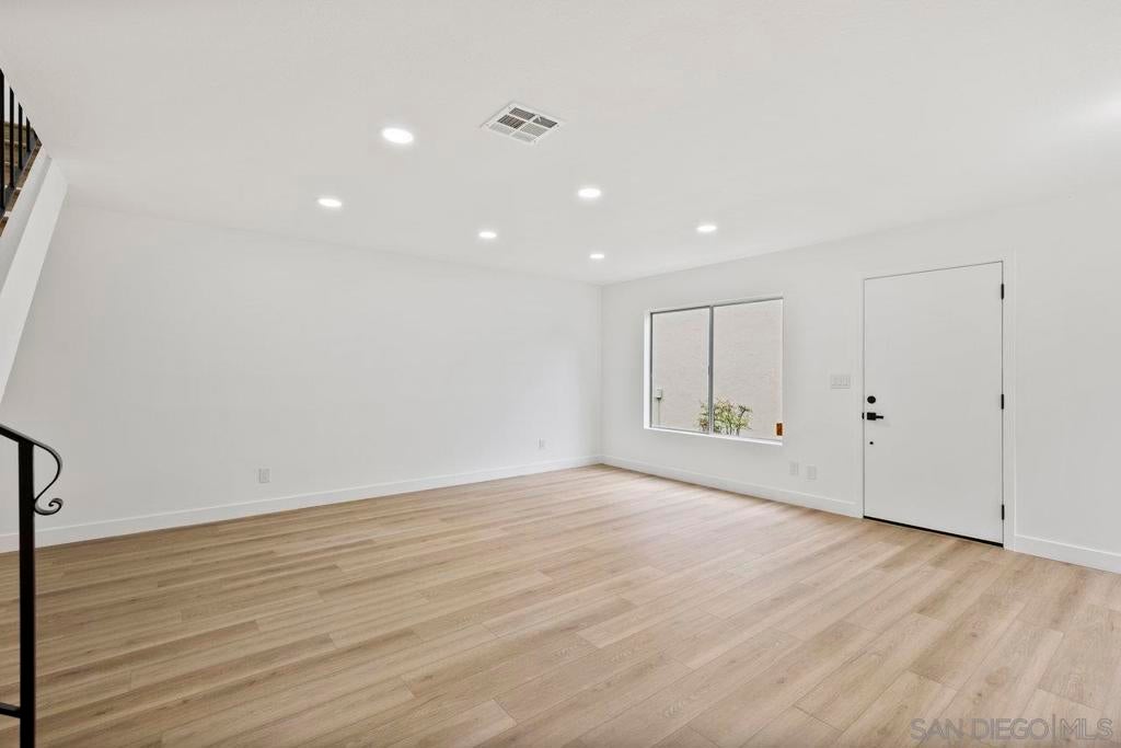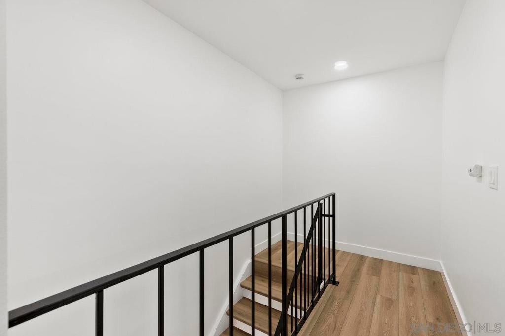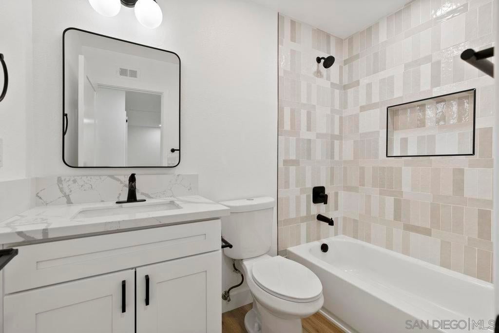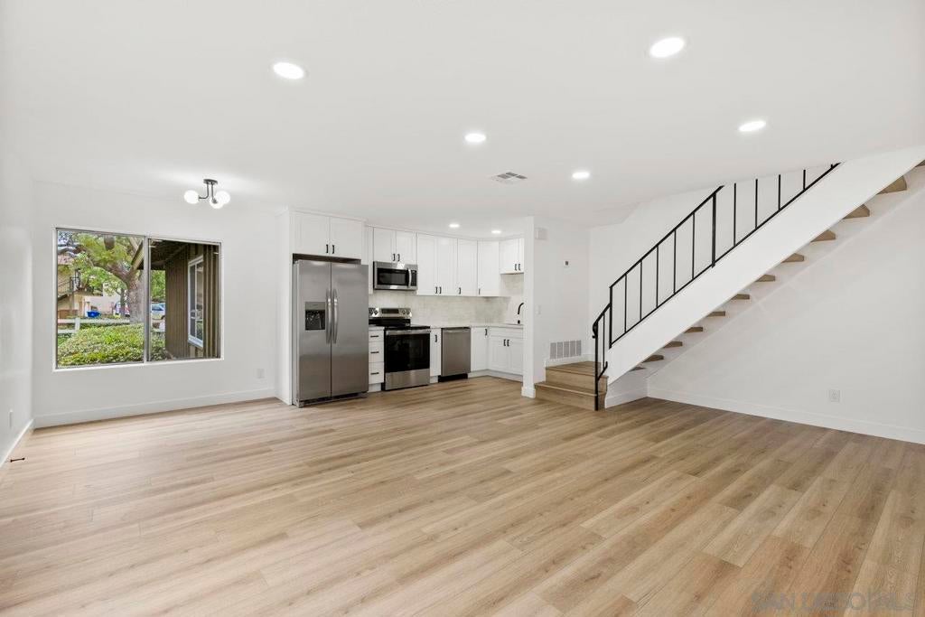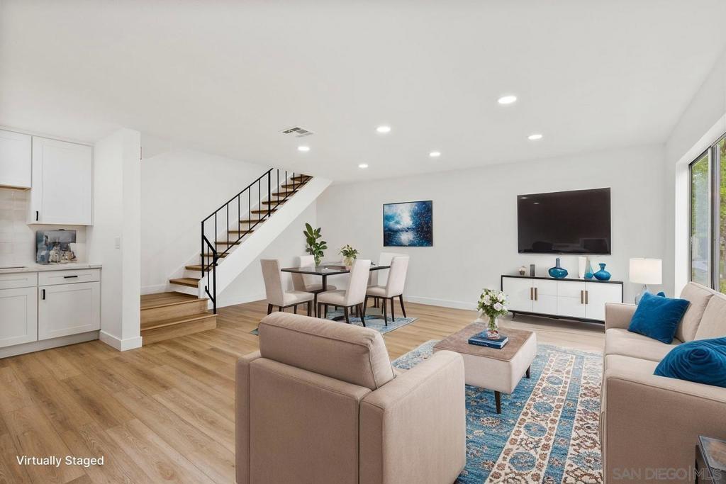 Highly upgraded 2-story, 2-bedroom, 1-bath condo located in the desirable Peñasquitos Villas community, tucked at the end of a quiet cul-de-sac in Rancho Peñasquitos. This thoughtfully remodeled home offers a fresh, modern feel with luxury vinyl plank flooring throughout both levels, wide baseboards, and all-new interior paint-including closets-for a crisp, cohesive look. Refurbished handrail complements the updated staircase, and new \recessed lighting in the dining and living areas enhances the bright and open ambiance. The fully remodeled kitchen is both stylish and functional, featuring all-new cabinets, quartz countertops, a new sink and faucet, new tile backsplash, brand-new appliances, and updated lighting that highlights the quality of the finishes. The adjacent dining area blends seamlessly with the living space, making it ideal for everyday living and entertaining.Upstairs, you'll find two comfortable bedrooms with ceiling fans and mirrored closet doors. One bedroom overlooks a blooming Jacaranda tree, offering a peaceful touch of greenery just outside the window. The beautifully renovated bathroom includes a new vanity with a quartz countertop, new sink and faucet, new toilet, new tub and fixtures, and a custom tile tub/shower enclosure with a clean, modern finish. Additional features include all-new interior doors, a hallway linen cabinet, an extra upstairs storage closet, and a shared one-car garage. The location is both peaceful and convenient with no road noise. This move-in-ready home combines comfort, quality upgrades, and a great Rancho Peñasquitos locatio Highly upgraded 2-story, 2-bedroom, 1-bath condo located in the desirable Peñasquitos Villas community, tucked at the end of a quiet cul-de-sac in Rancho Peñasquitos. This thoughtfully remodeled home offers a fresh, modern feel with luxury vinyl plank flooring throughout both levels, wide baseboards, and all-new interior paint-including closets-for a crisp, cohesive look. Refurbished handrail complements the updated staircase, and new \recessed lighting in the dining and living areas enhances the bright and open ambiance. The fully remodeled kitchen is both stylish and functional, featuring all-new cabinets, quartz countertops, a new sink and faucet, new tile backsplash, brand-new appliances, and updated lighting that highlights the quality of the finishes. The adjacent dining area blends seamlessly with the living space, making it ideal for everyday living and entertaining.Upstairs, you'll find two comfortable bedrooms with ceiling fans and mirrored closet doors. One bedroom overlooks a blooming Jacaranda tree, offering a peaceful touch of greenery just outside the window. The beautifully renovated bathroom includes a new vanity with a quartz countertop, new sink and faucet, new toilet, new tub and fixtures, and a custom tile tub/shower enclosure with a clean, modern finish. Additional features include all-new interior doors, a hallway linen cabinet, an extra upstairs storage closet, and a shared one-car garage. The location is both peaceful and convenient with no road noise. This move-in-ready home combines comfort, quality upgrades, and a great Rancho Peñasquitos location.