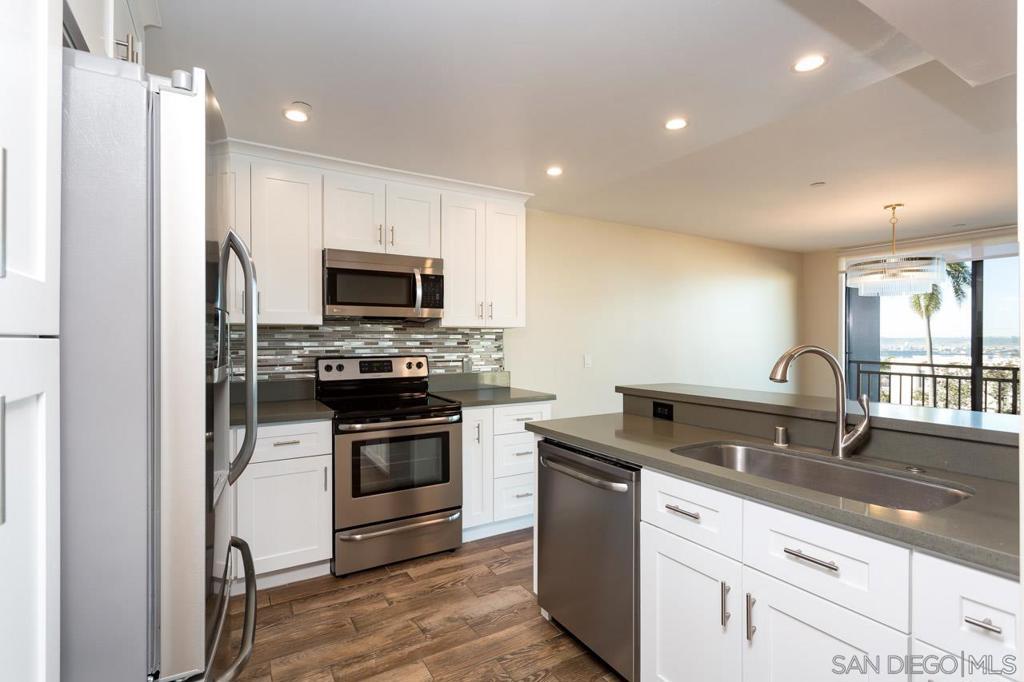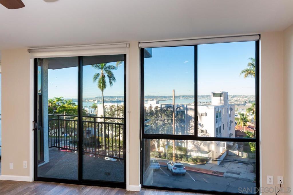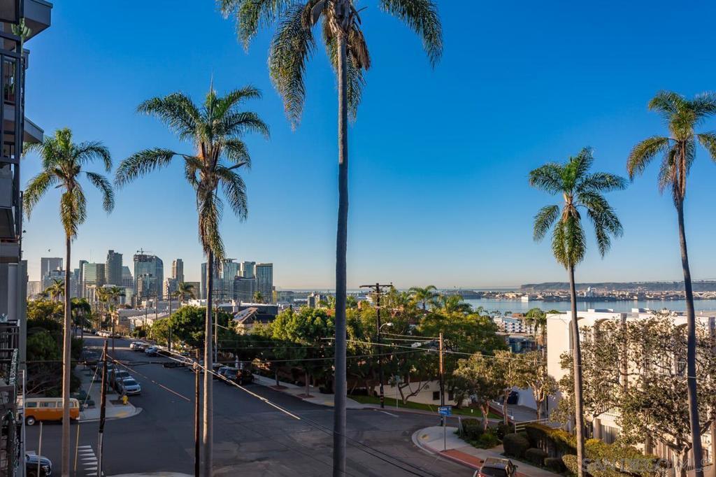 Stunning 2BR/2BA Bay Vu condo in the heart of Bankers Hill offering approximately 1,310 sq ft with panoramic bay, water, and city views from multiple living areas. This light-filled home features an open-concept layout connecting the living room, dining area, and gourmet kitchen with white shaker cabinets, quartz countertops, and electric cooking. The spacious primary suite includes a modern en-suite bath with dual vanity and soaking tub/shower combo. Washer and dryer in unit. Two underground parking spaces included. Bay Vu amenities include spa, exercise room, and parking garage with EV charging capabilities. Water, trash, and HOA dues included. Small pet OK (35 lbs and under). Available now.