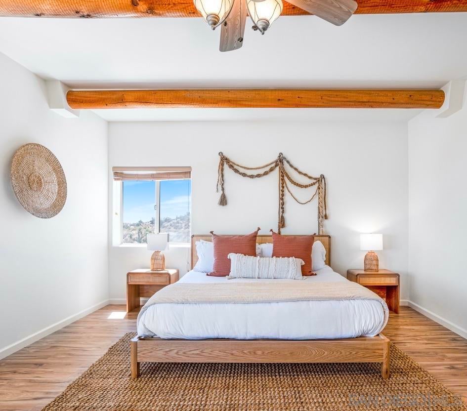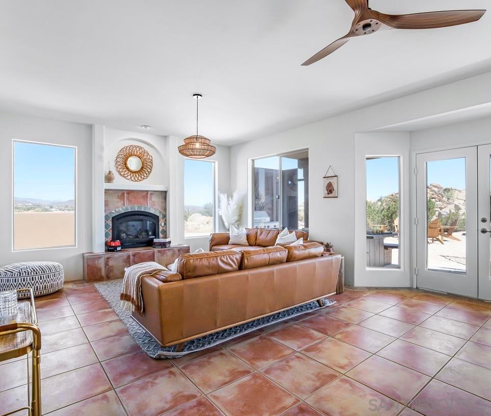 This adobe-style home sits perched on a hill surrounded by boulders. The 360 degree views will take your breath away, especially during sunrise and sunset! This home was completely updated with a classy bohemian style in 2022. This bright and airy home feels like a warm hug! After entering the house through the adobe-style gates, you will find private courtyard. Once inside the home you will find 2 living areas, formal dining, a beautiful kitchen, a half bath and a laundry room. Make your way upstairs to the designated work space located in the common area. Also upstairs is the large primary suite with an ensuite bathroom with sunken bathtub. The highlight of the primary suite is a large private patio with sun loungers. Also upstairs are 2 additional bedrooms and an additional full bath. The two guest bedrooms share a large patio as well.