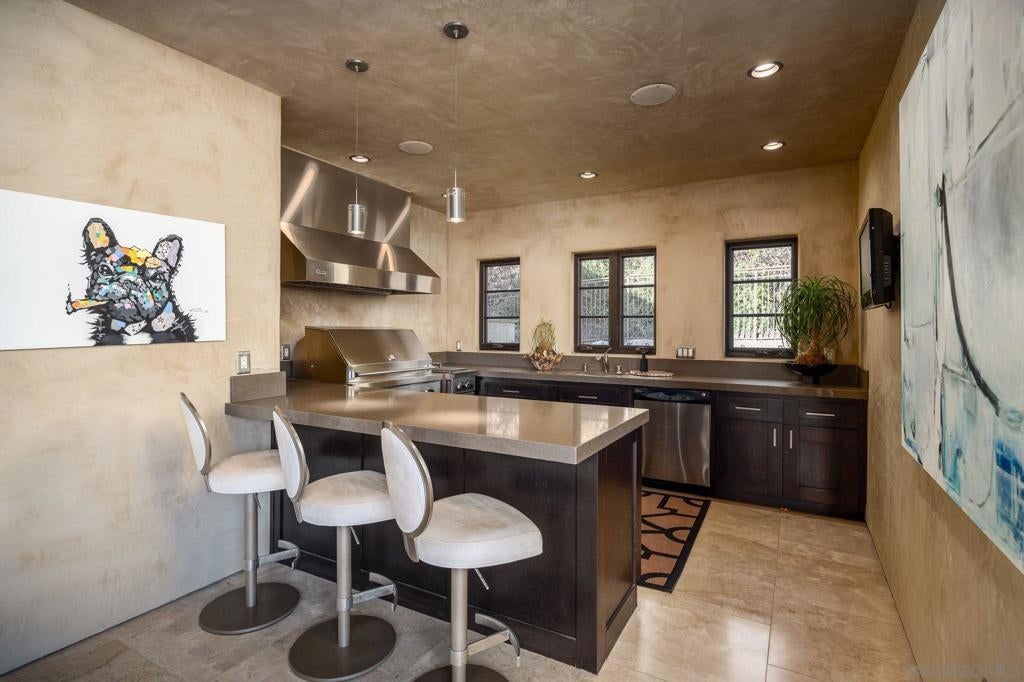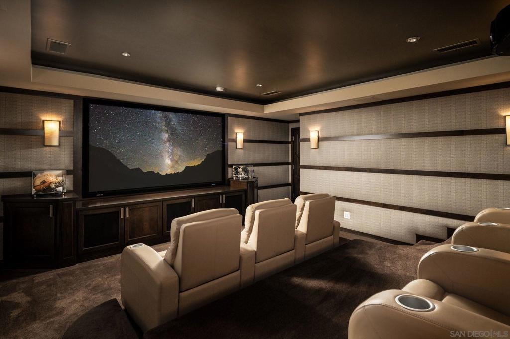 Resting behind the gates and above the 13th green of the award winning Santaluz golf course, this home blends timeless design with effortless California living. Vaulted and groin ceilings, arched passages, hand-finished stone, and rich wood beams create interiors that feel both elevated and inviting, while walls of glass frame uninterrupted fairway views. The elegant kitchen—anchored by Taj Mahal quartzite, tailored cabinetry, and top of the line appliances—opens seamlessly to refined gathering spaces designed for intimate evenings and elegant entertaining. The 1st floor master suite is a private sanctuary with marble finishes, heated floors, dual dressing rooms, and its own fireplace. A guest casita, home theater, wine cellar, executive office, and billiards lounge complete the experience. As you step outside, you'll find a saltwater pool and spa, culinary pavilion, outdoor fireplace, and citrus grove unfold against panoramic golf course vistas—creating a setting that feels quietly resort-like. Owned solar, integrated Savant smart-home technology, advanced water filtration, and energy-efficient systems are seamlessly woven into the home’s timeless aesthetic, delivering modern sustainability without compromise. An elevated retreat within the gates of Santaluz—where design, privacy, and lifestyle align.