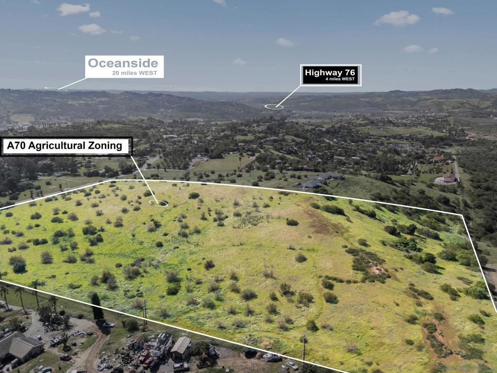 Rare 20-acre agricultural opportunity on Lilac Road in Bonsall. Zoned A70 and located in the unincorporated area of San Diego County, this parcel offers paved main road frontage, electricity on site, and a high-capacity agricultural water system already in place. Previously leased for commercial strawberry production by Marie Callender's, the property has a history of productive farming use. Approximately 1 mile from Bonsall High School and about 6-7 miles to the Interstate 15 corridor, the location provides a blend of rural privacy with convenient access to major transportation routes. Zoned A70 with potential for agricultural use and residential development subject to county approval. Buyer to verify zoning, lot split potential, utilities, and all development possibilities with San Diego County. A unique opportunity for growers, investors, estate home builders, or land bankers seeking North County acreage with infrastructure in place. provides a blend of rural privacy with convenient access to major transportation routes. Zoned A70 with potential for agricultural use and residential development subject to county approval. Buyer to verify zoning, lot split potential, utilities, and all development possibilities with San Diego County. A unique opportunity for growers, investors, estate home builders, or land bankers seeking North County acreage with infrastructure in place.