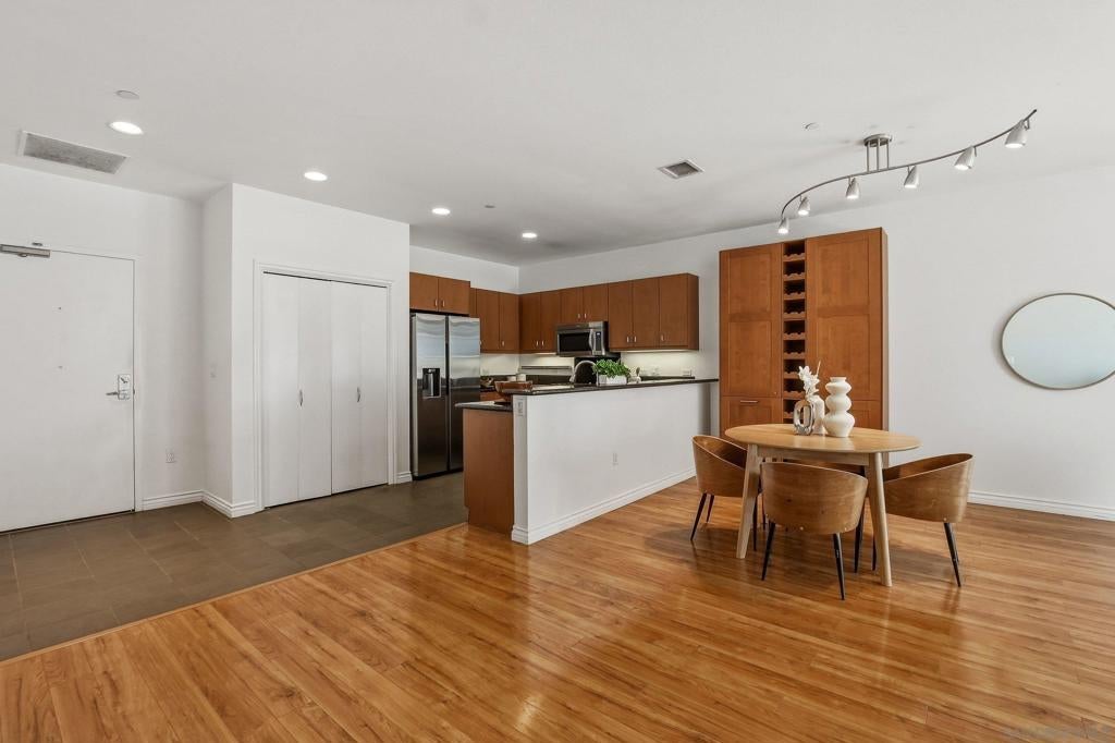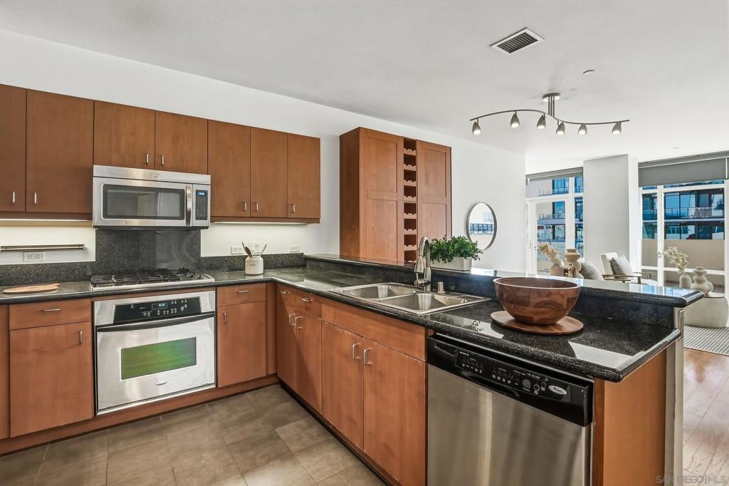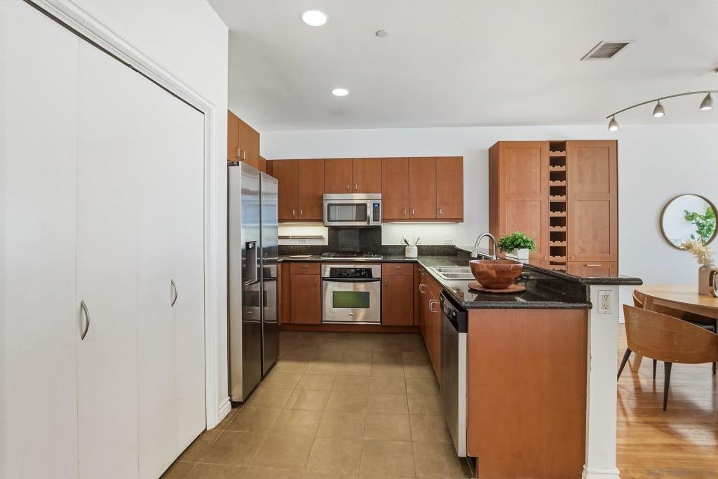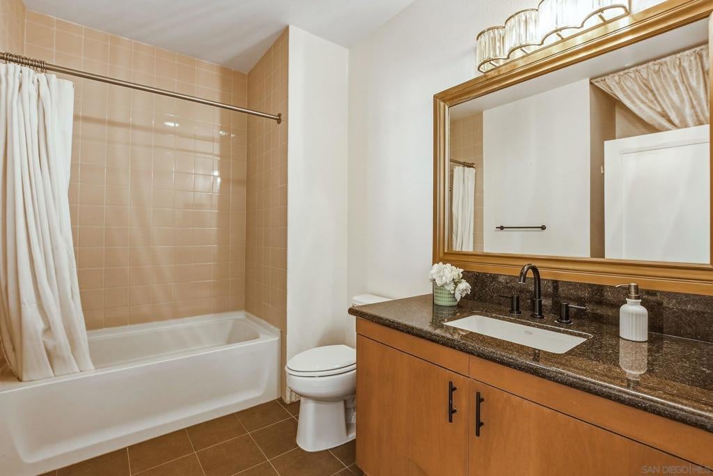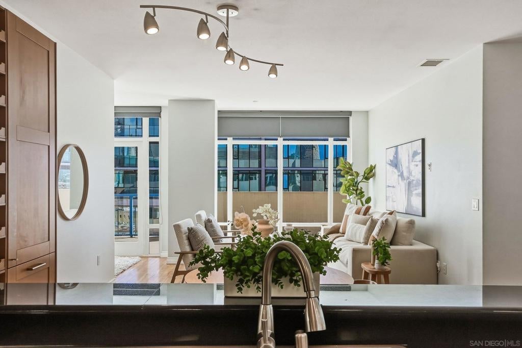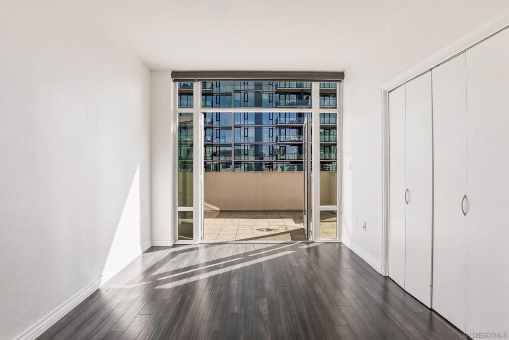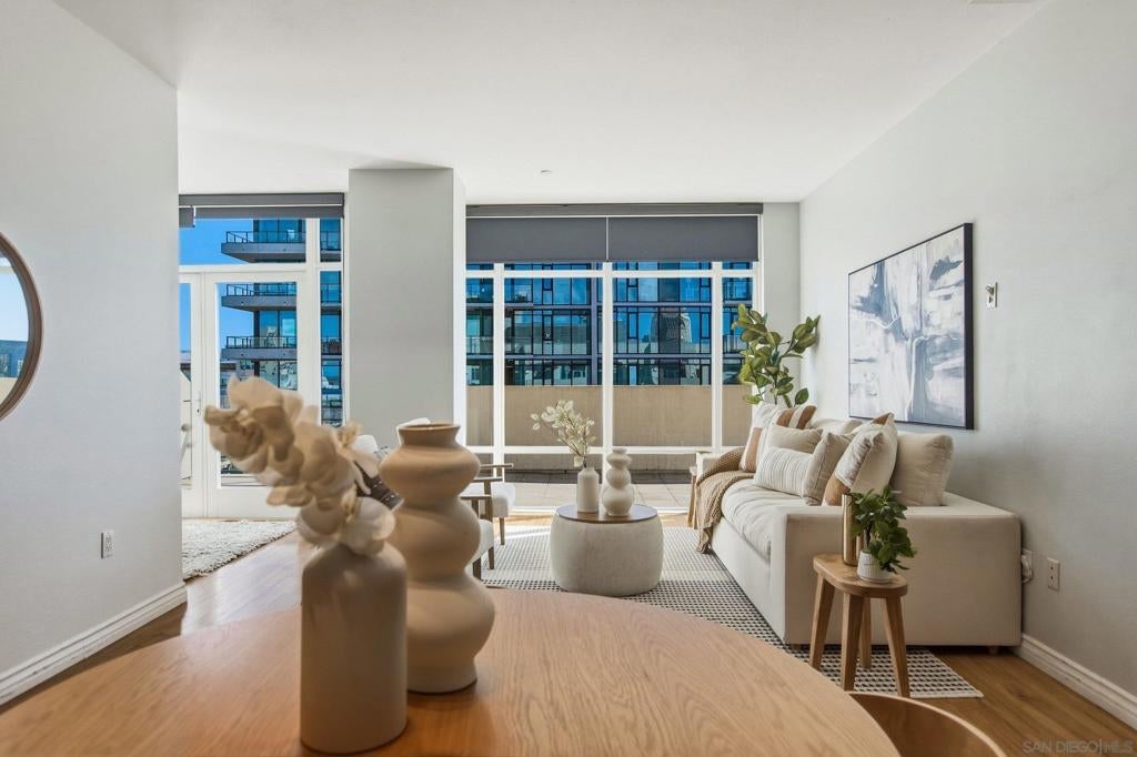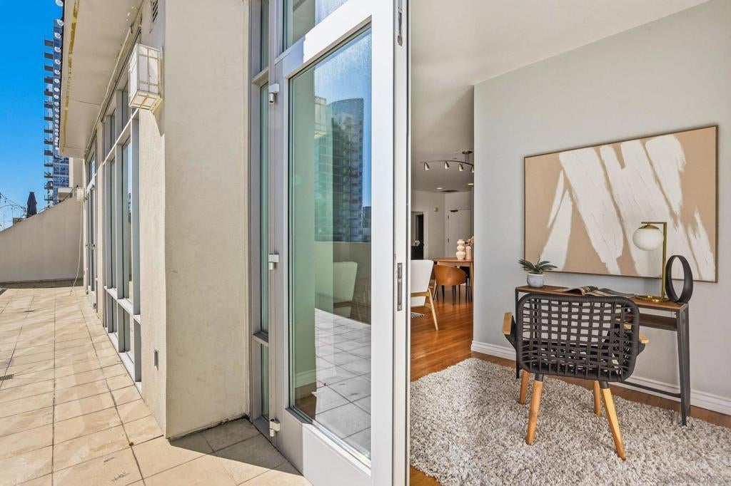 Welcome to elevated downtown living in this rare top-floor residence offering 2 bedrooms, 2 bathrooms, plus a dedicated space perfect for a home office. With no units above, this 1,294 sq. ft. home provides privacy, natural light, and seamless indoor-outdoor flow in the heart of the city. The open-concept layout connects the kitchen, dining, and living areas, flowing effortlessly onto an oversized private-use patio that spans the entire length of the unit. This is a unique and exceptional extension of the living space and ideal for entertaining, relaxing, or enjoying San Diego’s year-round weather. Expansive windows fill the home with natural light, enhancing the bright and airy feel throughout. The oversized primary suite features a generous walk-in closet and well-appointed bath, while the secondary bedroom and full bath offer flexibility for guests or additional workspace. Additional highlights include in-unit laundry and two side-by-side parking spaces conveniently located near the elevator. Residents enjoy access to community amenities including a fitness center and a shared outdoor patio with grill. Ideally situated just a few short blocks from the energy of the Gaslamp Quarter and the Ballpark District, this home offers unbeatable access to dining, entertainment, and city life while still providing a private retreat above it all.