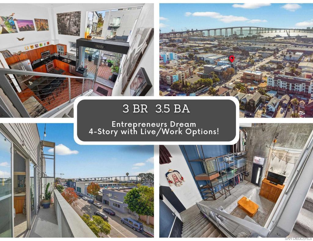 Come check this...extraordinary 4-level live/work industrial loft in Barrio Logan that seamlessly blends architectural drama with refined urban living. Designed for flexibility, the home offers 3 en-suite bdrms and a versatile 2nd floor open space perfect for an office, studio, or 4th bdrm. Defined by 20-foot soaring ceilings, the living room with view balcony is open to the stylish kitchen with large patio. The street level entry space uniquely accommodates a potential client-facing business making it ideal for entrepreneurs seeking a true live/work lifestyle. Take in iconic views of the Coronado Bridge, Downtown SD, Petco Park, and the San Diego Bay from two balconies. All of this can be yours just moments from breweries, restaurants, and the Mercado grocery store, with effortless access to the San Diego Convention Center and Petco Park. Completing the home is a private two-car garage with stacked parking capability or storage via a power lift system. A rare and distinguished offering in one of San Diego’s vibrant and walkable neighborhoods—where design, flexibility, and lifestyle converge.