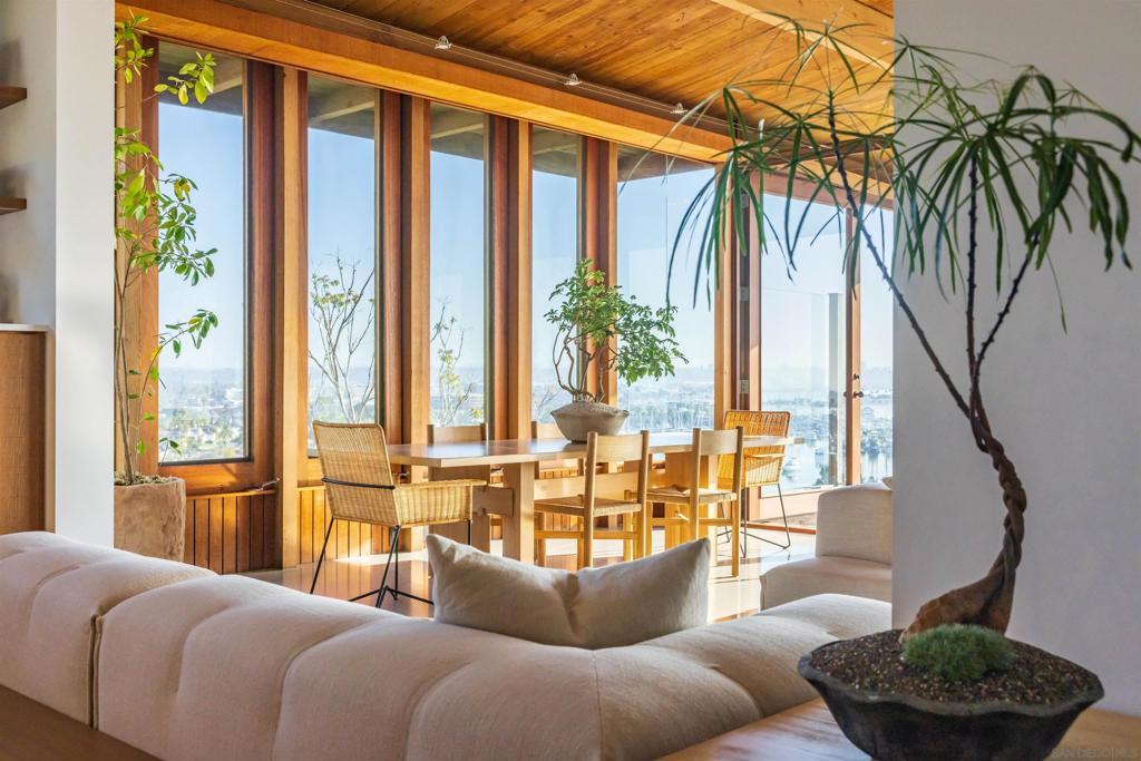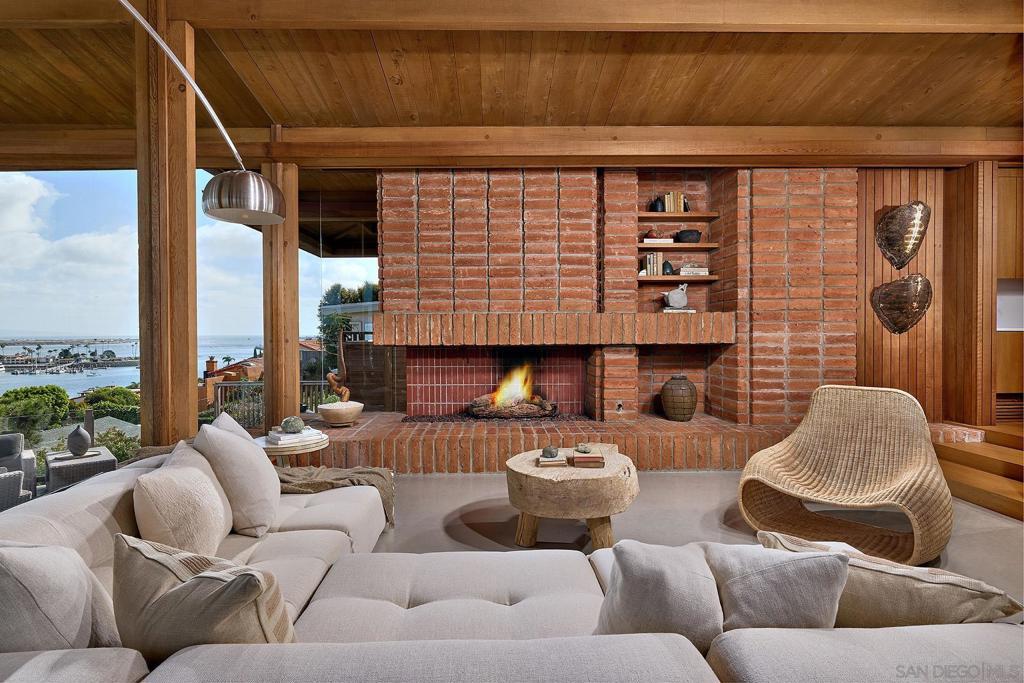Organic architecture at its most livable. Impeccably designed and soulfully updated, this Kendrick Bangs Kellogg-designed house in La Playa fuses artistry with lifestyle. Intoxicating views frame the marina, downtown skyline, Coronado Bridge & beyond. Restored w/ every modern amenity, the sanctuary is grounded by a textural material palette: timber, concrete & Kellogg’s signature brick fireplace. The floor plan balances social scale w/quiet retreat. The neighborhood mixes old & new w/buzzy coffee shops. Architectural Distinction San Diego architect Kendrick Bang Kellogg designed striking structures—some of the most celebrated ever built—seeking to blend them with their natural environments. Here is one of the earlier examples of his nature-inspired work, featuring plate glass and rough-sawn wood. The house was designed by Kellogg in 1968 and thoughtfully restored in 2021, ensuring its architectural narrative will endure for generations. Anchored on the hillside of Point Loma’s historic La Playa neighborhood, the house is warm, textural, and an organic extension of the landscape. The interplay of natural materials and light reinforces the San Diego Harbor connection, offering a connected living experience that enriches daily rhythms. There’s a mix of soaring and more intimate spaces; the double-height living and dining area draws families together around the massive fireplace. Also a focal point: James Hubbell’s stained glass art creates a rhythmic pattern of color and light in the foyer. Striking a balance between independence and togetherness, the primary bedroom is a front-row retreat, while ensuite bedrooms rest along the eastern edge, set apart for privacy. Three separate bedroom zones create spatial complexity and a subtle separation that promotes household peace and harmony. Landmark Views Situated at the end of the road, the house is crafted to dramatically embrace the breadth of its site, presenting an expansive facade to the harbor. There’s a magical quality of natural light from the moment the sun rises until it sets, then allowing the moonlight to take over. Views frame the quiet excitement of the marina, Downtown San Diego’s skyline, and the Coronado Bridge. In winter, there are snow-capped mountains to the east. Indoor-outdoor spaces create a sanctuary to sit back and survey the world around you. Views embrace the harbor setting, which gently unfolds in a rhythm of daily life. Sailing classes. Regattas. The freedom of a lone Hobie Cat as it sets off on a twinkly sea. The Neighborhood Point Loma has an enviable mix of old-world charm and new-era verve. The house is close to buzzy coffee shops and restaurants, as well as Kellogg Beach, Southwestern Yacht Club, San Diego Yacht Club, and Point Loma Nazarene. Liberty Station is both an arts district and a vibrant dining destination.