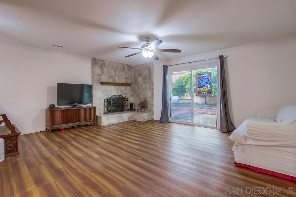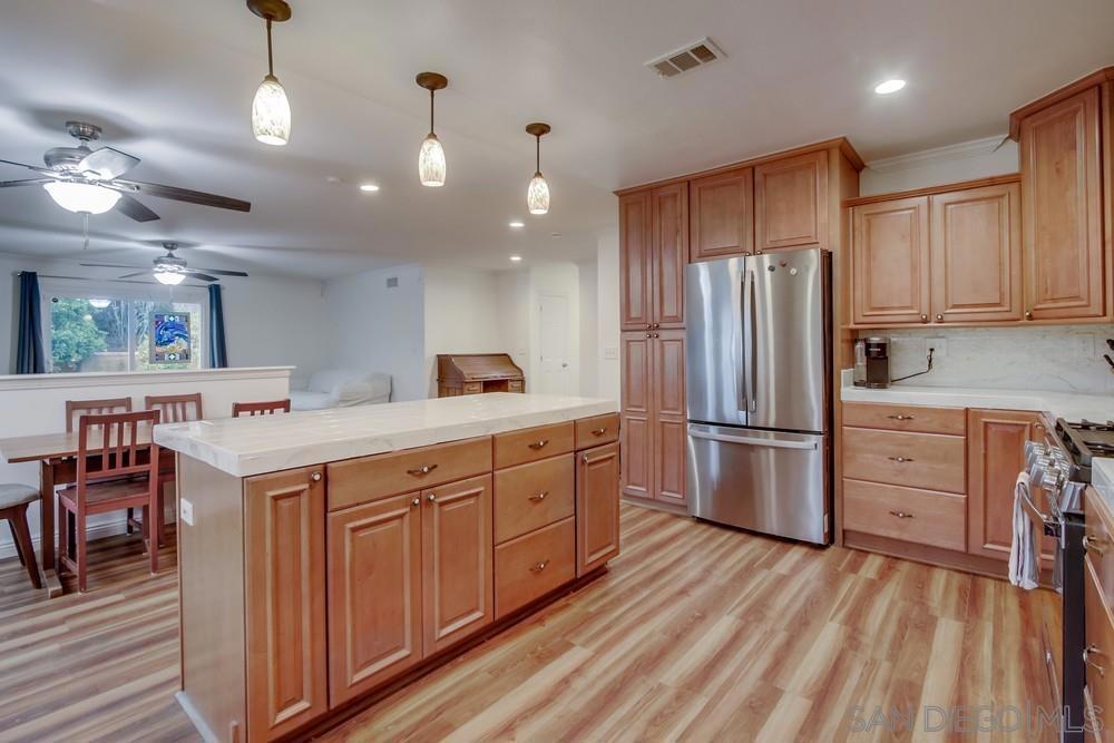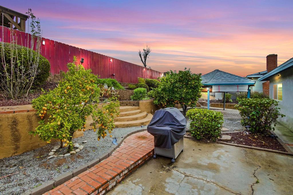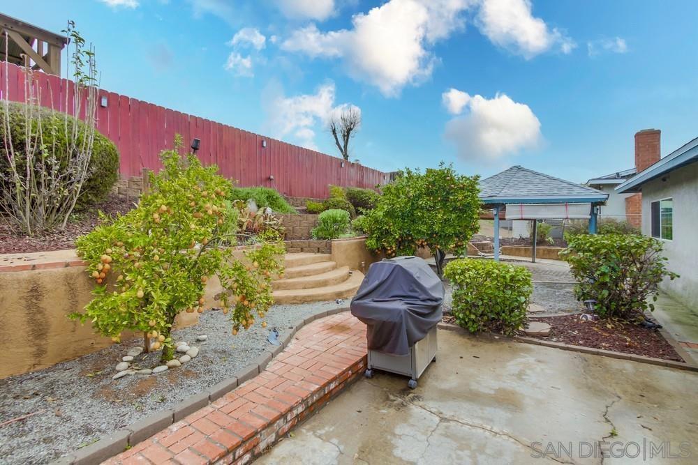 This thoughtfully upgraded, single-level home offers 1,404 square feet of well-designed living space, featuring three spacious bedrooms and two modern bathrooms. Move-in ready with fresh paint and quality finishes throughout, the home perfectly blends comfort and style. The open-concept layout flows seamlessly between the dining, kitchen, and living areas, all enhanced by durable luxury vinyl plank flooring, making it ideal for daily life and hosting. The bright family room is anchored by a cozy fireplace, while the standout kitchen is a chef’s dream, boasting a large center island, upgraded cabinetry, a new sink, and modern stainless steel appliances. Year-round comfort is ensured thanks to recent upgrades, including newer dual-pane windows, updated interior doors, and a recently installed central air conditioning system. Outside, the property shines with beautiful front-yard curb appeal. The expansive backyard serves as a private escape, featuring a shaded gazebo, an efficient irrigation system, and a bounty of mature fruit trees, including orange, tangerine, mandarin, and loquat. Parking is a breeze with a spacious two-car garage and a generous driveway. Situated in a highly desirable Santee neighborhood, you are just moments away from excellent schools, local shopping, dining, Santee Lakes, and popular hiking trails. Best of all, you can enjoy these benefits with no HOA or Mello-Roos fees. This home combines charm, convenience, and comfort, don't miss your chance to make it yours!