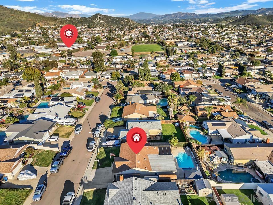Discover a perfect blend of Southern California throughout this beautiful home. The exterior boasts mountain views and open sky across a manicured lawn. The back offers the intimacy of a private cabana with sparkling pool heated by solar panels steps away from fruit trees. The side yard is a perfect area for trailers, toys, or additional storage with a large access gate to the front. From the moment you arrive, you’ll feel the pride of ownership throughout this great home. Step inside to a light filled interior featuring an open floor plan and luxury vinyl plank flooring that creates a modern, cohesive look from room to room. Enjoy the private living room away from the everyday business, welcomed by views of the surrounding mountains all from the comfort of your home. Then explore the open concept layout flowing effortlessly into the kitchen, where the bar top seating creates the perfect hub for entertaining, casual dining, or keeping everyone connected while you cook. The spacious family room immediately draws you in with its striking wood beamed ceiling, adding warmth, charm, and timeless character. This inviting space is ideal for relaxing evenings or lively gatherings. Whether you're hosting friends or enjoying a quiet night at home, this layout was designed for both comfort and connection. All of this, set in the heart of Santee, makes this home an incredible opportunity you won’t want to miss.