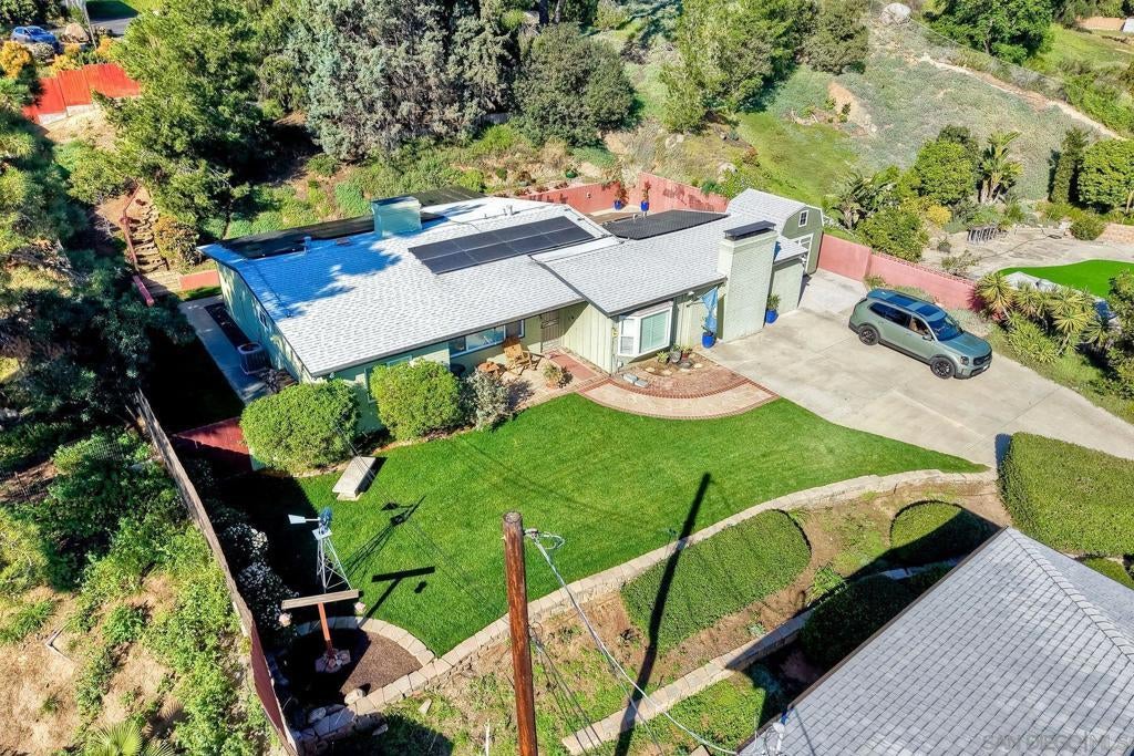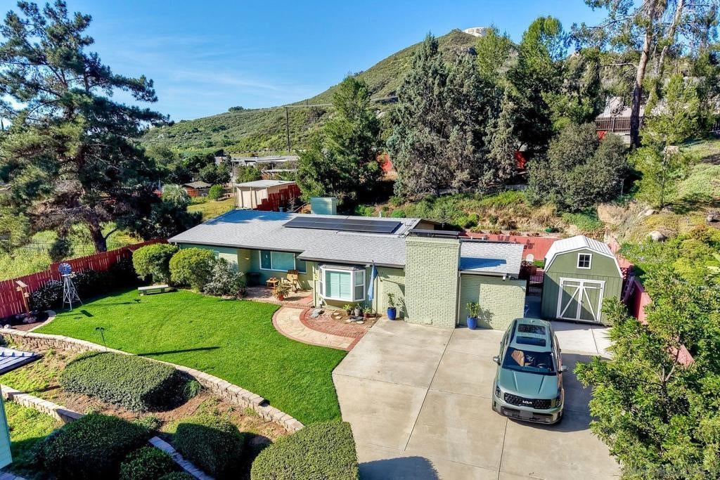 2 incredible homes equal huge opportunity on a large sloping 1/2 acre lot, plus finished 3-car conditioned garage/ workshop . The original home is a single-level ranch home high on slope with 3bd /2ba (2269sf) and large backyard . The newer 2019 home is nearly 1000sf above a fully finished 3 car garage permitted as 2bd/1ba . The large garage has been fully finished with drywall, lighting, and AC and is ideal space for home business or additional unit . Barn storage unit conveys to buyer and provides additional storage. Surrounded by mature trees and mountain vistas, this property is ideal for a multi-generational family to share and still have plenty of privacy and space, or for owner to live in one home and rent the unit. Parking for 10+ cars! Upgrades include paid solar(!), hardwood floors, new windows throughout, beautiful new kitchen, immaculate new landscaping, separate dining room, a formal living room, and huge family room with a 25' stone fireplace! Each home has own driveway with separate parking areas for 3-5 cars and privacy. New owner could possibly convert some of the garage space to a Jr. ADU for a total of 3 living spaces. The front home offers a covered patio at the back with an open lawn area and plumbed fire-pit before rising to a hillside and additional flat usable space at rear of lot, with mature landscaping. Newly fenced backyard is accessible with stairs at top of lot. SCHOOLS: Steele Canyon High or Valhalla High is just 4 blocks away, are both in the highly rated Grossmont School District. Rancho San Diego Elementary and Hillsdale Middle School are also or a short walk or bike ride nearby. NOTES: The new ADU above garage is currently 972sf 1bd/ 1ba home with a full kitchen, separate dining area, and vinyl flooring throughout. 2nd bedroom is easily created with a single 12' non-load bearing wall in what is currently open office space (see plans). Contractor quote to add wall is available. SOLAR: The new home above garage includes owned solar panels installed in 2019 and larger home also has leased solar panels ($145/mo). Buyer must qualify to take over Sun Run lease. A new 200A electrical panel and separate sub-panel serves both homes off of a single meter.