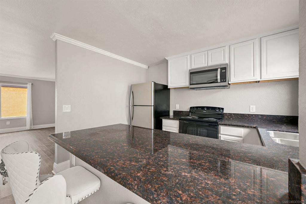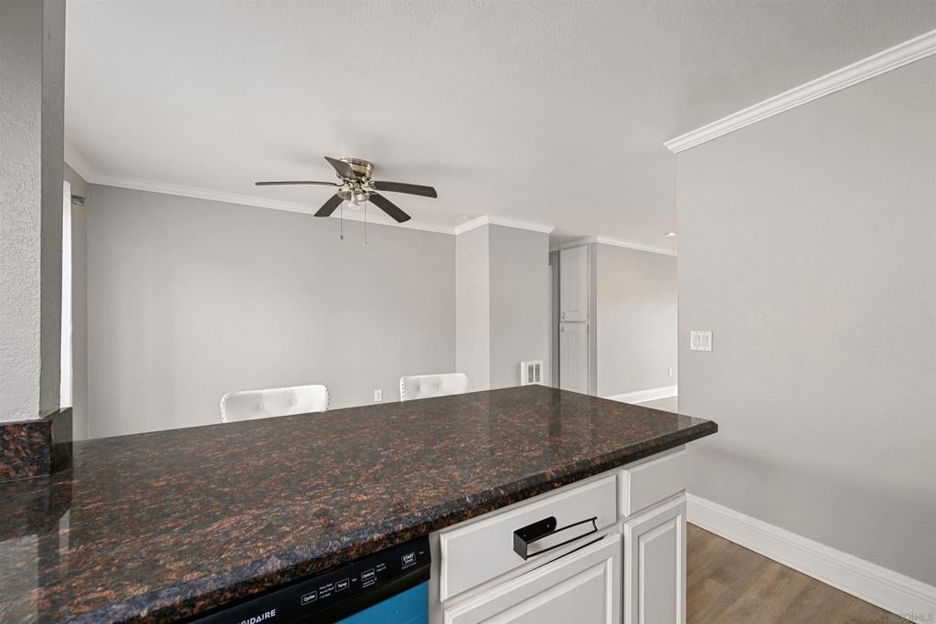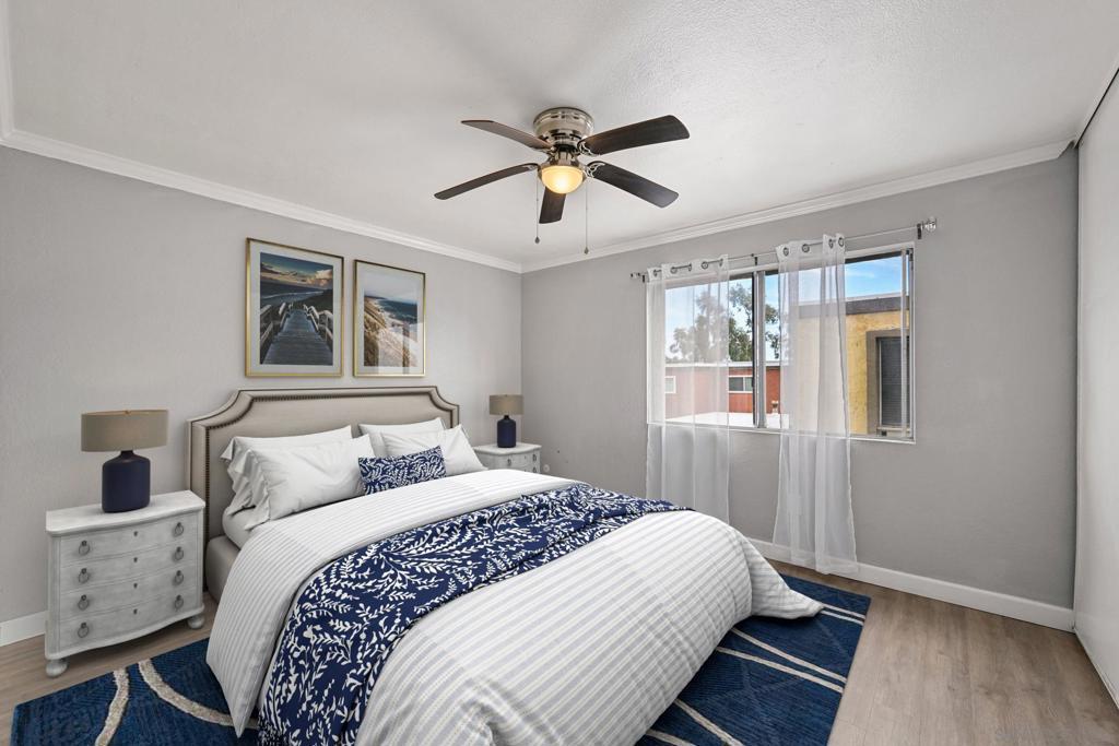 This light and bright residence has been beautifully upgraded with crown molding, elegant baseboards, and stylish laminate flooring throughout. The open-concept kitchen features abundant cabinetry, sleek granite countertops, and flows seamlessly into the dining area—perfect for both everyday living and entertaining guests. Both bedrooms offer comfortable personal retreats with ample closet space and natural light. Ideally situated within the gated community of Harbor Vista, this home is conveniently located near the pool, spa, and community laundry facilities. Welcome Home!