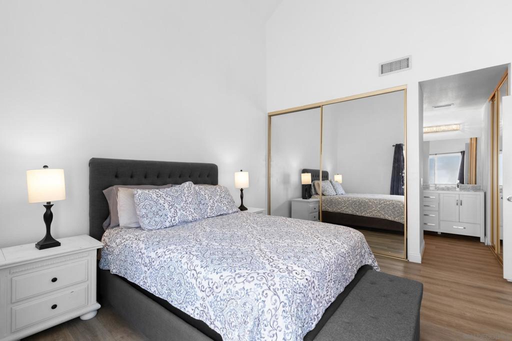 This stunning 2-bedroom, 2-bathroom corner unit in the highly sought-after Beacon community is a rare opportunity you won’t want to miss. With soaring vaulted ceilings throughout, this home offers an open, bright, and airy feel that is rarely found in similar units. The beautifully updated interior features luxury vinyl plank flooring, stainless steel appliances, recessed lighting, sleek modern finishes, and a cozy fireplace that creates the perfect focal point in the living room. The dining area is filled with natural light from large east-facing windows, making it the ideal place to start your morning. The expansive primary suite showcases dramatic vaulted ceilings, a spacious closet, and a luxury-style ensuite bathroom designed for comfort and relaxation. The second bedroom also features vaulted ceilings, adding to the home’s unique architectural charm. Step outside to your private balcony off the living room, perfect for summer BBQs, morning coffee, or relaxing evenings. Enjoy year-round comfort with central AC and heating. Additional conveniences include an attached garage with in-unit laundry, an assigned parking space located right next to the front door, and guest parking throughout the complex. The Beacon community offers resort-style amenities including a gated pool, spa/Jacuzzi, and beautifully maintained grassy common areas. Low HOA covers nearly everything except SDG&E, making this an incredible value. Move-in ready and truly a must-see!