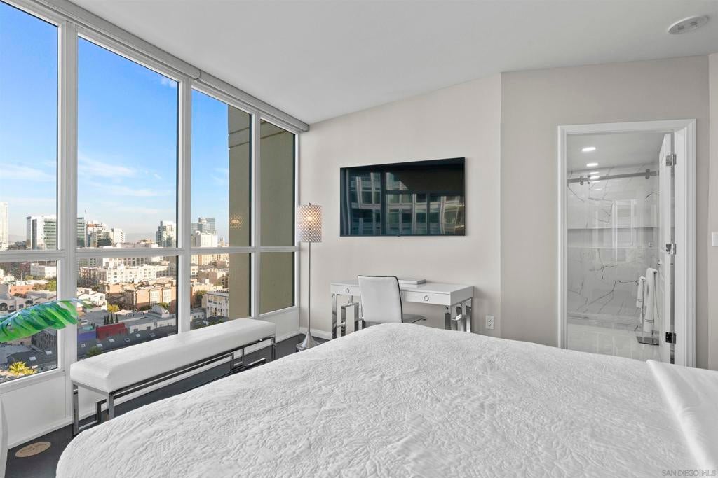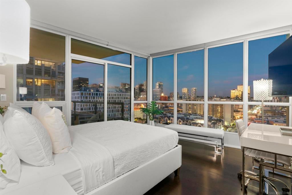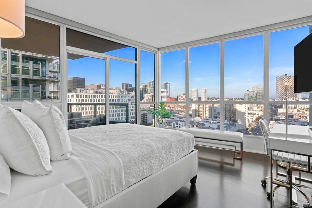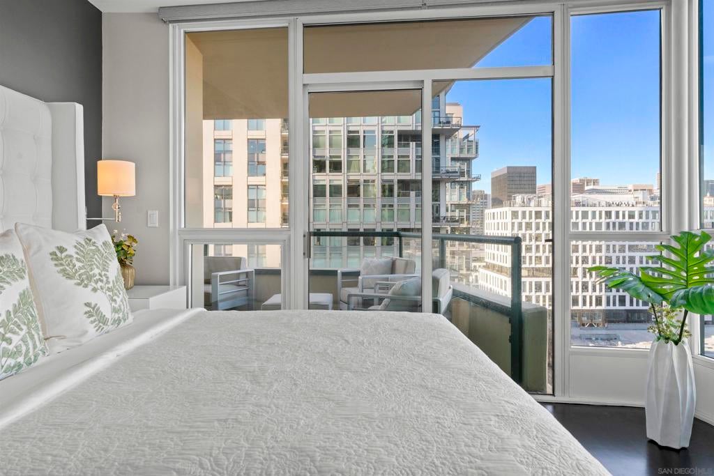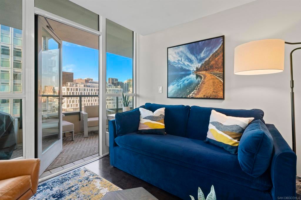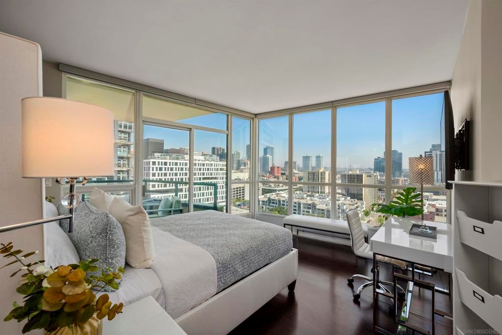 This beautiful, professionally designed one-bedroom plus Den, two-bath condo offers luxury, comfort, and stunning north-facing views of San Diego Bay and Downtown city skyline. Natural light fills the open living and dining areas, with large windows and a spacious patio to take in the scenery. The primary suite features floor-to-ceiling windows, generous closet space, built-ins, a workspace, patio access, and an ensuite bath with dual sinks and a walk-in shower. A versatile den off the living room - with direct patio access - functions as a cozy lounge by day and a guest bedroom with a queen sleeper sofa by night. Furnishings to be included in the purchase price at no additional cost to Buyer. Original cost of furnishings was approximately $30,000, with the majority sourced from Arhaus, Pottery Barn, and Crate & Barrel. All included items to be conveyed in their current condition at close of escrow. Ideally located in the heart of the Marina District, Horizons offers an unbeatable downtown lifestyle just steps from the New Children’s Museum, Martin Luther King Jr. Promenade, Seaport Village, Petco Park, the Gaslamp Quarter, San Diego Bay, and the Marina. A children’s park and dog park are located directly behind the community. Resort-style amenities include a pool, spa, BBQ area, fitness center, concierge, security, billiard room, conference and club rooms, and 16 guest parking spaces. Everyday convenience is built in with retailers just an elevator ride away, including a bank, dry cleaner, Postal Annex, coffee shop, and more. The building has been refreshed with beautifully remodeled lobbies, upgraded hallways, and new unit doors with keypad access, all within walking distance to transit, dining, shopping, and Ralphs Signature Market.
