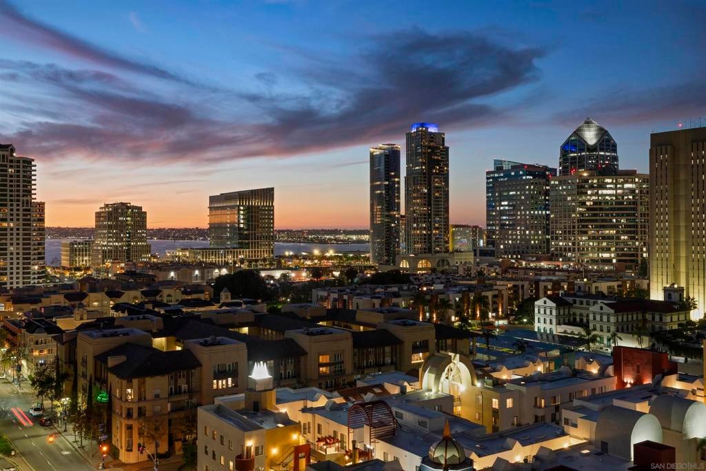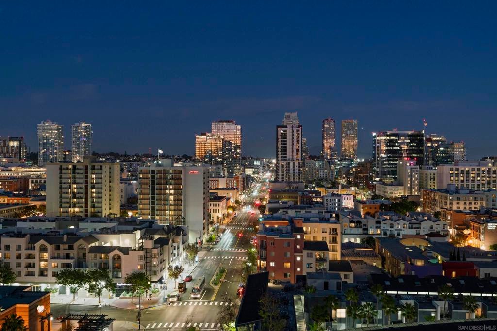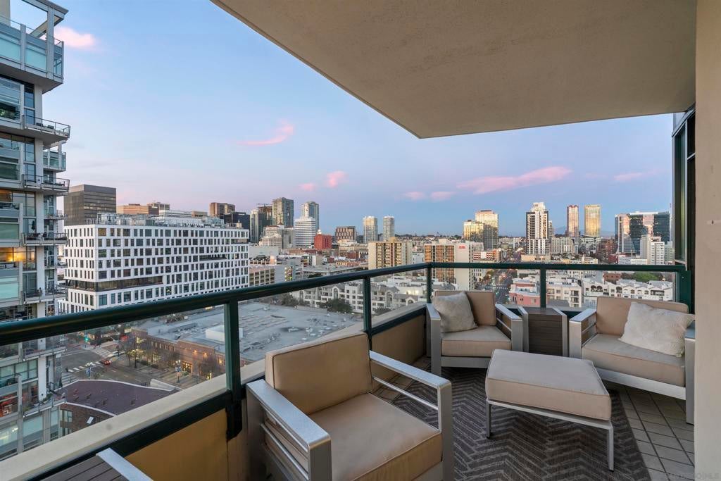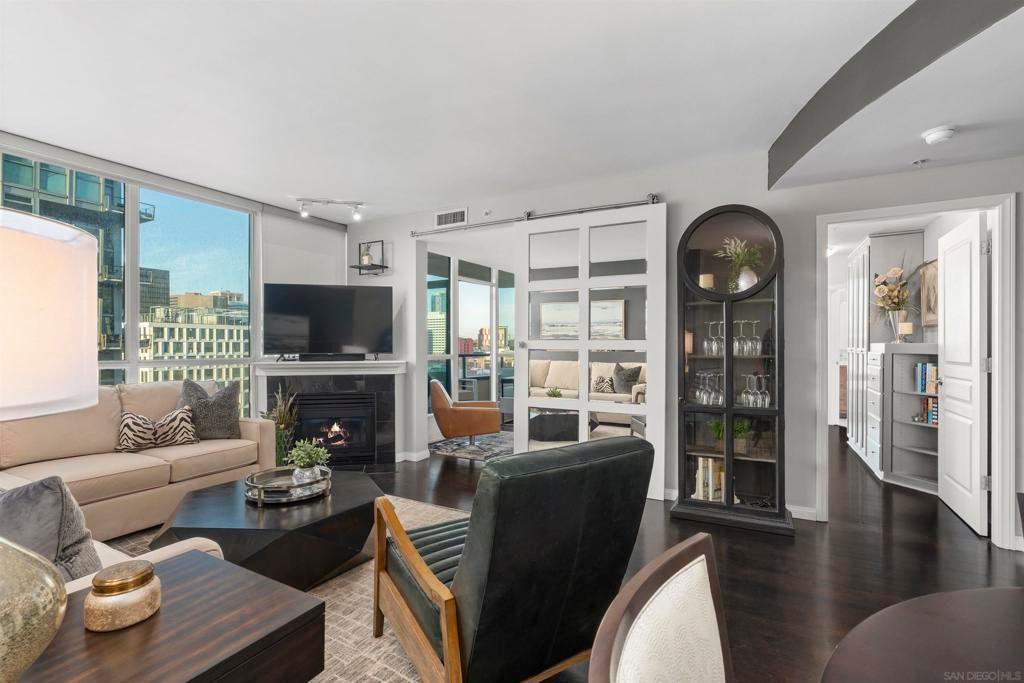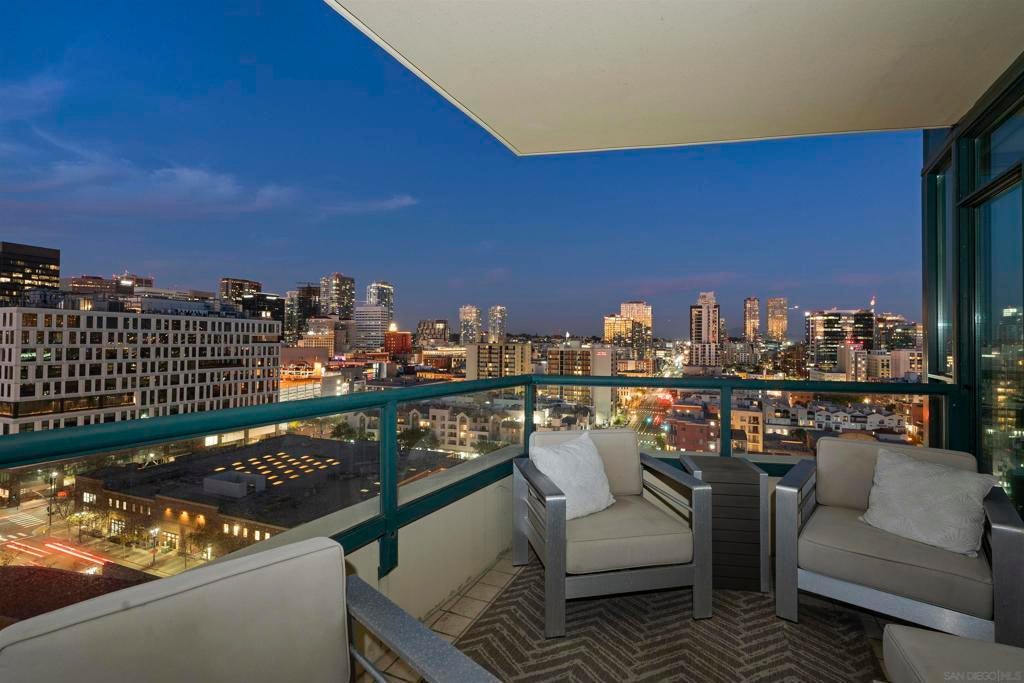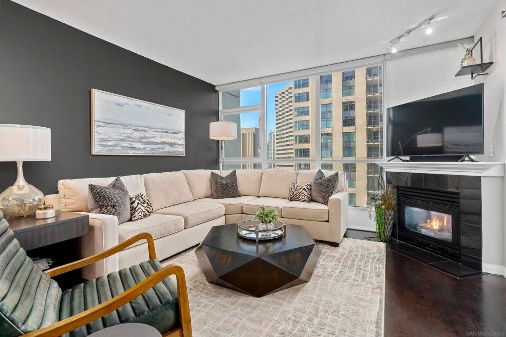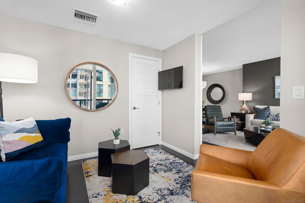 This beautiful, professionally designed one-bedroom plus Den, two-bath condo offers luxury, comfort, and stunning north-facing views of San Diego Bay and Downtown city skyline. Natural light fills the open living and dining areas, with large windows and a spacious patio to take in the scenery. The primary suite features floor-to-ceiling windows, generous closet space, built-ins, a workspace, patio access, and an ensuite bath with dual sinks and a walk-in shower. A versatile den off the living room - with direct patio access - functions as a cozy lounge by day and a guest bedroom with a queen sleeper sofa by night. Furnishings to be included in the purchase price at no additional cost to Buyer. Original cost of furnishings was approximately $30,000, with the majority sourced from Arhaus, Pottery Barn, and Crate & Barrel. All included items to be conveyed in their current condition at close of escrow. Ideally located in the heart of the Marina District, Horizons offers an unbeatable downtown lifestyle just steps from the New Children’s Museum, Martin Luther King Jr. Promenade, Seaport Village, Petco Park, the Gaslamp Quarter, San Diego Bay, and the Marina. A children’s park and dog park are located directly behind the community. Resort-style amenities include a pool, spa, BBQ area, fitness center, concierge, security, billiard room, conference and club rooms, and 16 guest parking spaces. Everyday convenience is built in with retailers just an elevator ride away, including a bank, dry cleaner, Postal Annex, coffee shop, and more. The building has been refreshed with beautifully remodeled lobbies, upgraded hallways, and new unit doors with keypad access, all within walking distance to transit, dining, shopping, and Ralphs Signature Market.