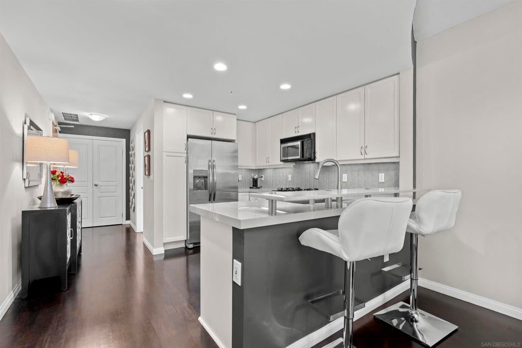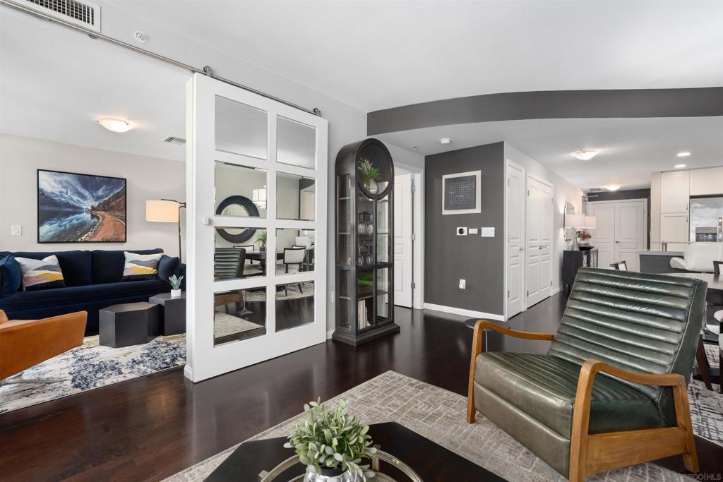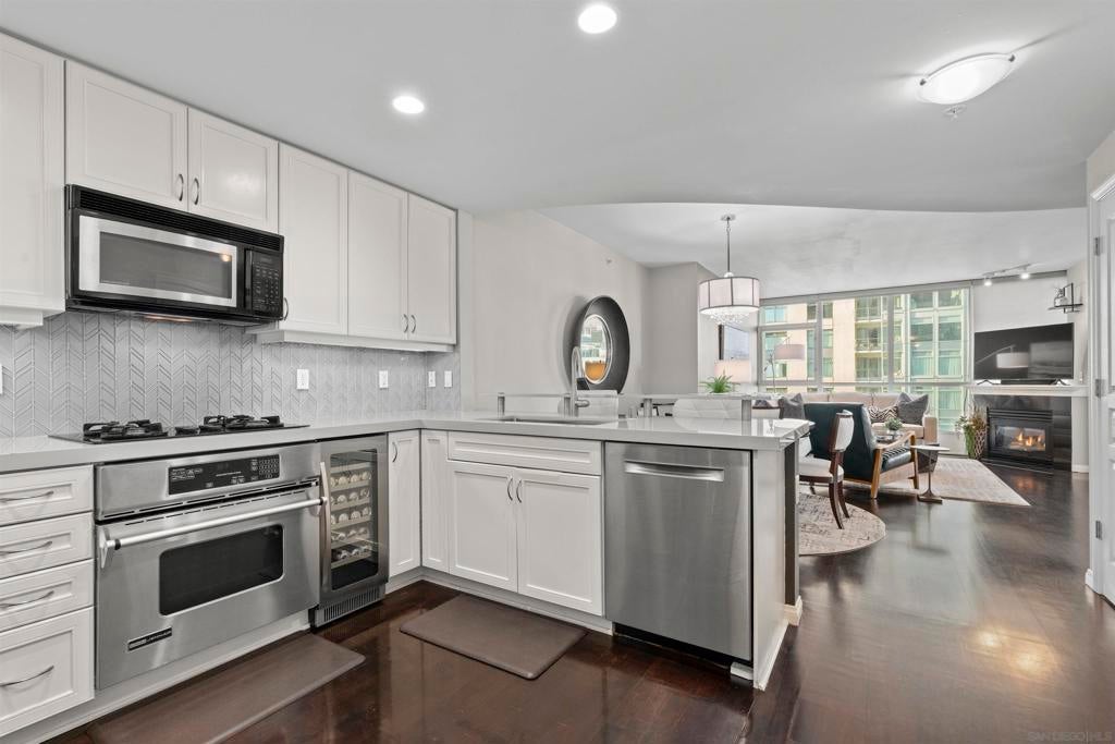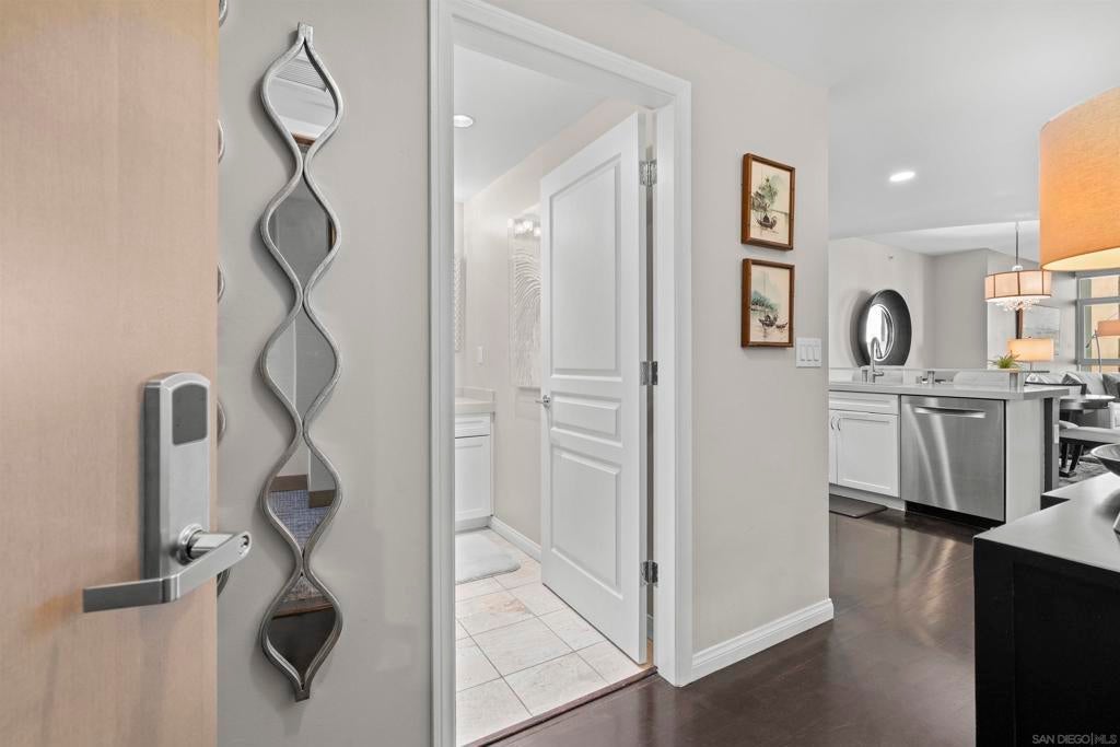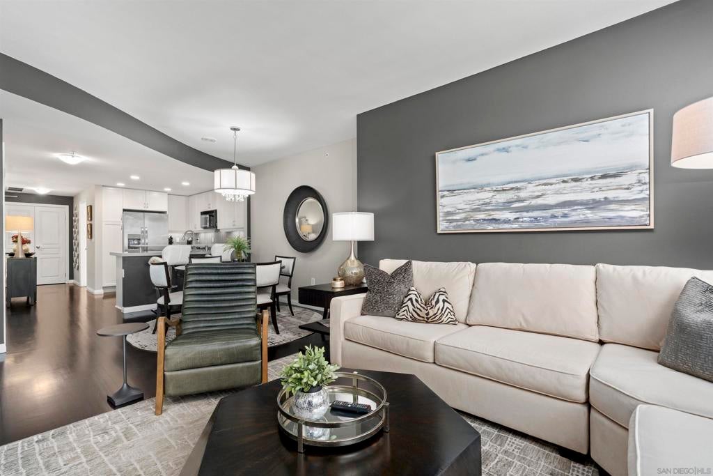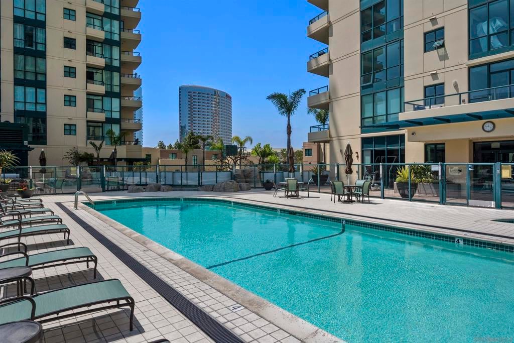 This beautiful, professionally designed one-bedroom plus Den, two-bath condo offers luxury, comfort, and stunning north-facing views of San Diego Bay and Downtown city skyline. Natural light fills the open living and dining areas, with large windows and a spacious patio to take in the scenery. The primary suite features floor-to-ceiling windows, generous closet space, built-ins, a workspace, patio access, and an ensuite bath with dual sinks and a walk-in shower. A versatile den off the living room - with direct patio access - functions as a cozy lounge by day and a guest bedroom with a queen sleeper sofa by night. Furnishings to be included in the purchase price at no additional cost to Buyer. Original cost of furnishings was approximately $30,000, with the majority sourced from Arhaus, Pottery Barn, and Crate & Barrel. All included items to be conveyed in their current condition at close of escrow. Ideally located in the heart of the Marina District, Horizons offers an unbeatable downtown lifestyle just steps from the New Children’s Museum, Martin Luther King Jr. Promenade, Seaport Village, Petco Park, the Gaslamp Quarter, San Diego Bay, and the Marina. A children’s park and dog park are located directly behind the community. Resort-style amenities include a pool, spa, BBQ area, fitness center, concierge, security, billiard room, conference and club rooms, and 16 guest parking spaces. Everyday convenience is built in with retailers just an elevator ride away, including a bank, dry cleaner, Postal Annex, coffee shop, and more. The building has been refreshed with beautifully remodeled lobbies, upgraded hallways, and new unit doors with keypad access, all within walking distance to transit, dining, shopping, and Ralphs Signature Market.