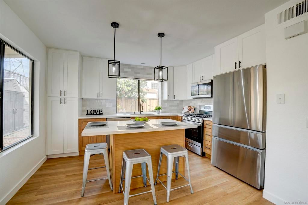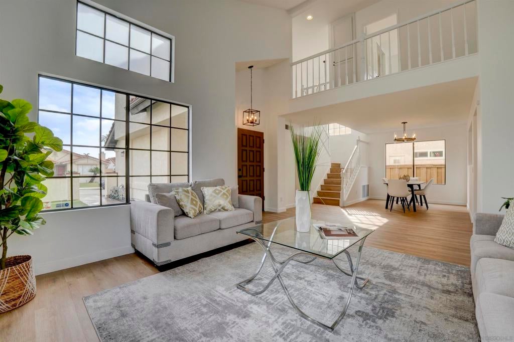 Welcome to this beautifully upgraded Mira Mesa home. Inside you will find high vaulted ceilings paired with seamless modern finishes. Upgrades include: New vinyl flooring, custom kitchen cabinetry, stainless steel appliances, farmhouse sink, and designer kitchen tile backsplash. The home boasts two main living spaces each with a cozy fireplace. Enjoy the convenient location just minutes from the community park, multiple shopping center's, and a short 10 minute drive to the beach. This is a must see!