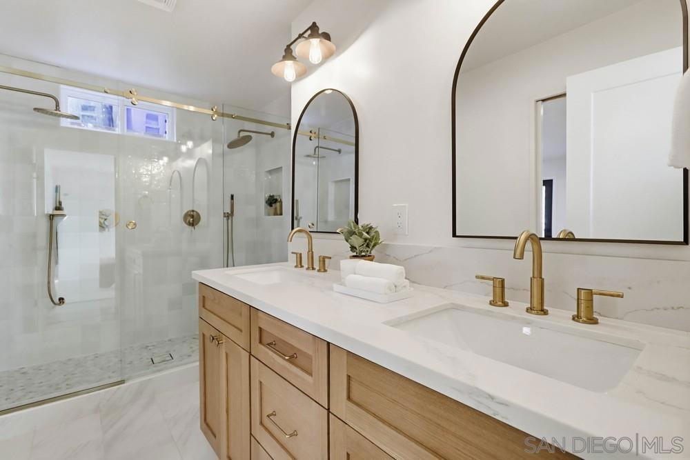 Beautiful 3 bed 2 bath home plus 728 sf 1 bed 1 bath ADU on a large parklike lot in University Heights with development potential! This beautifully designed home on a quiet dead end street feels like you are living in Balboa Park. The home features a spacious light filled living area with large open concept kitchen with island, pantry, and spacious dining room all opening to a large back deck overlooking the grounds. Additional features include quartz counters, all wood cabinets, professional grade appliances, a spacious primary suite with huge walk in closet and en-suite bathroom, low flow plumbing fixtures, LED lights, and spa like bathrooms. The large 1 bedroom unit below with it's own entrance is the perfect income property a high demand area, guest home or in-laws suite with it's own patio, walk in closet, and large kitchen. The icing on the cake is the large terraced backyard that make for the perfect garden or possibly potential for development of future units! A truly rare property!