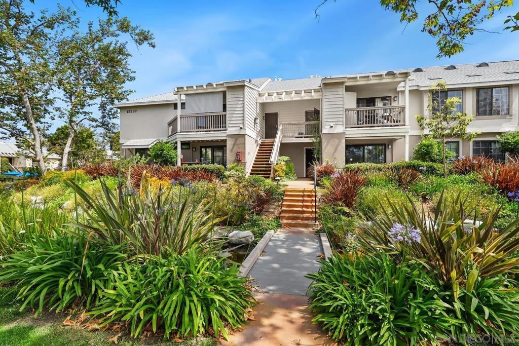 Welcome to The Lakes in Carmel Valley! This exquisite top-floor corner unit is a rare gem. Boasting tall, vaulted ceilings and two skylights, the living spaces are bathed in natural light, creating an airy and inviting atmosphere. The kitchen and bathrooms have been updated, providing both style and functionality. The versatile loft space presents the perfect opportunity for an optional third bedroom, office, or creative studio to suit your lifestyle needs. Enjoy your morning coffee or unwind in the evenings on the charming balcony off the living room, with serene views of water features that run throughout the neighborhood and pool enhancing your relaxation. For added convenience, this home includes an in-unit washer and dryer, making laundry days a breeze. The Lakes Community offers an array of amenities to enrich your living experience. Take advantage of the tennis courts, cool off in the sparkling pool, relax in the soothing spa, host gatherings at the BBQ area, or socialize in the clubhouse. With Top Awarded Schools, being one mile to the beach and a block from One Paseo and Del Mar Highlands, you will not want to miss out on this exceptional opportunity to own a piece of paradise in Carmel Valley.