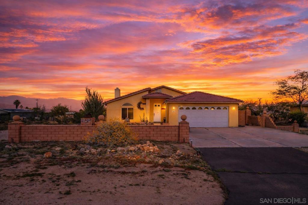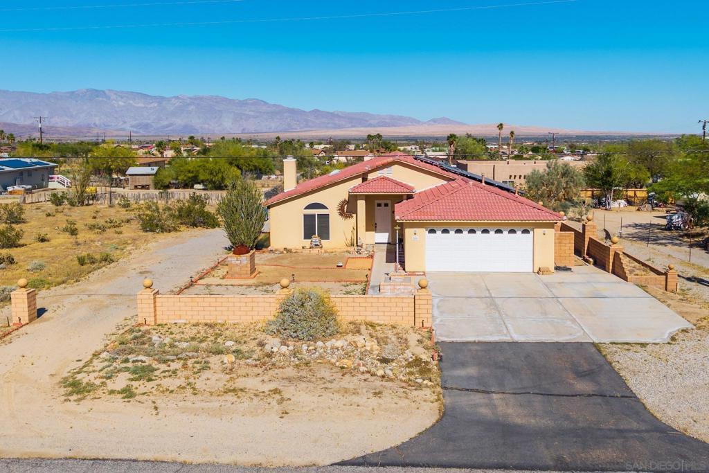 PRICE JUST REDUCED, PRICED TO SELL at $349,000!!! Hurry, won't last! Wake up to breathtaking mountain views and the quiet beauty of desert living in this inviting Borrego Springs retreat. Step inside to a warm, inviting living space with a cozy fireplace and abundant natural light. A seamless blend of wood, laminate, and tile flooring runs throughout, offering both style and durability. The bright kitchen features granite countertops, maple-toned cabinetry with classic recessed-panel detailing, and two skylights that flood the space with natural light while framing the desert landscape. Vaulted ceilings enhance the open feel, and the thoughtful layout includes an eat-in kitchen, indoor laundry, and a two-car garage with storage. Leased solar at just $125/month adds energy efficiency and value. The expansive property offers room for RV parking, off-road vehicles, or desert toys—perfect for embracing the outdoor lifestyle. Custom block walls add charm and definition to the outdoor space. The septic system has just been pumped, inspected, and certified, offering added peace of mind. Located in a Certified International Dark Sky Community near Christmas Circle, shops, dining, hiking, and Anza-Borrego Desert State Park. No HOA offers flexibility and opportunity in this unique desert setting.