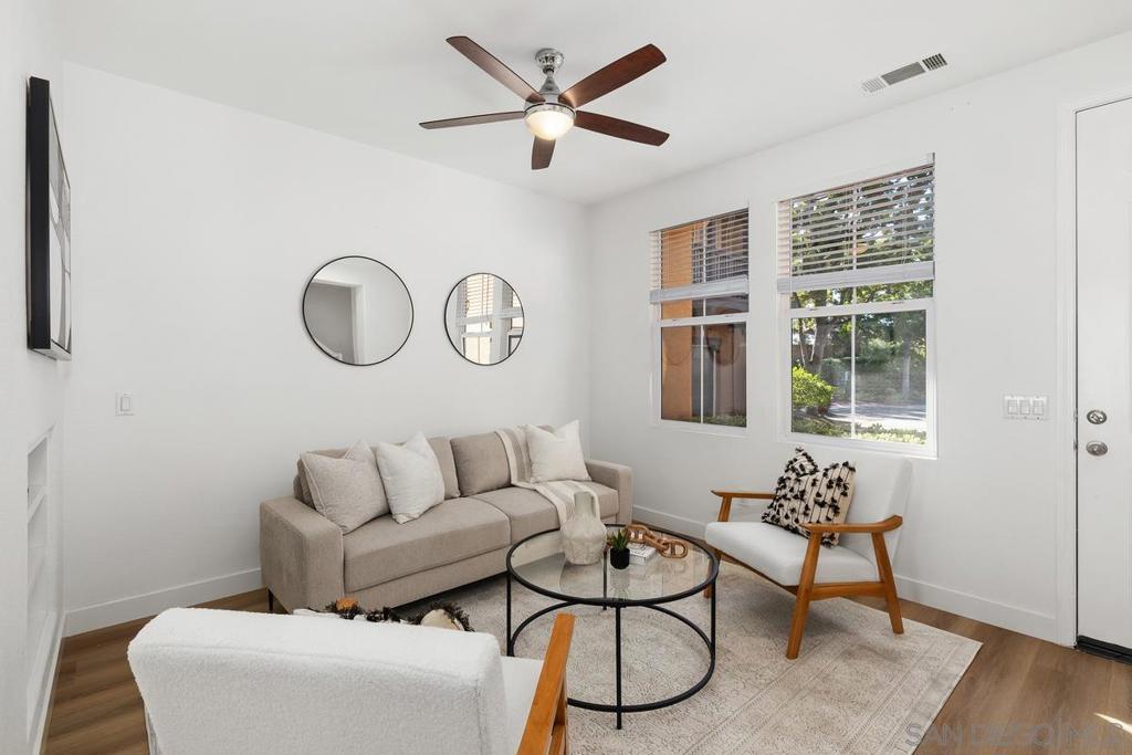 Experience a stylish, remodeled townhome with dual primary suites in the Monaco community of Torrey Highlands. Inside, luxury vinyl plank flooring flows throughout, complemented by ceiling fans in every room. The updated kitchen features quartz countertops and stainless steel appliances, while refreshed bathrooms modern fixtures. With no neighbors behind, enjoy a private yard with pavers and turf—perfect for relaxing or entertaining. Close to freeways, top schools, shops, and dining, this home blends comfort and convenience.