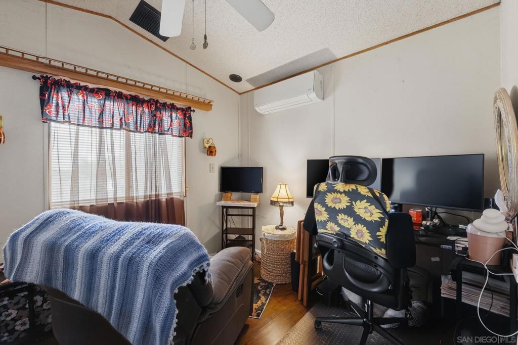 Charming 1 bedroom, 1 bath home in the peaceful 55+ Canyon Ridge Estates community, surrounded by rolling green hills and open countryside yet just moments to Hwy 67, shopping, and dining in Ramona. (Space Rent $1135) This lovingly cared-for home sits on a beautifully landscaped space with brick-paver walkways, trellised greenery, and multiple intimate patios that create a surprisingly private outdoor oasis for morning coffee, gardening, and entertaining. Step inside to an inviting, light-filled living area with vaulted ceilings, neutral walls, and wood-look flooring that flows into the dining nook and efficient kitchen. The kitchen offers warm wood cabinetry, ample counter space, a gas range, built-in microwave, and double sink, with a convenient breakfast bar for casual meals or extra prep space. A custom built-in hutch and cozy window seat niche add character and extra storage, making the most of the compact footprint.