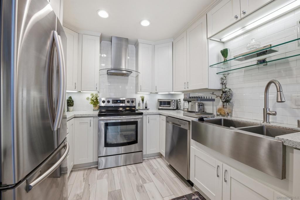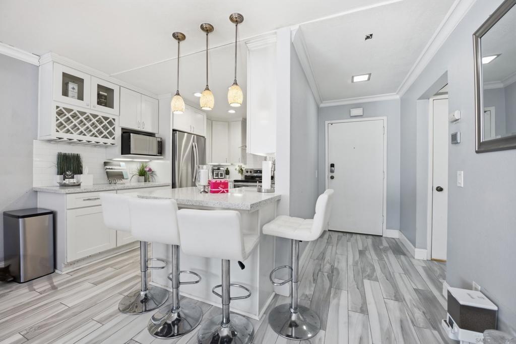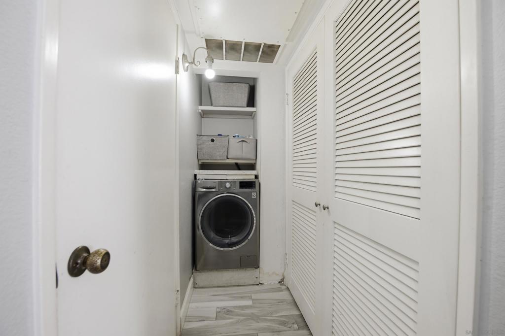 Rare CORNER unit, in a “No freeway noise location” of the complex! Best and quietest location. Welcome to the VERY sought-after Mission Ridge community of Mission Valley! (Visit Virtual Tour). This beautifully upgraded 1 bed, 1.5 bath condo is filled with natural light and enhanced privacy. The open living space features laminate wood flooring, quartz kitchen countertops, stainless steel appliances, and elegant rhinestone cabinet handles. The balcony has been fully enclosed in order to expand the Master bedroom, creating one of the largest bedrooms in the entire complex. Enjoy in-unit laundry, central air and heat, and resort-style amenities including an Olympic-size pool, spa, tennis courts, gym, racquetball, dog park, and clubhouse—all minutes from shopping, dining, parks, and freeways. Corner unit comes with 1 assigned parking space in carport with storage and 1 additional parking pass for guests. HOA includes trash and water! The complex has undergone resurfaced streets and new exterior painting, with the added convenience of Amazon secure delivery cubbies in the lobby of each building. The meticulously maintained grounds feature trimmed trees, ample guest parking, and no special assessments. Close proximity to shopping, nearby restaurants, 24 Hr fitness, Snapdragon Stadium, upcoming SDSU West, Mission Valley and the trolley make this location unbeatable. On-site amenities include a gym, rec room, and gas (for fireplace only), and water & trash paid by HOA. Don't miss out on this incredible opportunity for comfortable and convenient living.