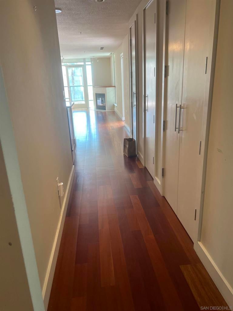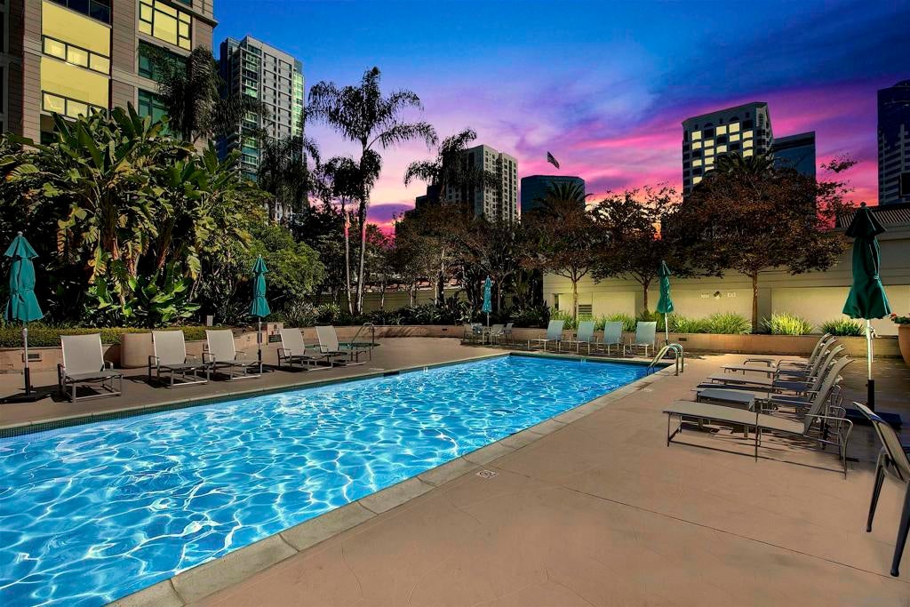 GRAND SOUTH ! Truly one of the finest addresses to call home Downtown. Very spacious 1 bedroom 1, 1/2 bath, 2 huge patios, over-sized parking space large enough for auto & golf cart or? Very rare floor plan (only 2 exist) w/ approximately 1,100 square feet facing West (great natural light) w/ peek views of harbor. The Grande has all amenities one would be looking for, lap pool located on South side of building (great sunlight all day), spa, steam room, sauna, fabulous fitness center, fire pits, BBQ area, 24 hour security, concierge, guest suite, 4 elevators (not much wait time) community room for private parties equipped w/ full kitchen, TV, beautifully furnished. Life at The Grande is the finest living in San Diego Larger than the typical 1 bedroom in The Grande. Live in a premier building with premium amenities just a few blocks from Little Italy. Enjoy the open layout, large Terraces, triple pane floor-to-ceiling windows, GAS fireplace and more. Reserved underground parking space. Building amenities include concierge, gym, swimming pool, Spa, sauna, steam room and a 1 BR private Suite rental available for your out of town guests. Available by APRIL 1, 2026