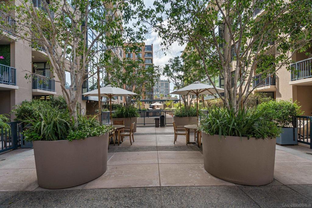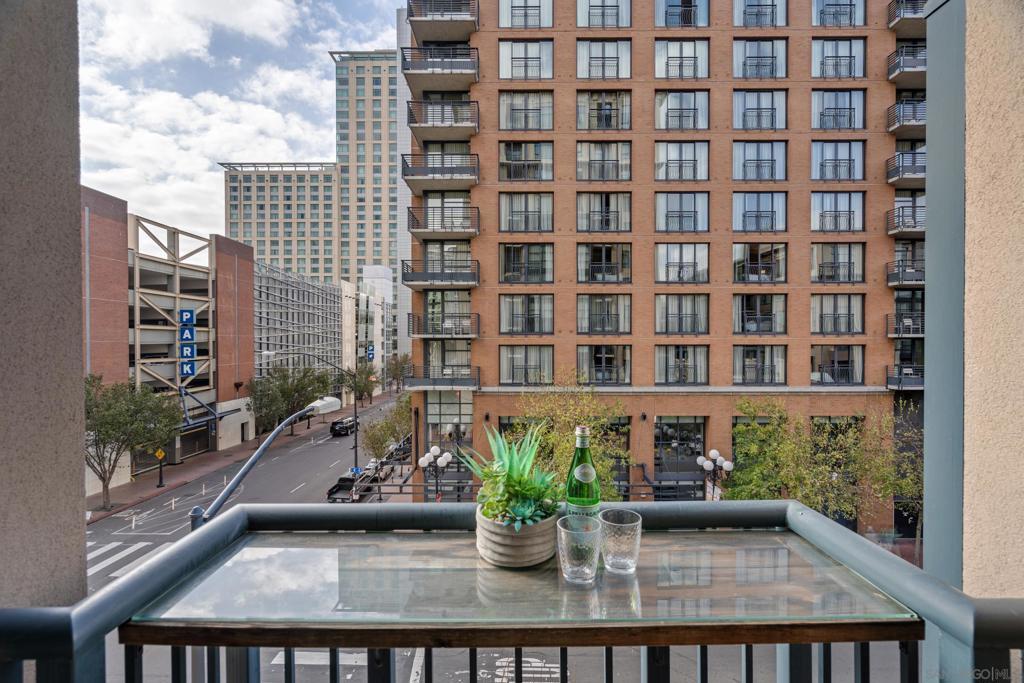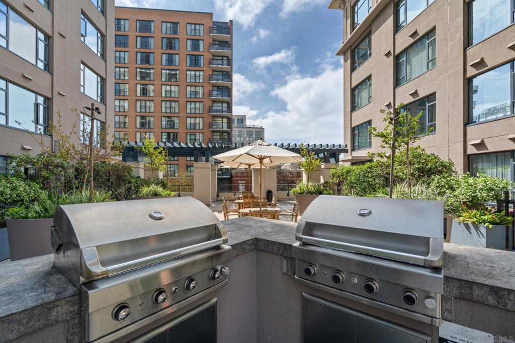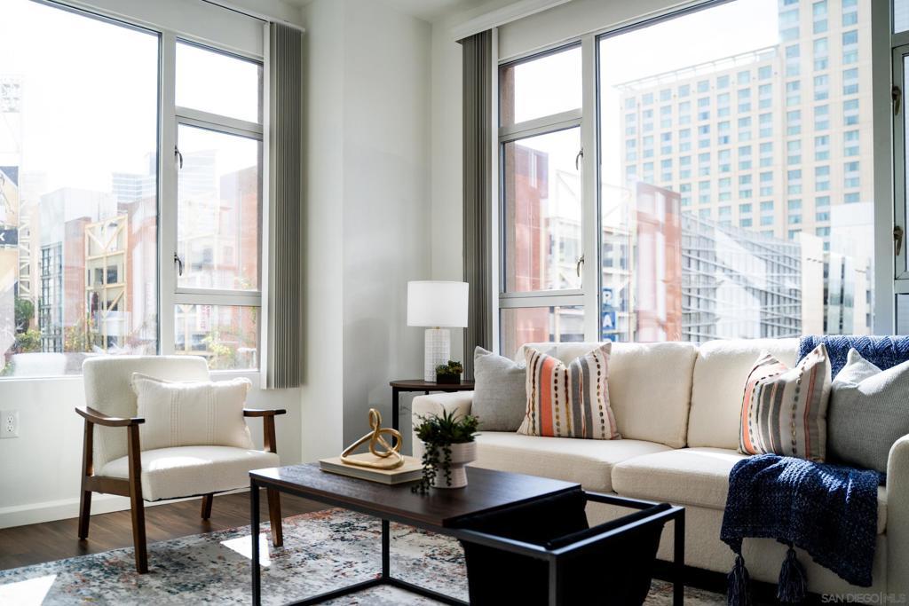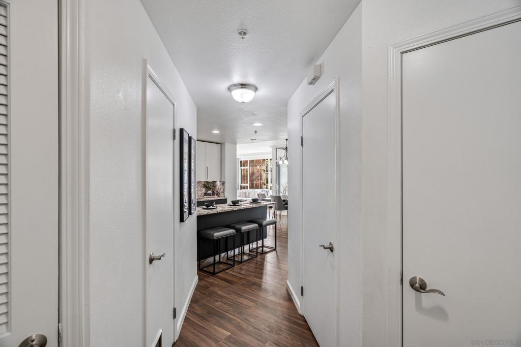 Experience a sophisticated and effortless downtown lifestyle from this perfectly positioned southeast corner residence, where abundant natural light and thoughtful design create the ideal lock-and-leave urban retreat. This exceptional two-bedroom condo with a desirable split floor plan & two parking spaces (side-by-side) offers both privacy and functionality while showcasing stylish, desirable upgrades throughout. Step through the entryway into an open-concept living space featuring views of Petco Park and the iconic right-field jumbotron, creating a dynamic downtown backdrop. The reimagined gourmet kitchen impresses with a newly added island and pantry, luxurious granite countertops with a full-height backsplash, and a suite of upgraded appliances, including a ZLINE range for coveted gas cooking, dishwasher, microwave hood, and refrigerator—perfect for both casual dining and effortless entertaining. The serene primary suite features custom built-in closets and a beautifully renovated bathroom showcasing large-format tile, an elegant Carrera marble vanity, and an oversized mirrored medicine cabinet. The guest bathroom has also been fully remodeled, offering matching finishes and contemporary design. Additional highlights include luxury vinyl flooring throughout, designer paint, custom built-in closets in both bedrooms, two hallway closets with integrated shelving, and a thoughtfully designed layout that maximizes both comfort and livability. Modern urban comforts include in-unit laundry and, providing both convenience and functionality. Trellis is a VA-approved community offering exceptional amenities, including weekend evening security, a fully equipped fitness center, rooftop BBQ terraces on the second floor, an interior courtyard seating with a tranquil water feature, Amazon package lockers, a community information display, and a sleek modern lobby entrance. Residents enjoy a prime downtown location close to Petco Park, Gallagher Square, the historic Gaslamp Quarter archway, renowned dining and shopping, bus and trolley transportation, the new Children’s and Dog Park, and the Harbor Drive Pedestrian Bridge, which connects to The Rady Shell, the Convention Center, Seaport Village, Embarcadero Parks, the Coronado Ferry Landing, and San Diego Bay. The very best of the city is just moments from home.