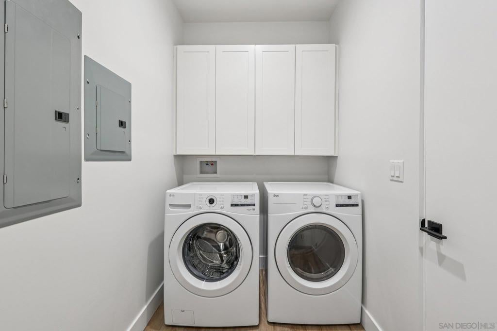 NEW CONSTRUCTION!! Beautiful Bay Park "Beach Chic" Home featuring panoramic views, warm contemporary styling, and a detached 1BR/1BA ADU! Welcome to this stunning residence blending luxury, comfort, versatility, and spectacular views. Perched in a premier location, the expansive rooftop deck showcases sweeping vistas from USD, Point Loma, the Bay and Ocean, all the way to Mount Soledad—an entertainer’s dream. The primary suite is a true retreat, featuring a spacious walk-in closet, sunset-focused patio, spa-like soaking tub, and oversized shower. Upstairs also offers three additional bedrooms, including another with its own en-suite bath, plus a generous laundry room. At the heart of the home, the chef’s kitchen shines with a 48" Z-line cooktop and double oven dual refrigerators, walk-in pantry, warm wood grain cabinetry, wine fridge, and large quartz waterfall island. Accordion doors off the living and dining areas seamlessly blend indoor and outdoor covered patio space and the private backyard. Added perks include soft-close cabinets, wine fridge, epoxy garage floors, OWNED SOLAR, 10' ceilings, boat and RV parking, and a spacious open plan. This home offers rare indoor-outdoor living, upscale amenities, detached ADU income potential, and panoramic San Diego views—truly the perfect place to call home. Total square footage reflects 2730 sq ft 4 bed 3.5 bath main home + 480 square foot 1 bed 1 ba ADU.