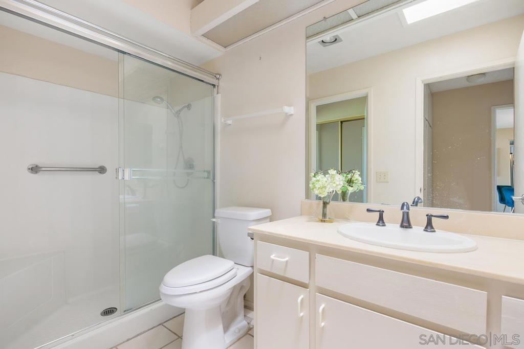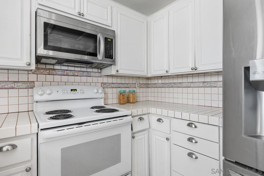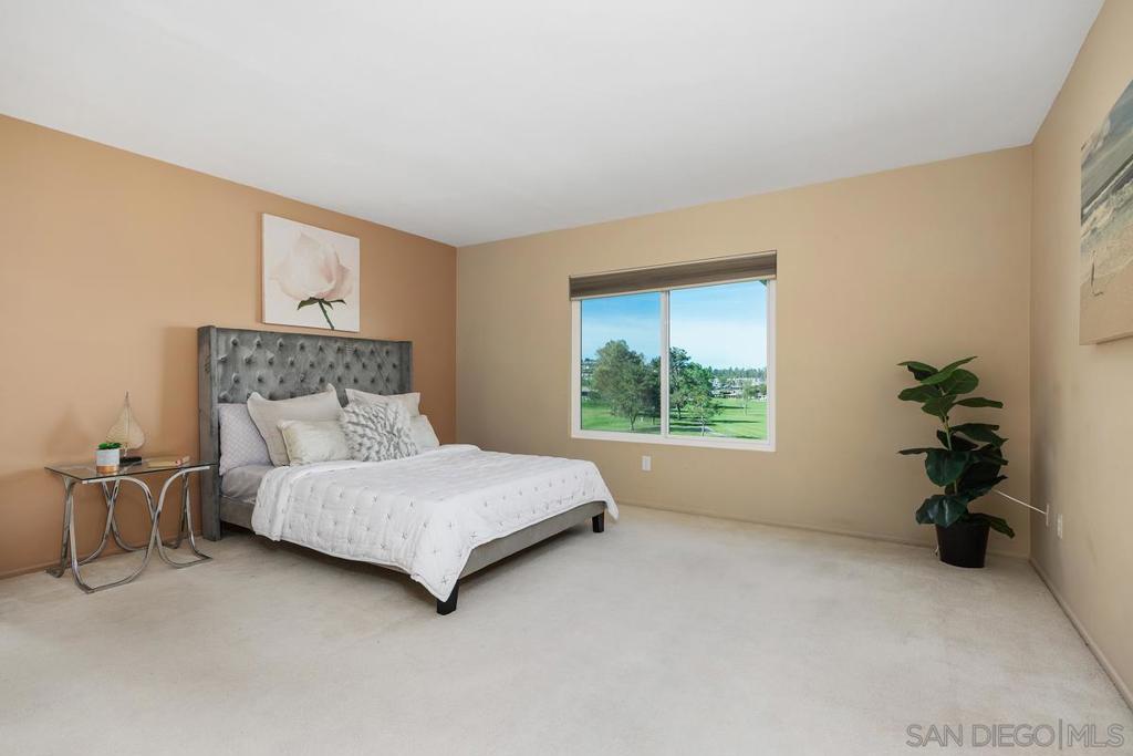 Enjoy stunning views of the San Marcos mountain peaks and golf course from this desirable unit in Fairway Knolls. This 3 bedroom, 2 bath second-floor home features vaulted ceilings, newer windows and sliding doors, newer AC, and newer stainless steel fridge and microwave. The spacious living room is centered around a charming fireplace with a wooden mantel, creating a warm and inviting living space. The oversized covered patio with vaulted ceiling provides the perfect setting for relaxing or entertaining year-round. Convenient in-unit laundry is located on the back patio. HOA special assessment has been fully paid. HOA fees include water, trash, cable TV, high-speed internet, roof maintenance, and exterior building maintenance. Community amenities include pool, tennis courts, and clubhouse. Assigned covered parking with storage is located directly across from the unit entry. Ideally located near all that Lake San Marcos has to offer, including golf courses, restaurants, fishing, water activities, shopping, schools, and easy freeway access.