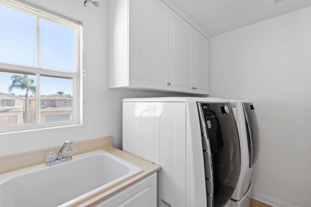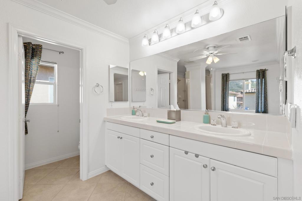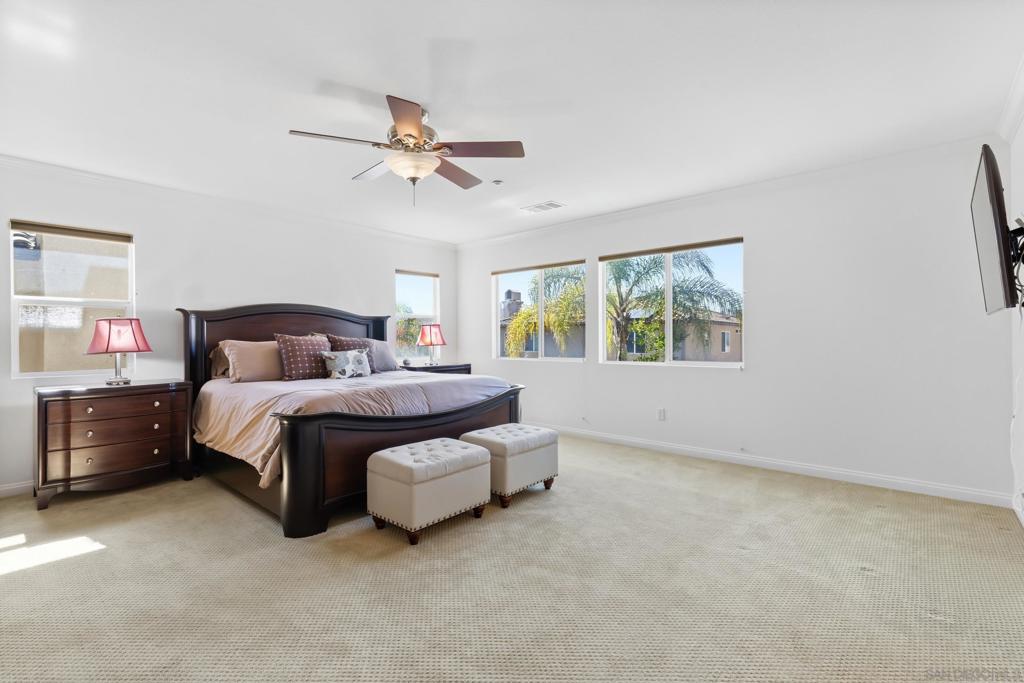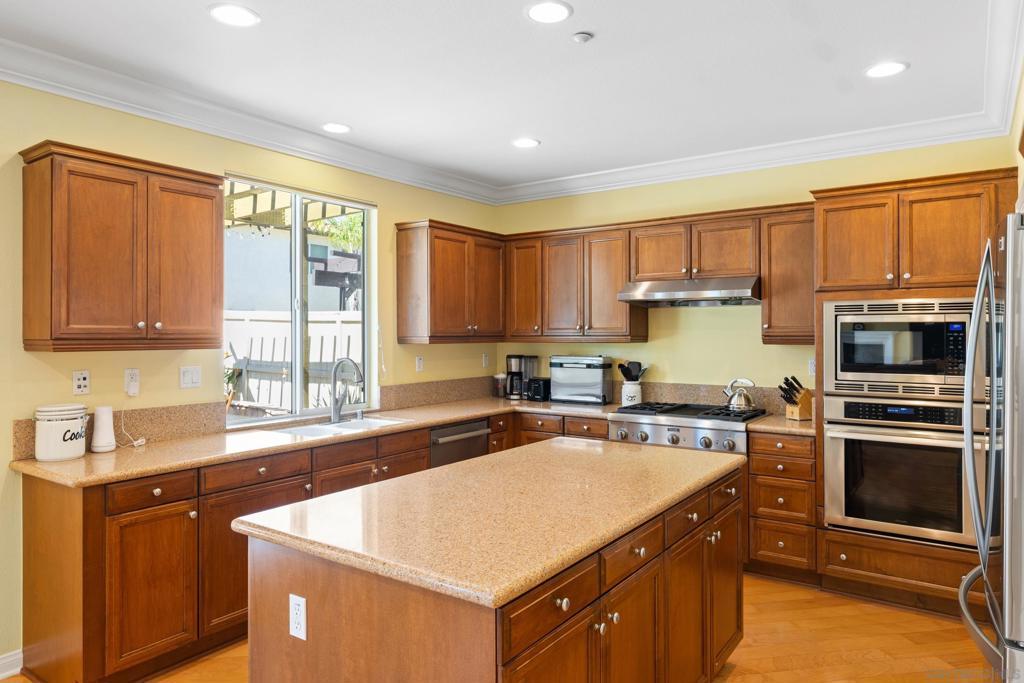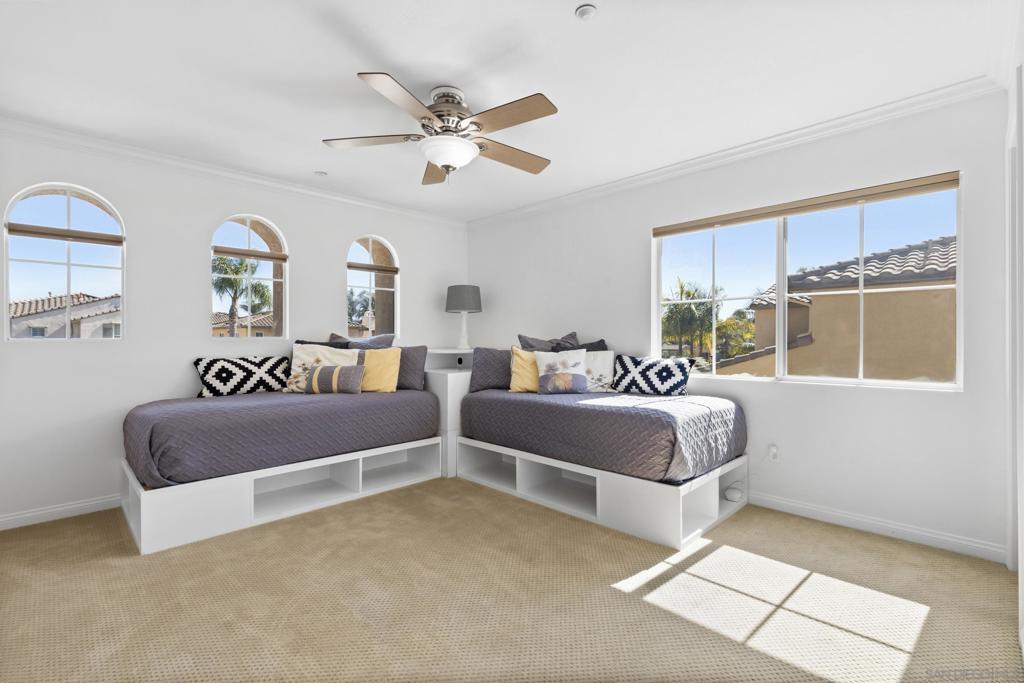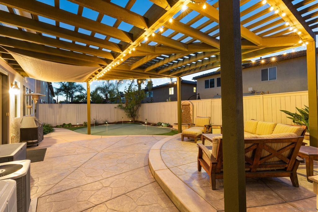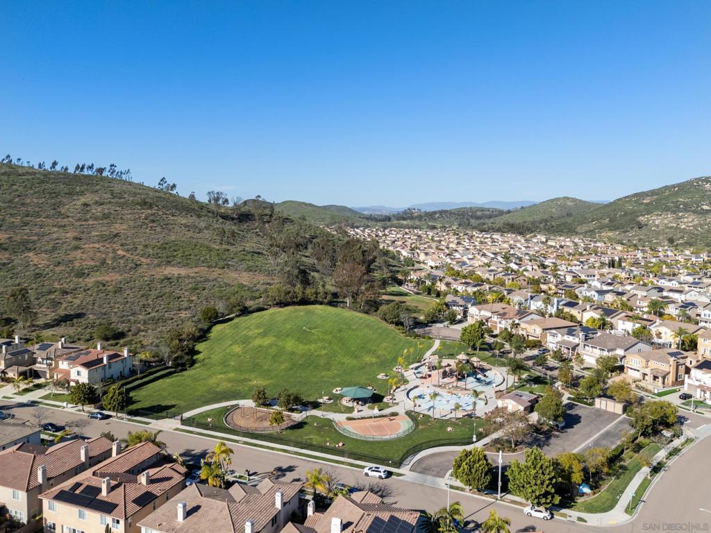 Located in a highly sought-after 4S Ranch neighborhood within the award-winning Poway Unified School District, this upgraded home features owned solar, a highly desirable floor plan, and seamless indoor-outdoor living. The interior showcases 9-foot ceilings downstairs with 8-inch crown molding and engineered pecan wood flooring installed on a diagonal. The downstairs family room offers a cozy fireplace and opens to the chef’s kitchen featuring stainless Thermador appliances, a large center island with Silestone countertops, walk-in pantry, and breakfast area with French doors opening to the backyard. The backyard features beautiful hardscaping, pergola-covered patio, tranquil fountain, and putting green ideal for outdoor living and entertaining. A charming interior courtyard off the dining room provides an additional private outdoor retreat. Upstairs, the primary suite offers crown molding, two walk-in closets, and a spa bath with dual vanities, soaking tub, and large walk-in shower. One secondary bedroom is ensuite, ideal for guests. Additional features include dual-zone AC, custom window treatments, French doors with built-in blinds, ceiling fans, fire sprinklers, upstairs laundry with sink and hanging bar, and a three-car tandem garage. Ideally located near parks, shopping, restaurants, library, hiking trails, and Pioneer Park offering expansive green space, basketball courts, and a splash pad. Exceptional 4S Ranch location within the award-winning Poway Unified School District, this beautifully upgraded home offers owned solar for energy efficiency and cost savings, a highly desirable floor plan, elegant finishes, and outstanding walkability to parks, shopping, restaurants, and community amenities. The spacious interior features soaring 9-foot ceilings downstairs with impressive 8-inch crown molding and engineered pecan wood flooring installed on a diagonal. The downstairs family room offers a warm and inviting fireplace and flows seamlessly into the chef’s kitchen showcasing stainless Thermador appliances, a large center island with Silestone countertops, a generous walk-in pantry, and a spacious breakfast area with French doors opening to the backyard. A downstairs bonus living room overlooking the charming interior courtyard makes an ideal work-from-home office. The beautifully designed backyard features gorgeous hardscaping, a pergola covered patio, tranquil fountain, and putting green creating an ideal setting for outdoor living and entertaining. The home also offers a charming interior courtyard off the dining room providing an additional private outdoor retreat. Upstairs, the very large primary suite features crown molding, two walk-in closets, and a spa-inspired bath with dual vanities, soaking tub, and large walk-in shower. One secondary bedroom is ensuite, offering excellent flexibility for guests or family members. Additional features include dual-zone air conditioning, custom window treatments throughout, French doors with built-in blinds within the glass, ceiling fans, built-in fire sprinklers, an upstairs laundry room with sink and hanging bar, and a three-car tandem garage. Ideally located near nearby hiking trails and Pioneer Park offering expansive green space, basketball courts, and a splash pad.