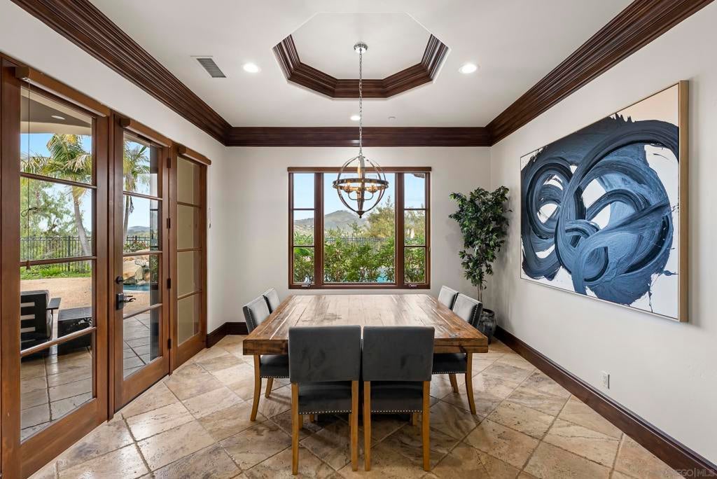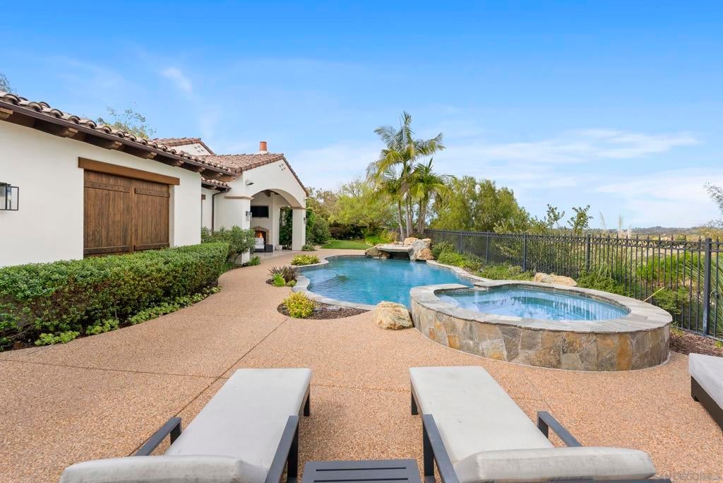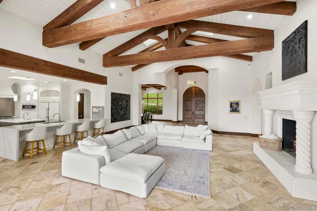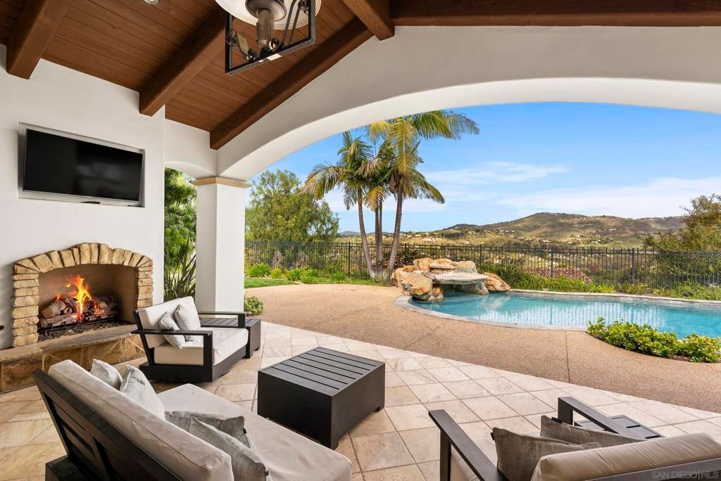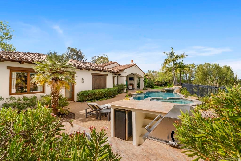 Stunning single-level home with spectacular panoramic views located in the guard gated community of The Crosby at Rancho Santa Fe. Spanning approximately 6,085 square feet, this custom-designed home features 4 bedrooms plus a dedicated office, soaring ceilings, and an abundance of natural light throughout. Upon entry, beautiful exposed wood beams immediately capture your attention, setting the tone for the home’s elegant design. The custom built-in office provides the perfect space for work or study. An expansive open-concept living room with fireplace flows seamlessly into the informal dining area and gourmet kitchen. The chef’s kitchen is outfitted with premium stainless-steel appliances, generous counter space, and a large island, making it ideal for both everyday living and entertaining. The home also features a private movie room for the ultimate entertainment experience. Each bedroom is ensuite, offering comfort and privacy. The spacious primary suite features soaring ceilings and a beautifully remodeled, light-filled bathroom complete with dual vanities, a large floating soaking tub, two water closets, and dual walk-in closets. Step outside to enjoy the expansive backyard with lush grass areas, a large pool and spa, and a fully equipped outdoor BBQ area—perfect for entertaining while taking in the amazing views. The family room opens to a covered outdoor living space with fireplace and seating, creating seamless indoor-outdoor living. Additional features include a 4-car garage and a prime location close to freeways, shopping, restaurants, and top-rated schools.